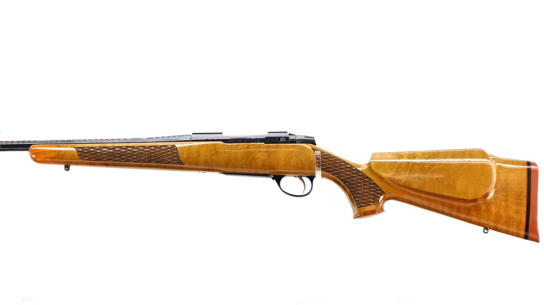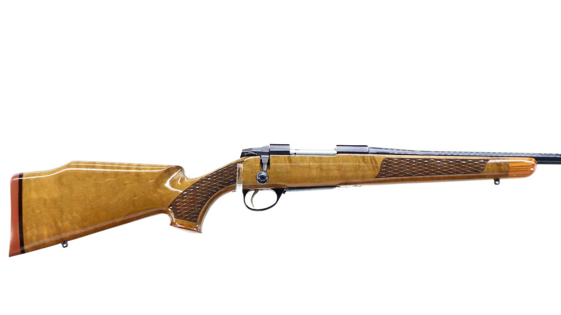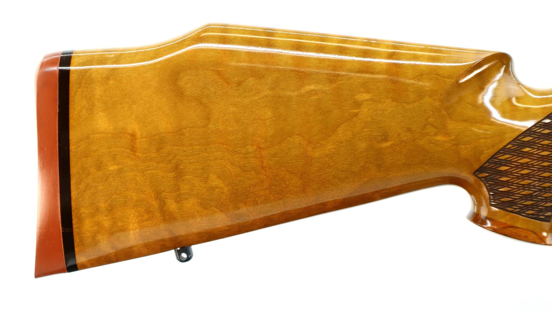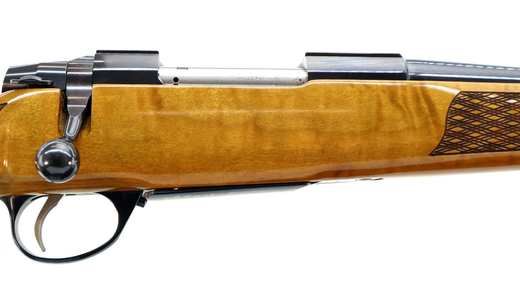 Main Description: Manufactured Mid 1990's. No sights, polish blued finish, tapered round barrel, receiver has integral scope bases, smooth bolt knob. Rare one piece gloss finish tiger colour / pattern wood stock, rosewood forend and pistol grip caps, checkered forearm and pistol grip with right hand palm swell, cheek rest, brown rubber recoil pad, engraved steel hinged floor plate and trigger guard, swivel studs.