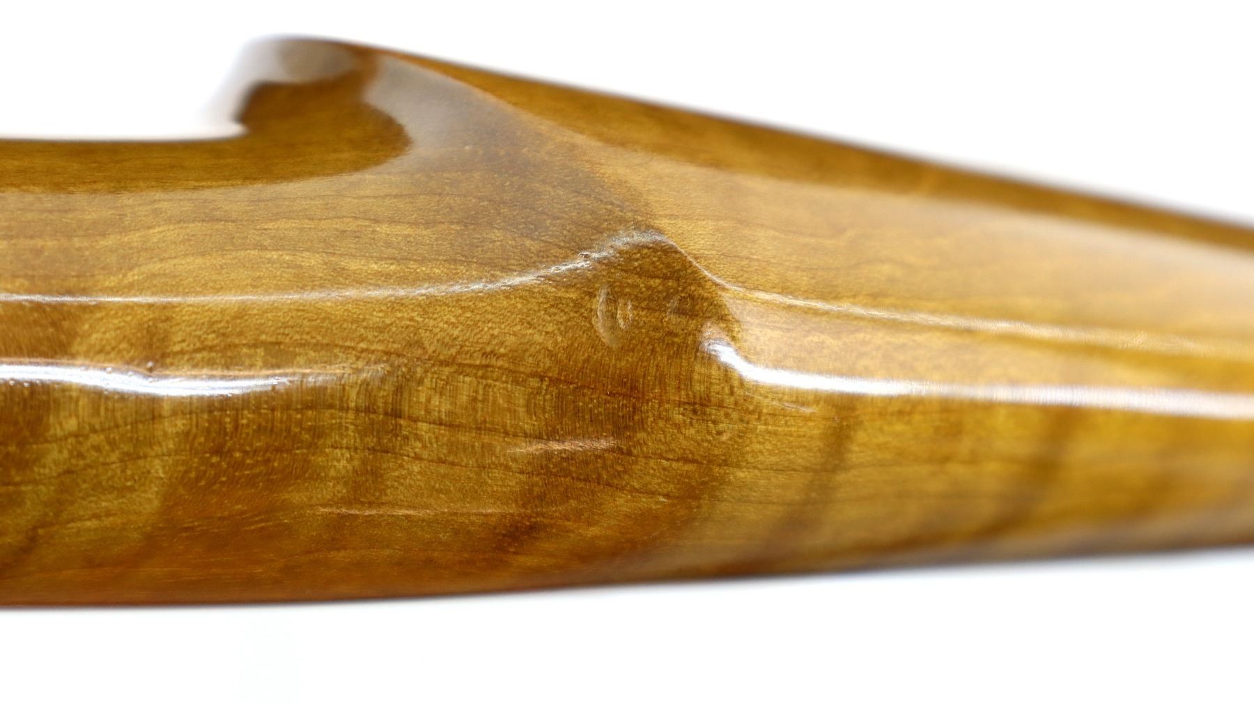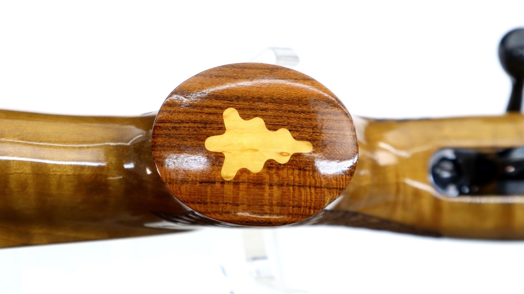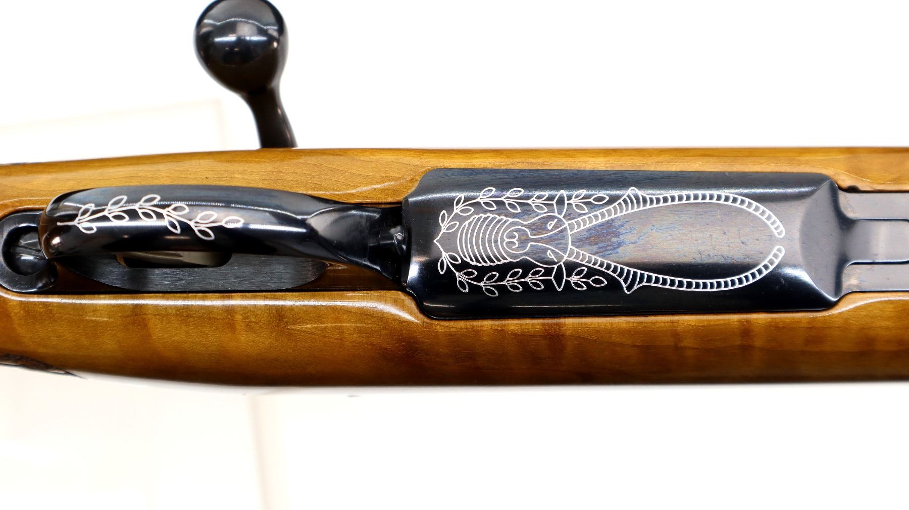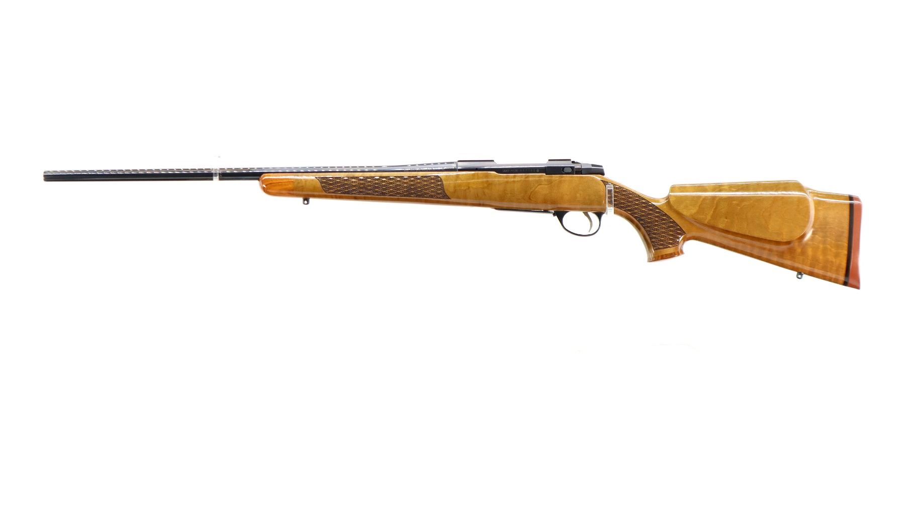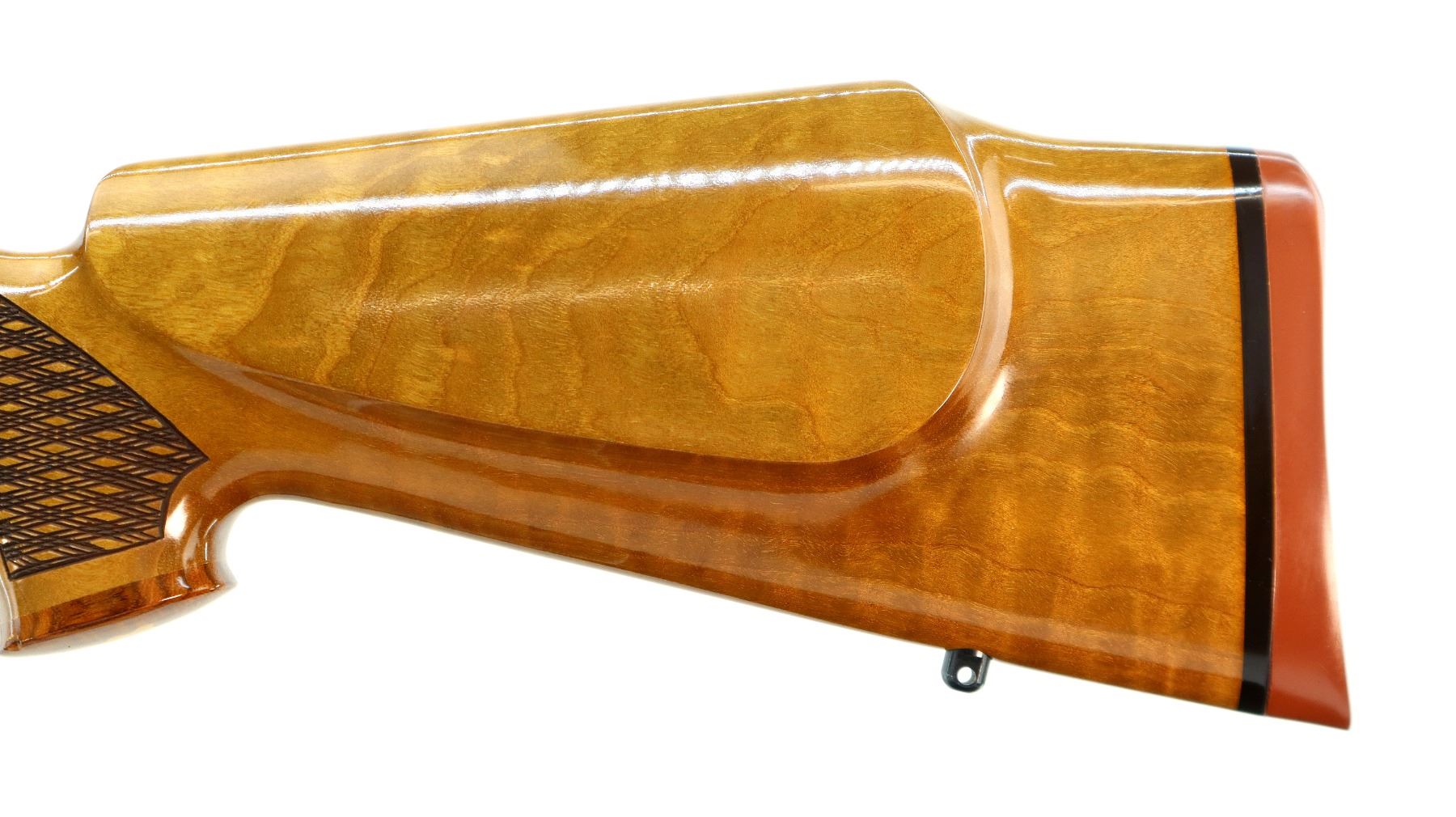 Main Description: Manufactured Mid 1990's. No sights, polish blued finish, tapered round barrel, receiver has integral scope bases, smooth bolt knob. Rare one piece gloss finish tiger colour / pattern wood stock, rosewood forend and pistol grip caps, checkered forearm and pistol grip with right hand palm swell, cheek rest, brown rubber recoil pad, engraved steel hinged floor plate and trigger guard, swivel studs.