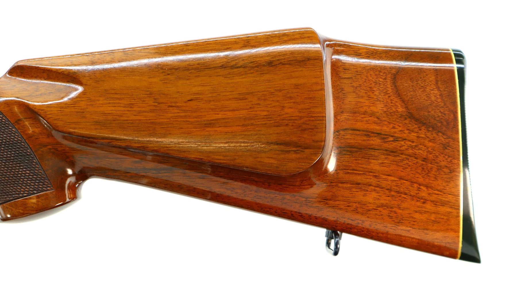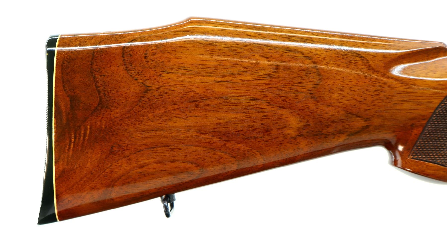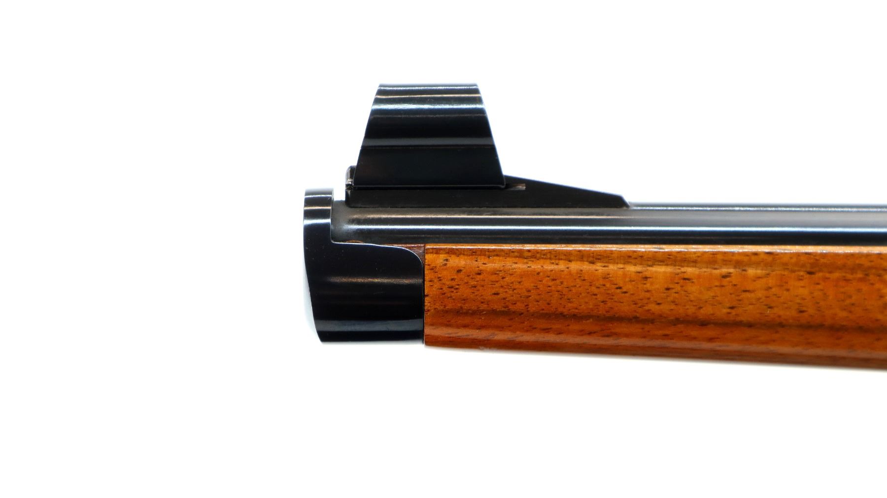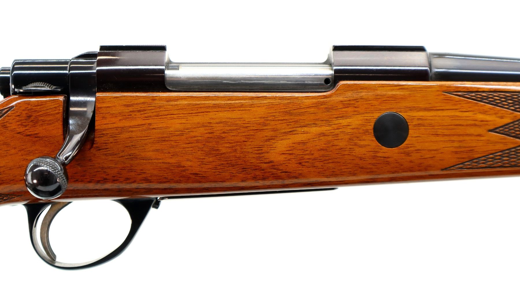 Main Description: Blade front sight with hood and ramp, no rear sight, polish blued finish, tapered round barrel, receiver has integral scope bases, checkered bolt knob. One piece Gloss finish Mannlicher wood stock, checkered forearm and pistol grip, cheek rest, grooved black polymer butt plate, steel hinged floor plate and trigger guard, sling swivels.