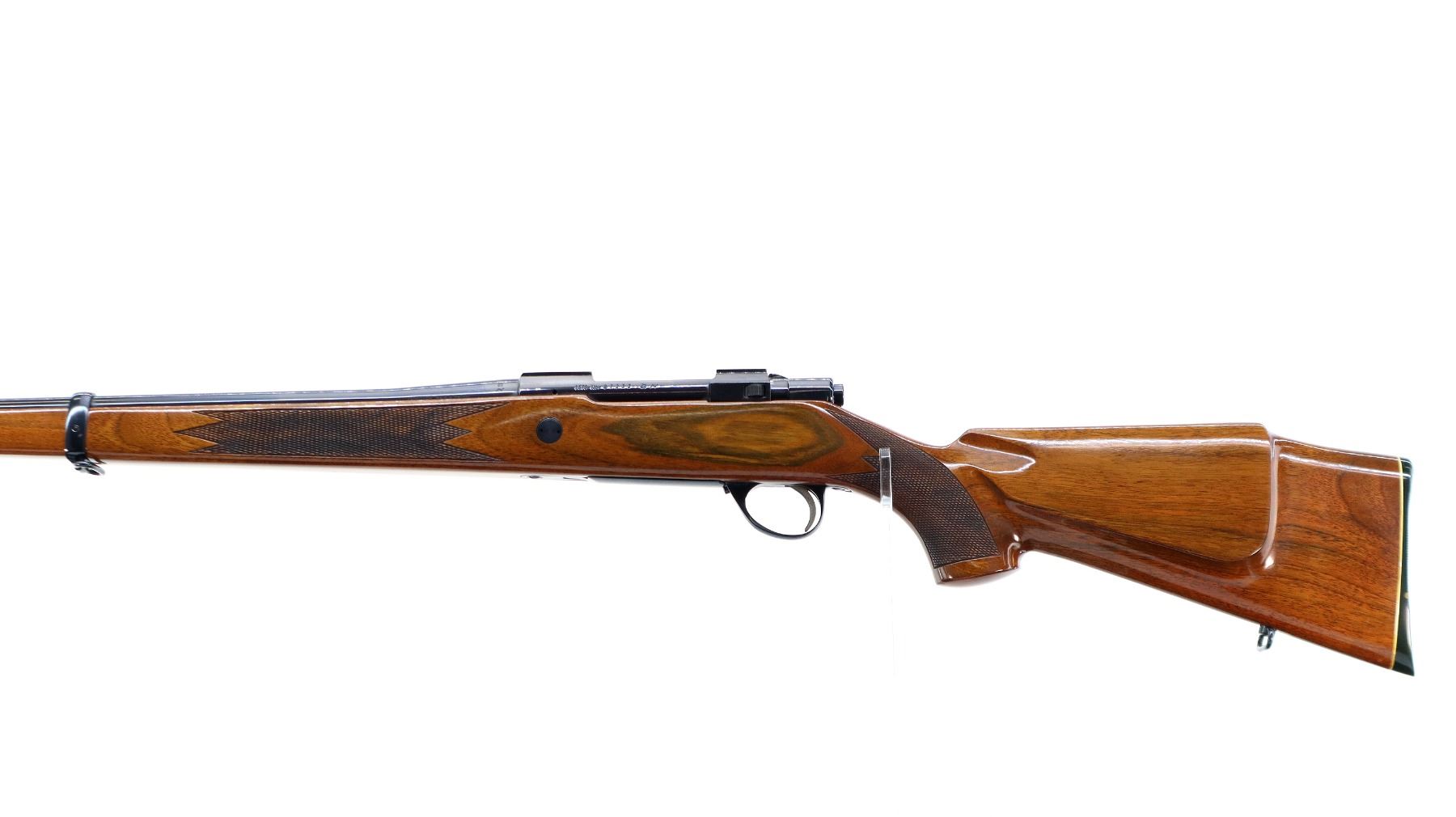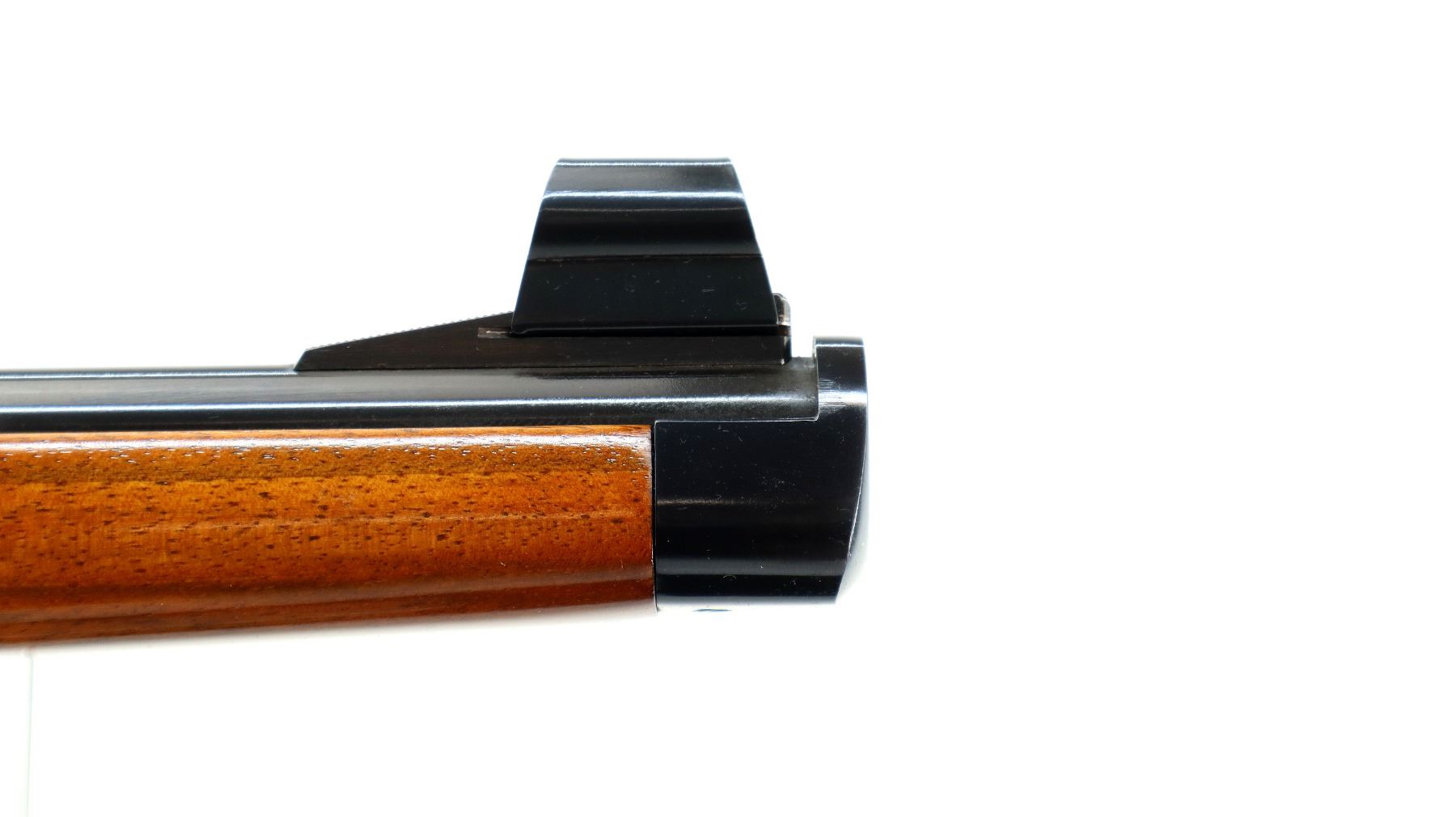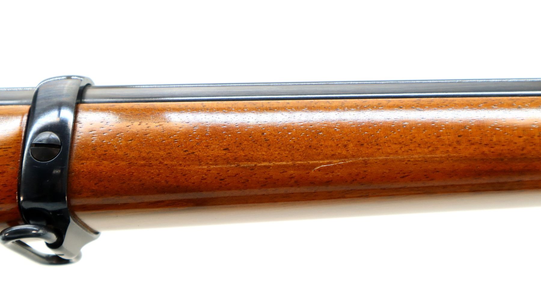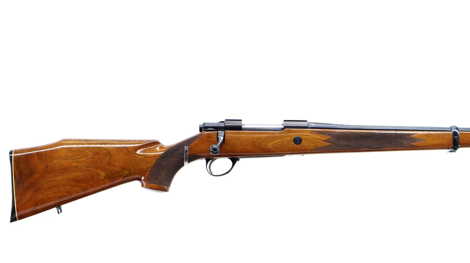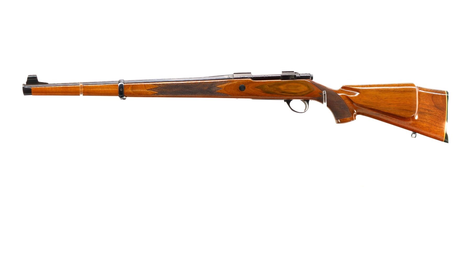 Main Description: Blade front sight with hood and ramp, no rear sight, polish blued finish, tapered round barrel, receiver has integral scope bases, checkered bolt knob. One piece Gloss finish Mannlicher wood stock, checkered forearm and pistol grip, cheek rest, grooved black polymer butt plate, steel hinged floor plate and trigger guard, sling swivels.