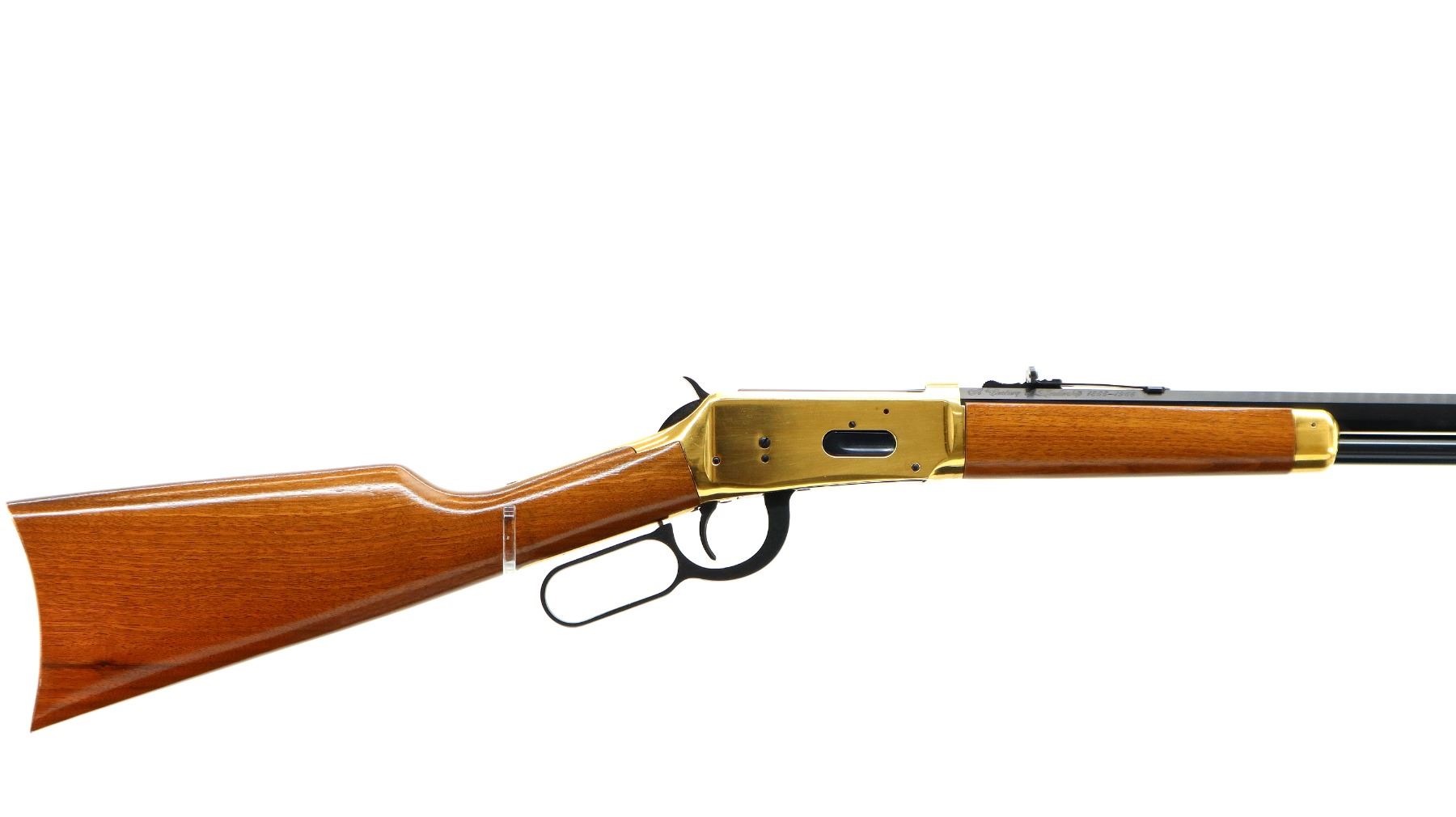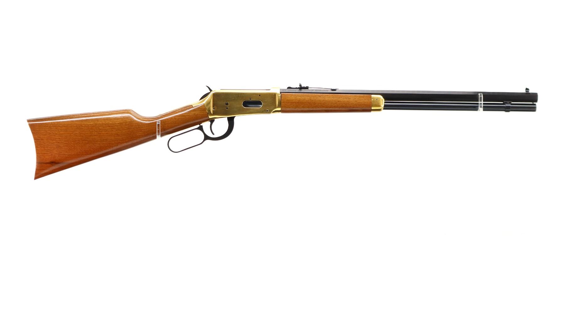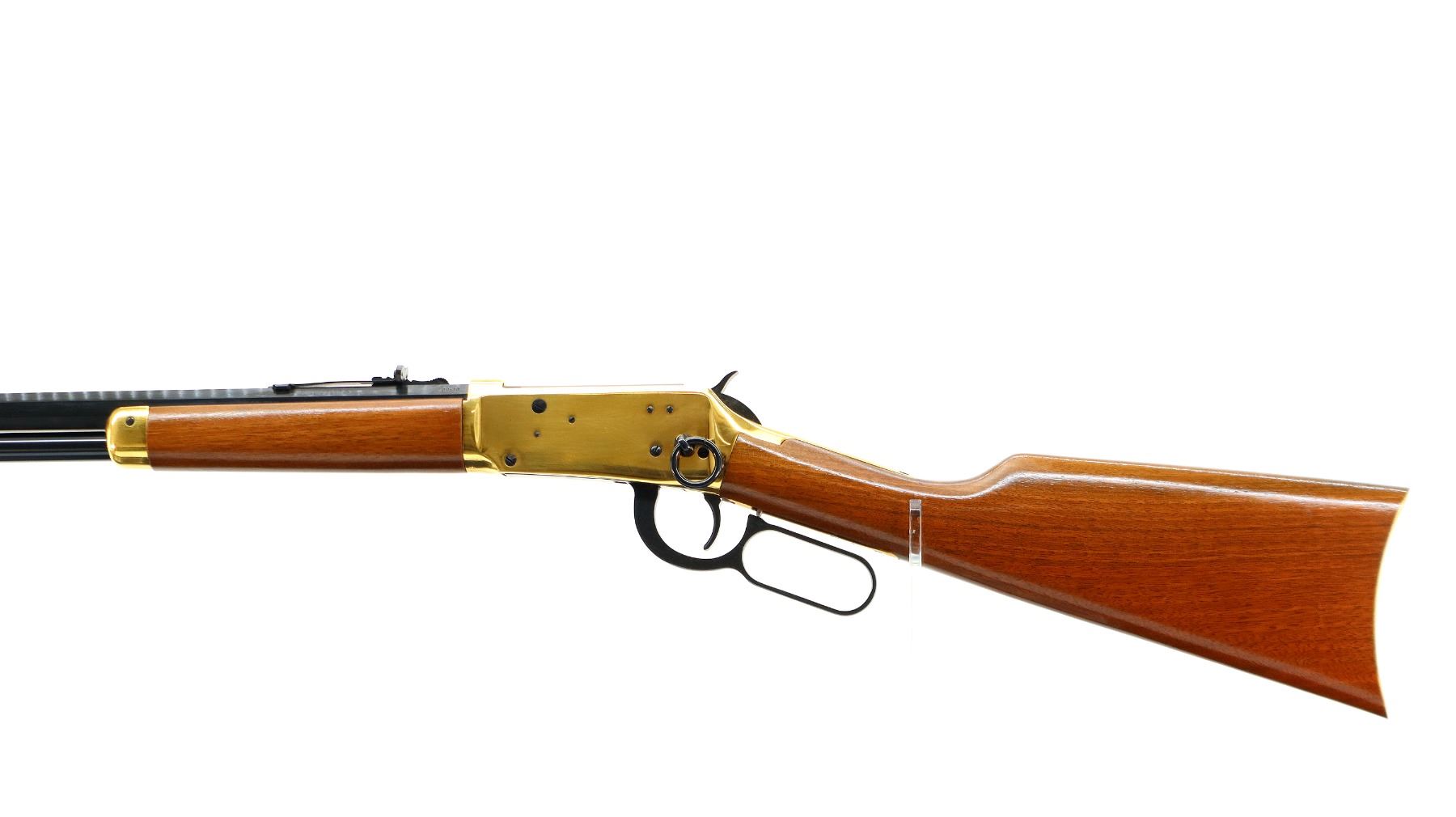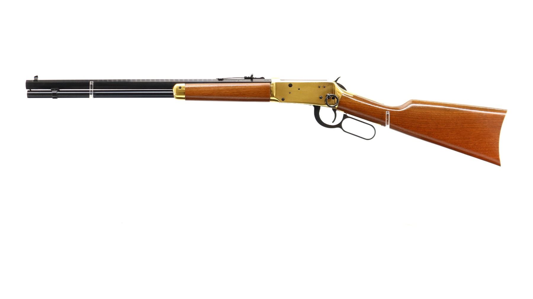 Main Description: Blade front sight, adjustable u notched rear sight, blued octagon barrel, bolt, lever and full length magtube. Gold receiver and smooth steel curved butt plate, grooved spur hammer, saddle ring and stud. Two piece wood stocks, straight grip, gold nose cap.