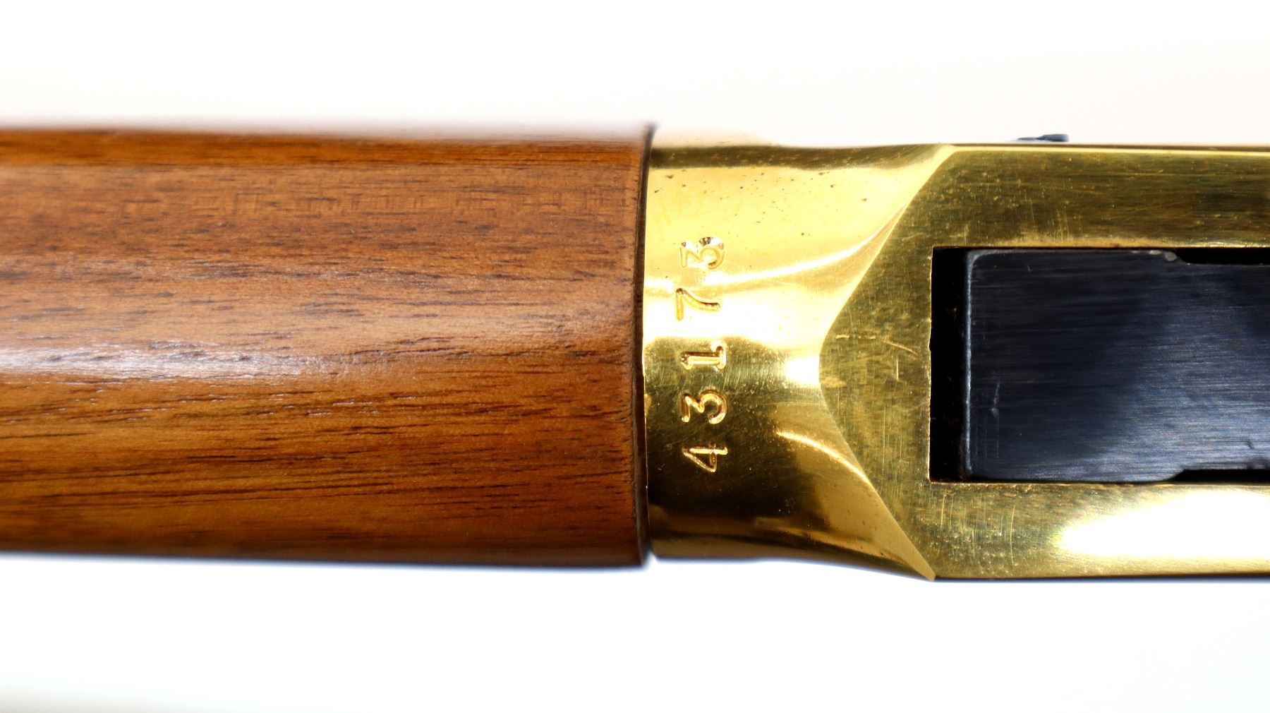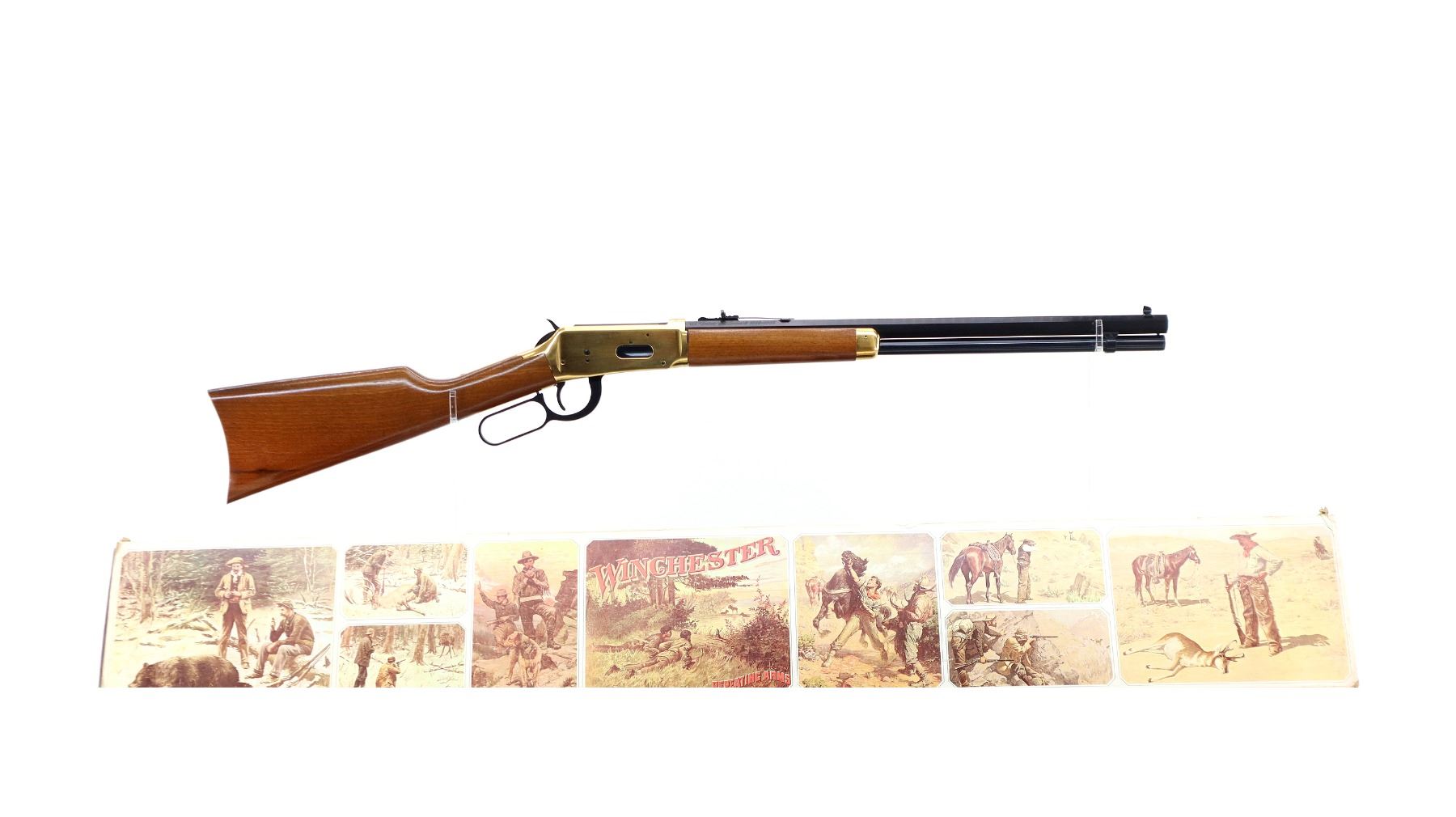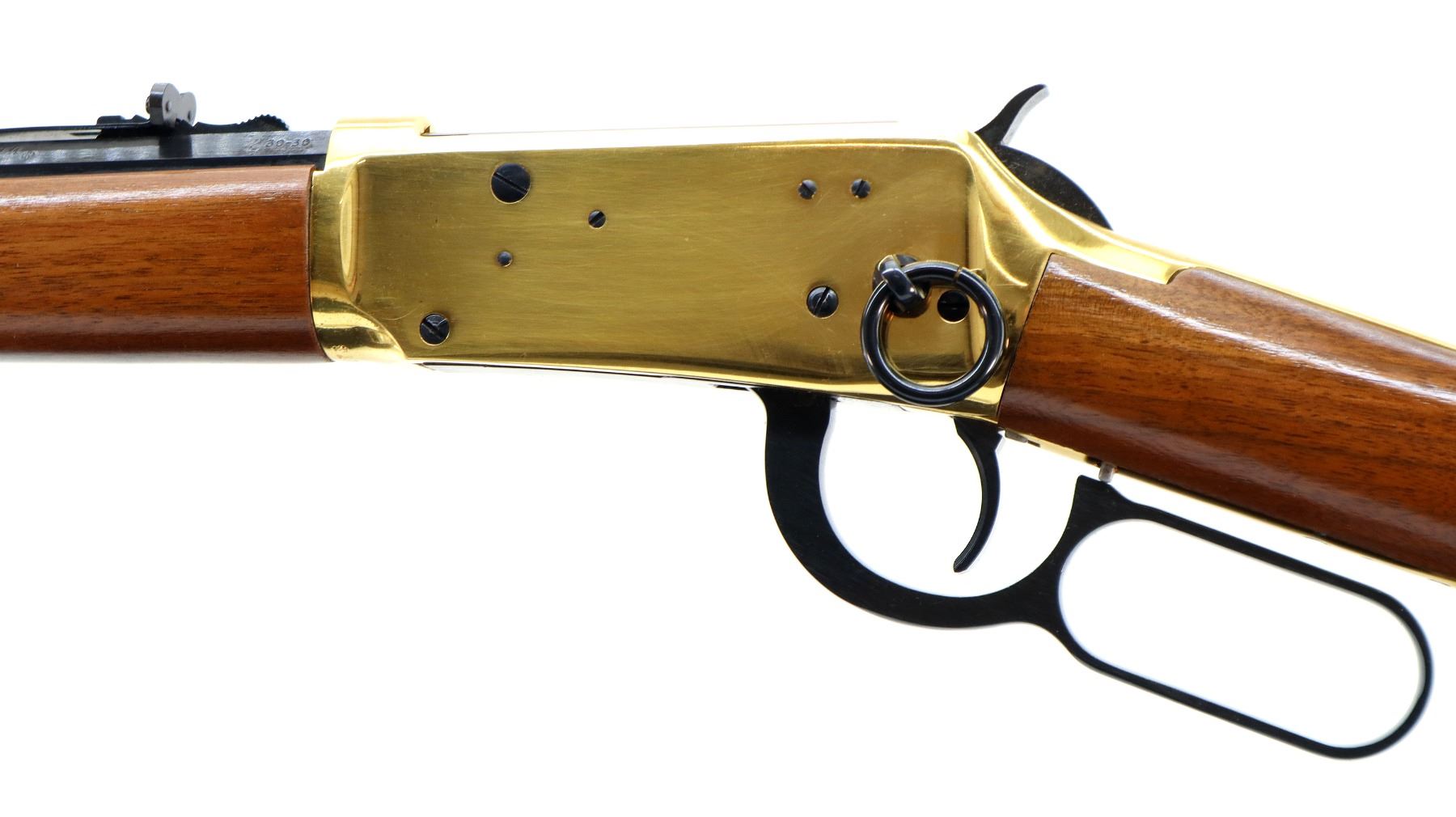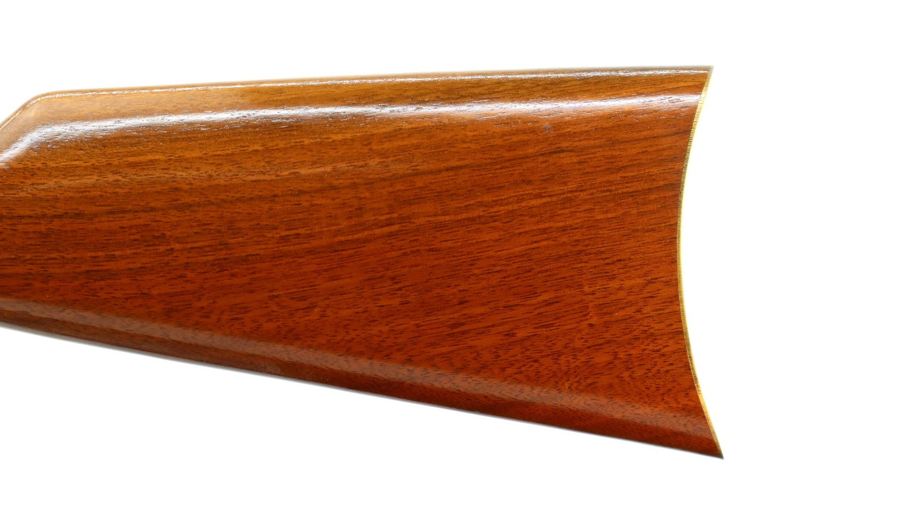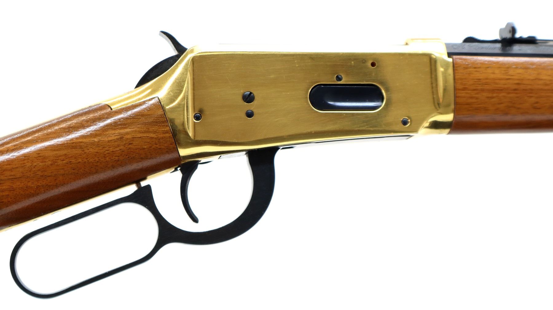Main Description: Blade front sight, adjustable u notched rear sight, blued octagon barrel, bolt, lever and full length magtube. Gold receiver and smooth steel curved butt plate, grooved spur hammer, saddle ring and stud. Two piece wood stocks, straight grip, gold nose cap.