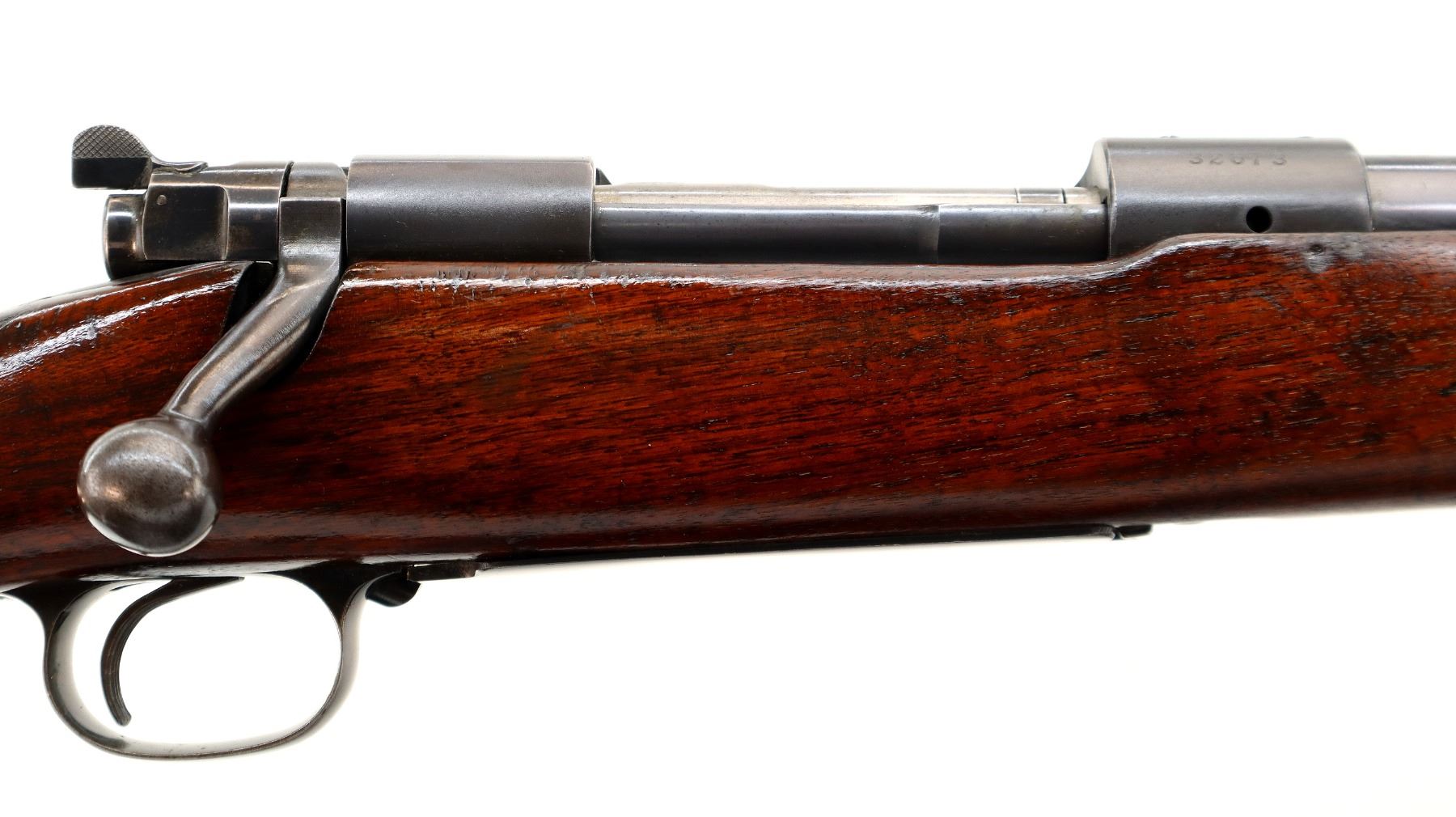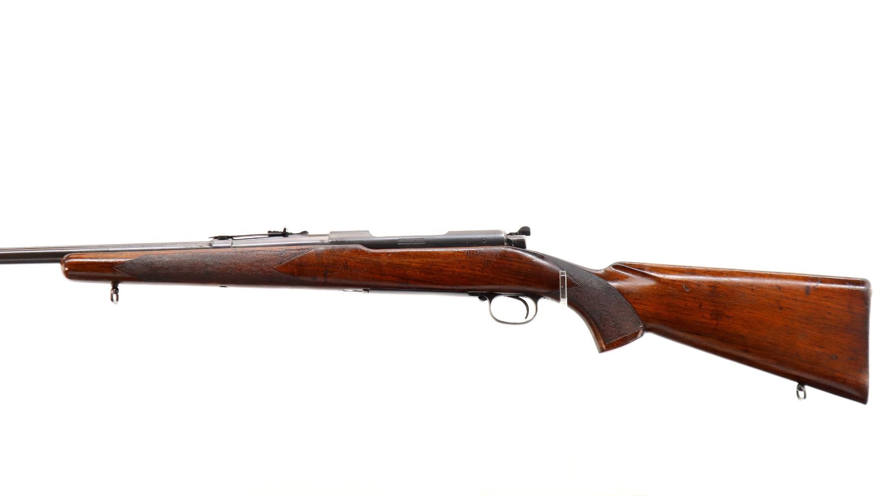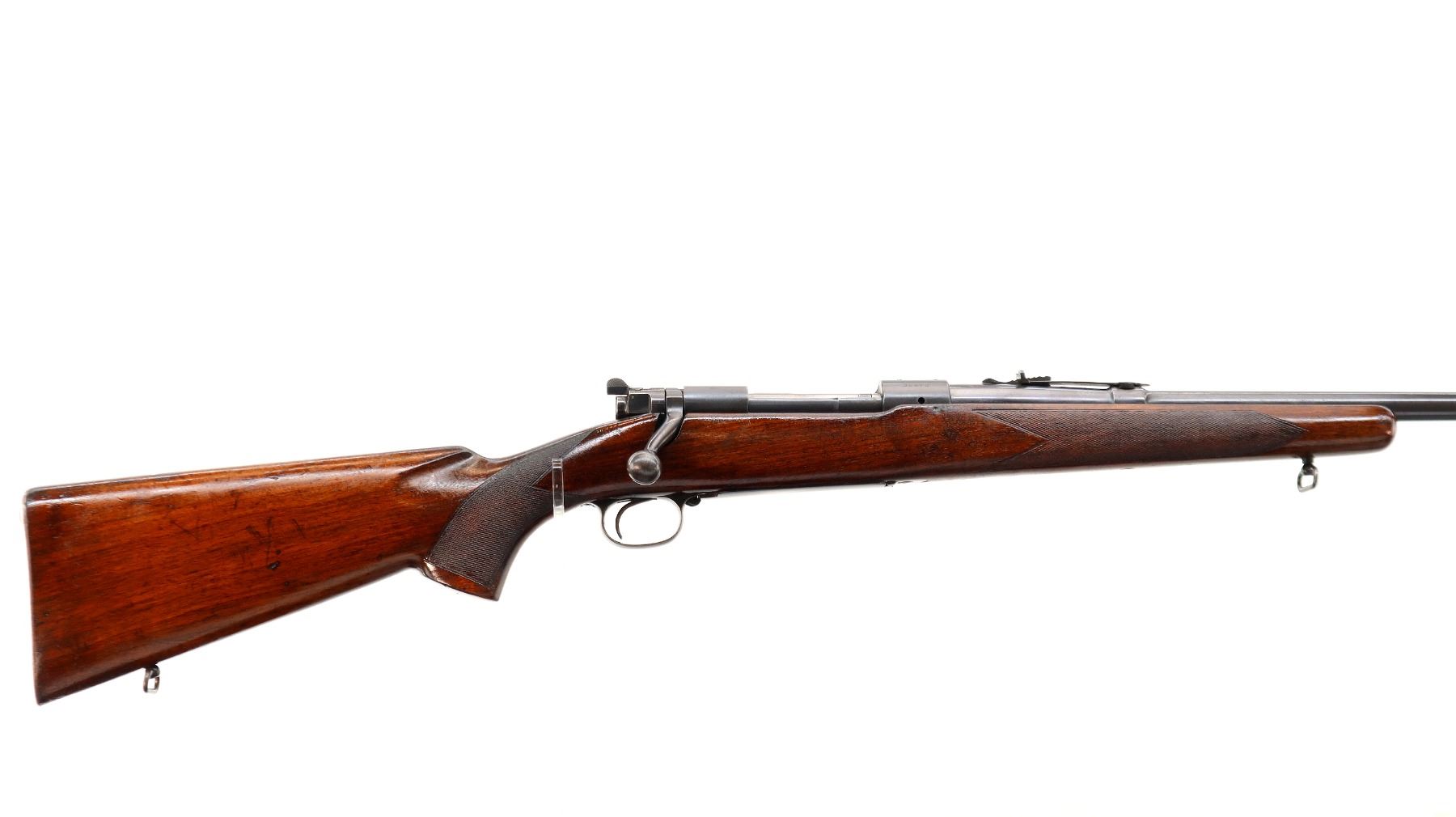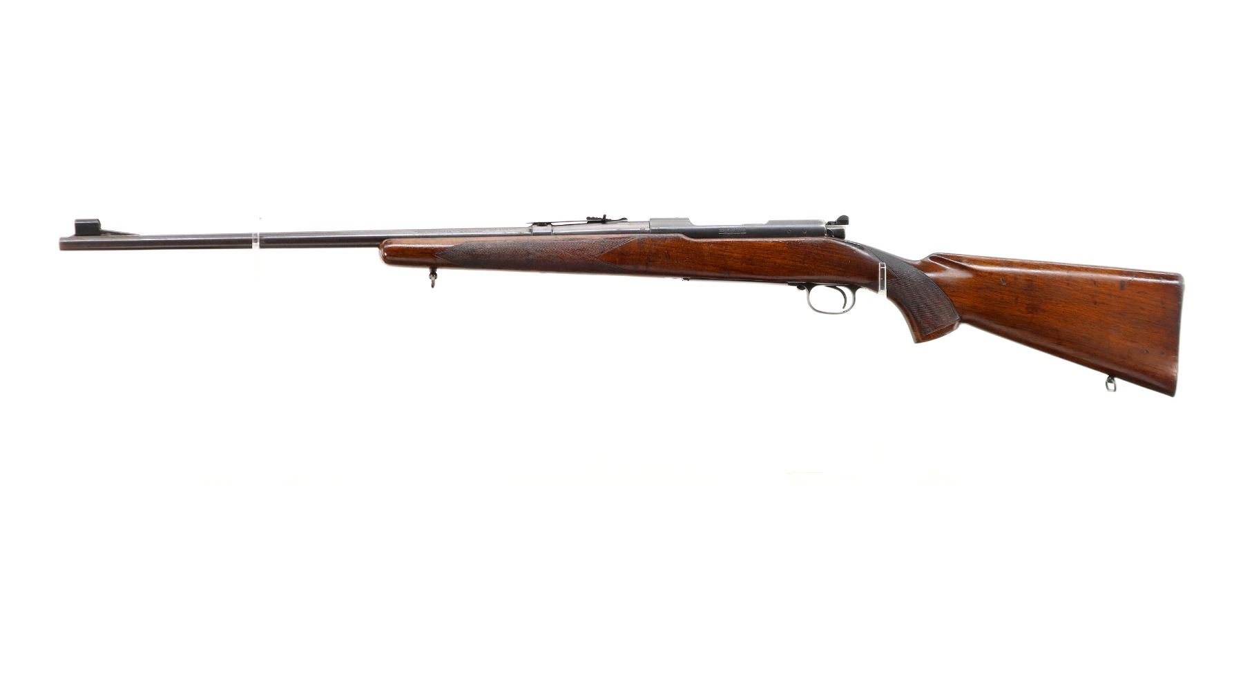 Main Description: Manufactured 1941. Blade front sight with hood and ramp, adjustable u notched rear sight, Satin Blued receiver, front ring drilled and tapped with plug screws installed, rear bridge has stripper clip guide, controlled round feed bolt with smooth knob. One piece wood stock, checkered forearm, pistol grip and steel butt plate, hinged floor plate, sling swivels.