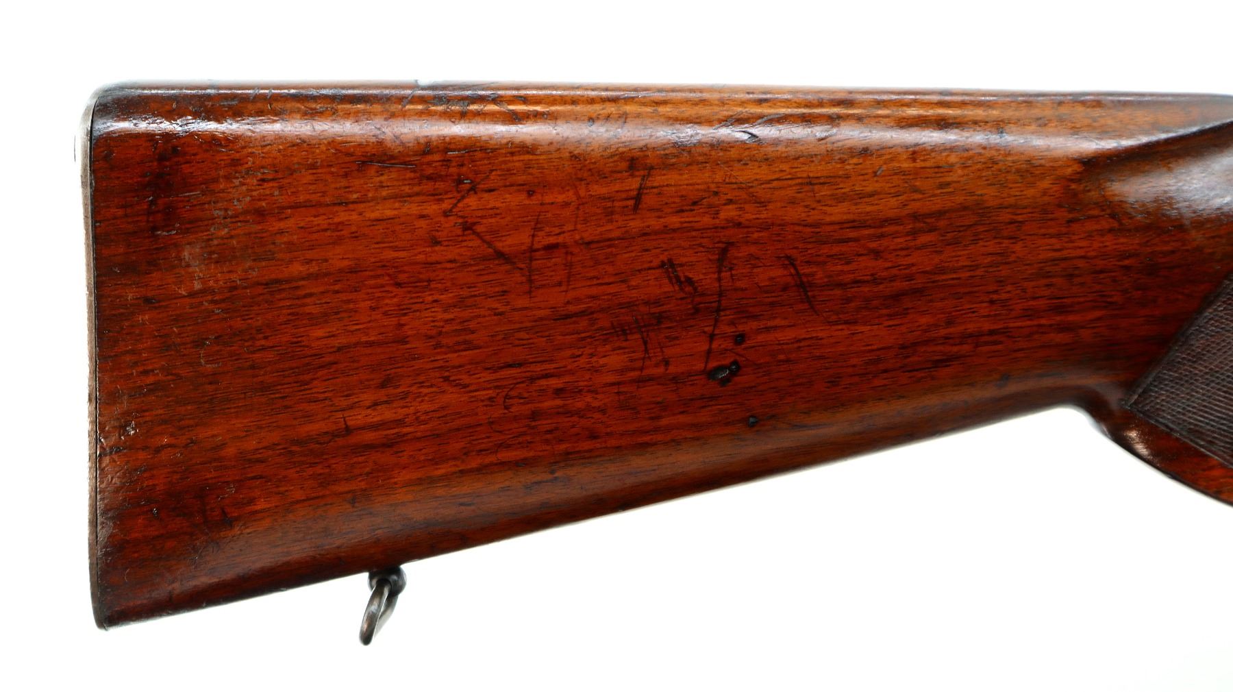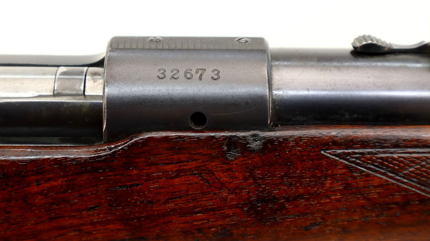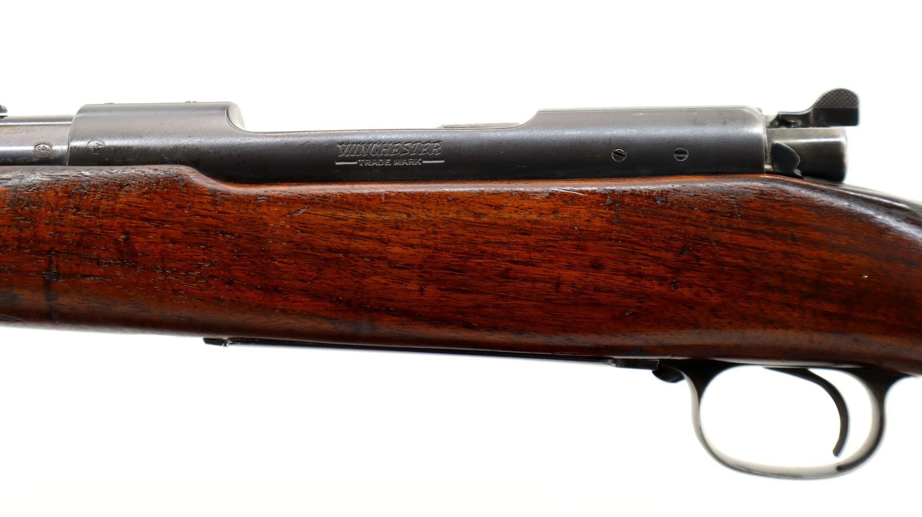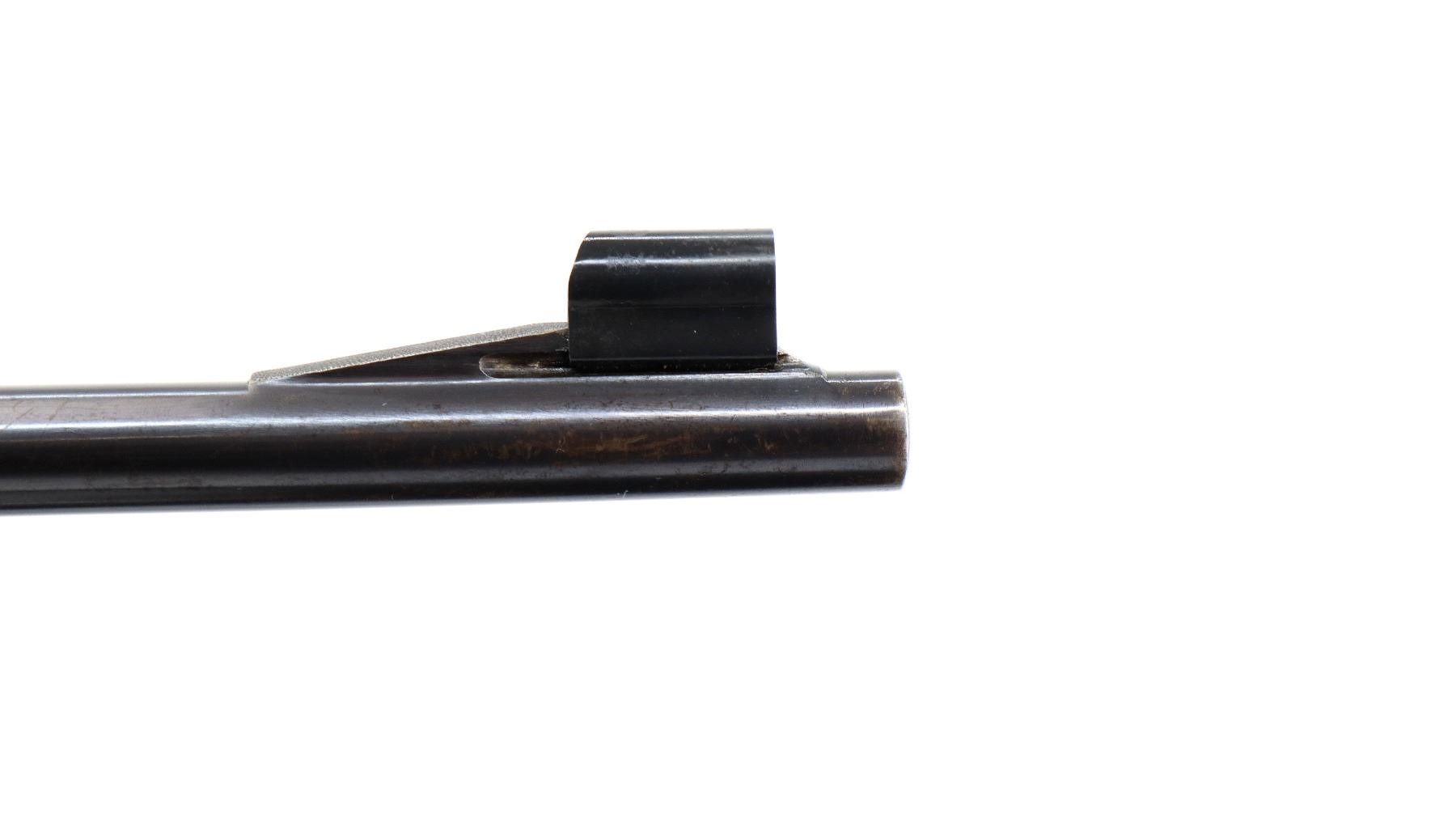 Main Description: Manufactured 1941. Blade front sight with hood and ramp, adjustable u notched rear sight, Satin Blued receiver, front ring drilled and tapped with plug screws installed, rear bridge has stripper clip guide, controlled round feed bolt with smooth knob. One piece wood stock, checkered forearm, pistol grip and steel butt plate, hinged floor plate, sling swivels.