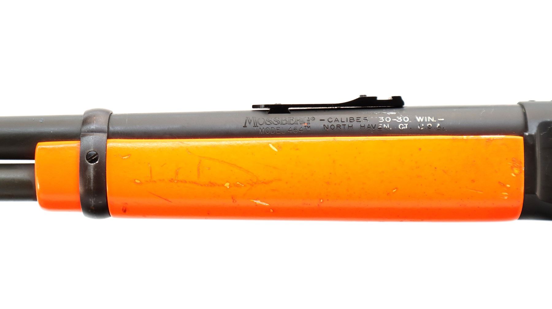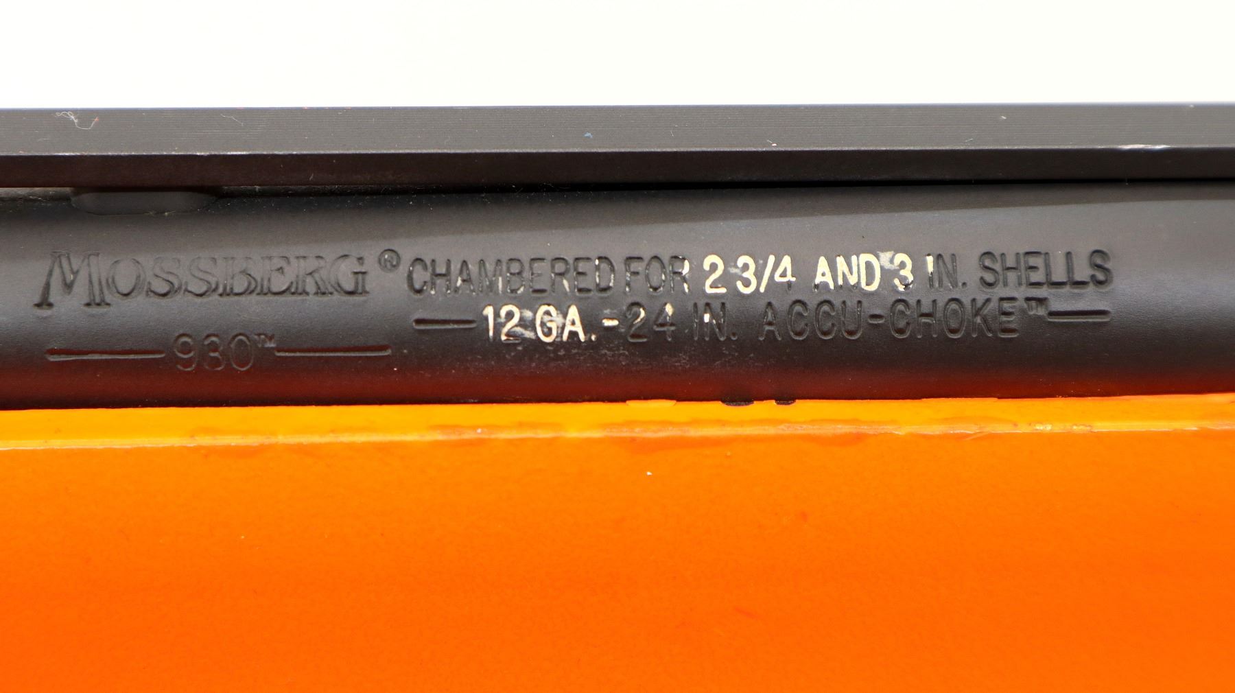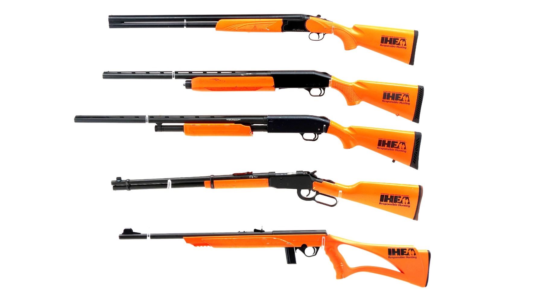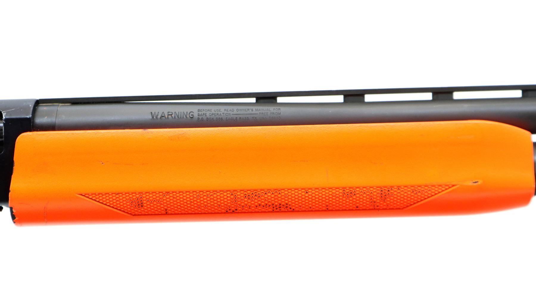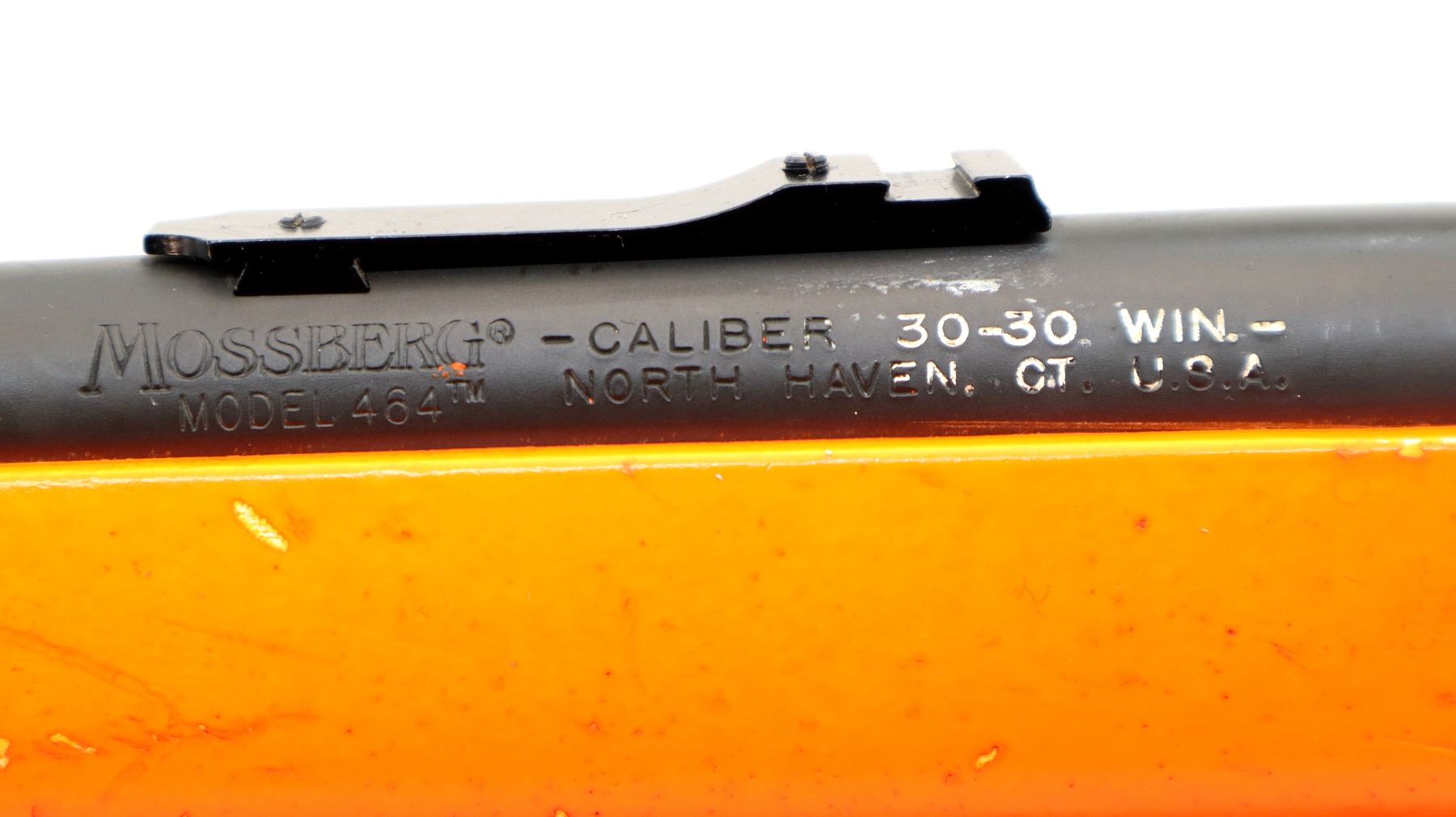 Main Description: This lot includes five non-firing firearms. All have Parkerized/Black painted metal finish and hunter-orange synthetic stocks. Model: 500, Cal: 12 G X 3", Serial: TR12093100, Action: Over Under, Barrel: 28", has Removable Full and IM Chokes. Has brass bead, solid rib, alloy receiver, manual safety, extractor, single mechanical trigger, checkered forearm and pistol grip, black rubber recoil pad. Model: 930, CAL: 12 G X 3", Serial: AF103337, Action: Semi Automatic Shotgun, Barrel: 24", Excellent Bore, Removable Mod Choke Installed, has broken bead, vent rib, alloy receiver drilled and tapped with plug screws installed, tang safety, checkered forearm and pistol grip, black vented rubber recoil pad, grip cap, swivel studs.Model: 500, CAL: 20 G X 3", Serial: U342319, Action: Pump Action Shotgun, Barrel: 26", Excellent Bore, Removable Mod Choke, has white front and brass mid rib beads, vent rib, alloy receiver drilled and tapped with plug screws installed, tang safety, textured forearm and pistol grip panels, black vented rubber recoil pad, rear swivel stud only. Model: 464, CAL: .30-30 WIN, Serial: LA030457, Action: Lever Action Rifle, Barrel: 20.5", Good Bore, Blade front sight, rear sight missing leaf has the base, receiver drilled and tapped with plug screws installed, grooved spur hammer, tang safety, straight grip, grooved brown rubber recoil pad, full length magtube. Model: 802, CAL: .22 LR, Serial: HLL3562841, Action: Bolt Action Rifle, 18", Magazine, Good Bore, Blade front sight with hood and ramp, adjustable u notched rear sight, grooved receiver, checkered bolt knob, textured forearm and thumb hole pistol grip, grooved black polymer butt plate, grip cap, short rail at forend tip. Note: Items are described in order they appear from top to bottom in the picture.