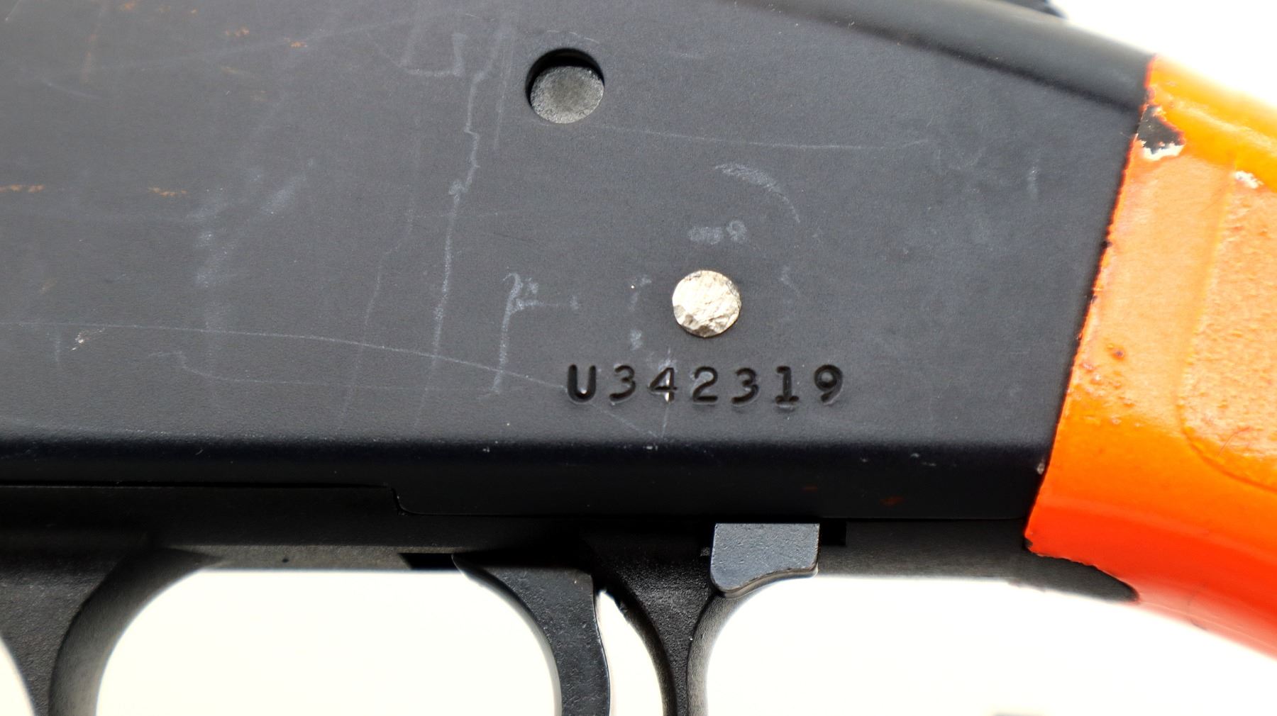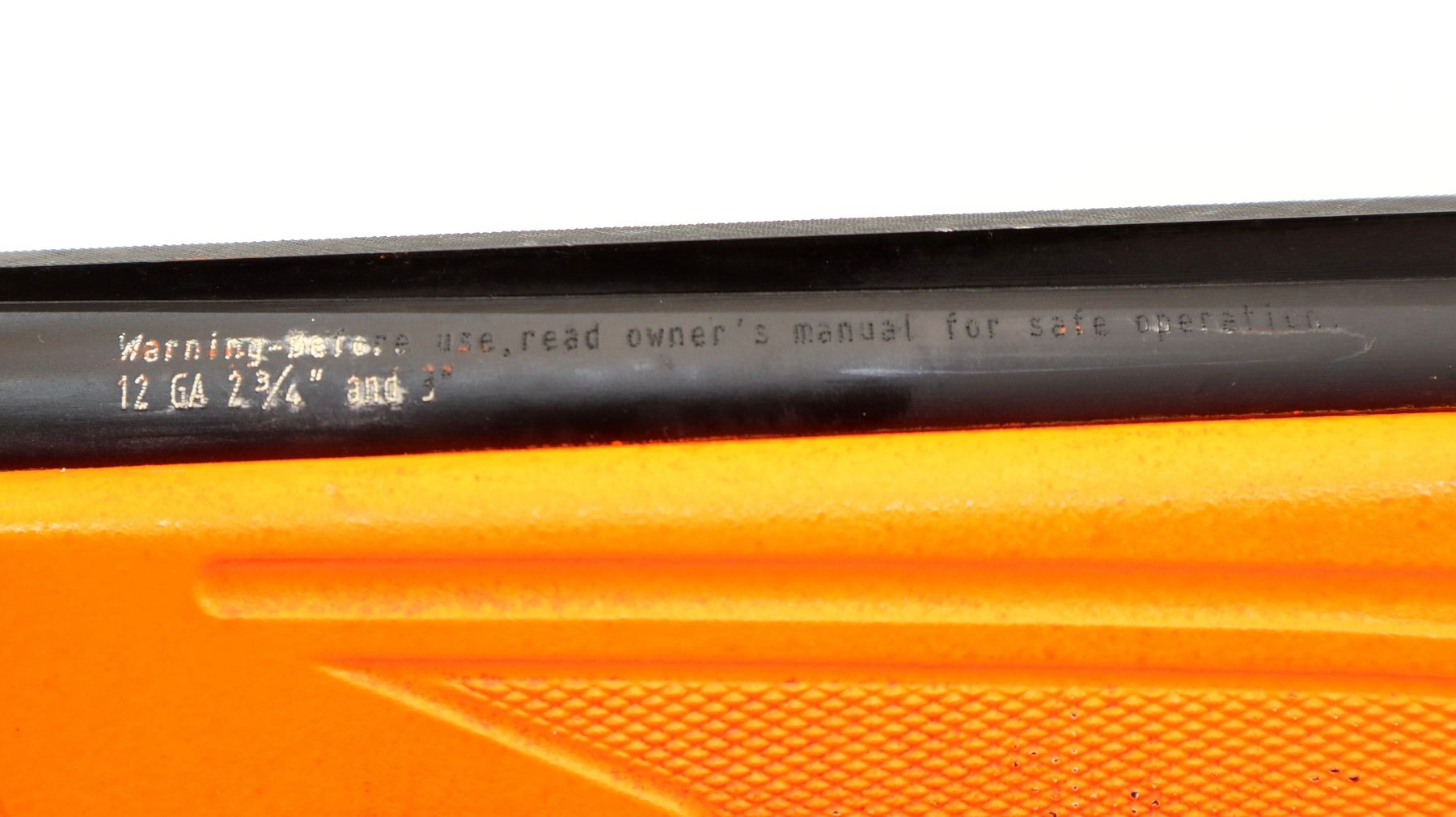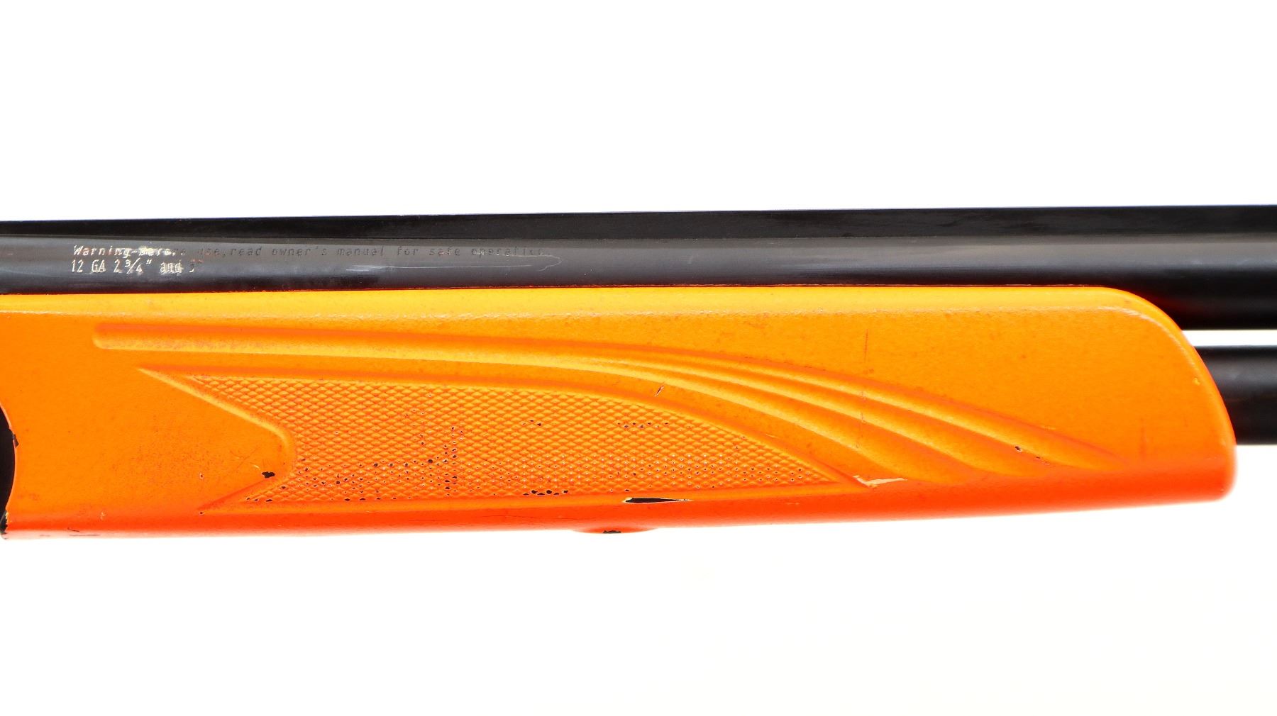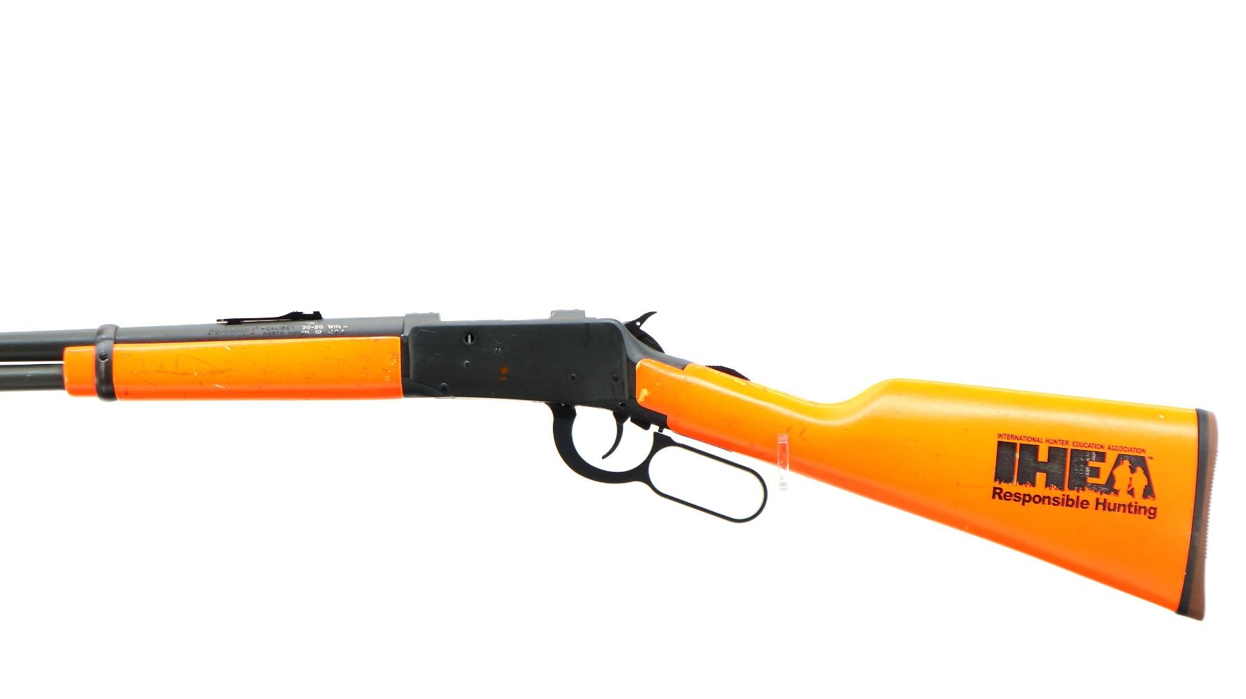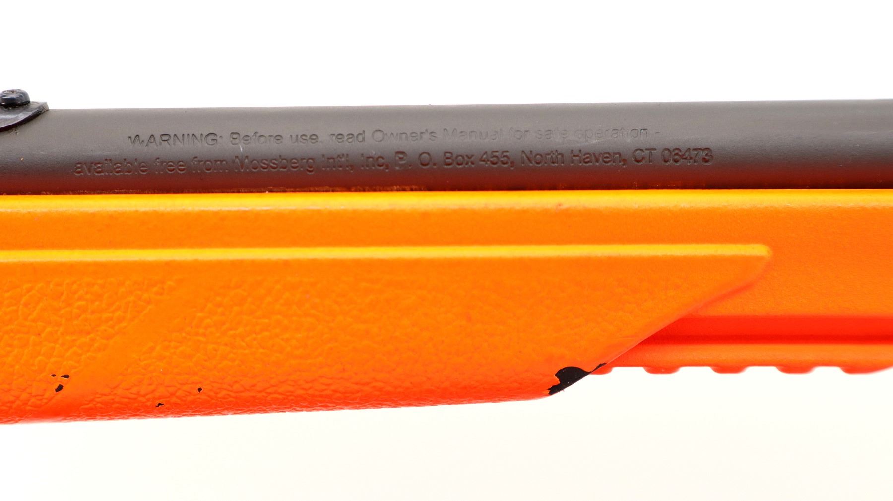 Main Description: This lot includes five non-firing firearms. All have Parkerized/Black painted metal finish and hunter-orange synthetic stocks. Model: 500, Cal: 12 G X 3", Serial: TR12093100, Action: Over Under, Barrel: 28", has Removable Full and IM Chokes. Has brass bead, solid rib, alloy receiver, manual safety, extractor, single mechanical trigger, checkered forearm and pistol grip, black rubber recoil pad. Model: 930, CAL: 12 G X 3", Serial: AF103337, Action: Semi Automatic Shotgun, Barrel: 24", Excellent Bore, Removable Mod Choke Installed, has broken bead, vent rib, alloy receiver drilled and tapped with plug screws installed, tang safety, checkered forearm and pistol grip, black vented rubber recoil pad, grip cap, swivel studs.Model: 500, CAL: 20 G X 3", Serial: U342319, Action: Pump Action Shotgun, Barrel: 26", Excellent Bore, Removable Mod Choke, has white front and brass mid rib beads, vent rib, alloy receiver drilled and tapped with plug screws installed, tang safety, textured forearm and pistol grip panels, black vented rubber recoil pad, rear swivel stud only. Model: 464, CAL: .30-30 WIN, Serial: LA030457, Action: Lever Action Rifle, Barrel: 20.5", Good Bore, Blade front sight, rear sight missing leaf has the base, receiver drilled and tapped with plug screws installed, grooved spur hammer, tang safety, straight grip, grooved brown rubber recoil pad, full length magtube. Model: 802, CAL: .22 LR, Serial: HLL3562841, Action: Bolt Action Rifle, 18", Magazine, Good Bore, Blade front sight with hood and ramp, adjustable u notched rear sight, grooved receiver, checkered bolt knob, textured forearm and thumb hole pistol grip, grooved black polymer butt plate, grip cap, short rail at forend tip. Note: Items are described in order they appear from top to bottom in the picture.