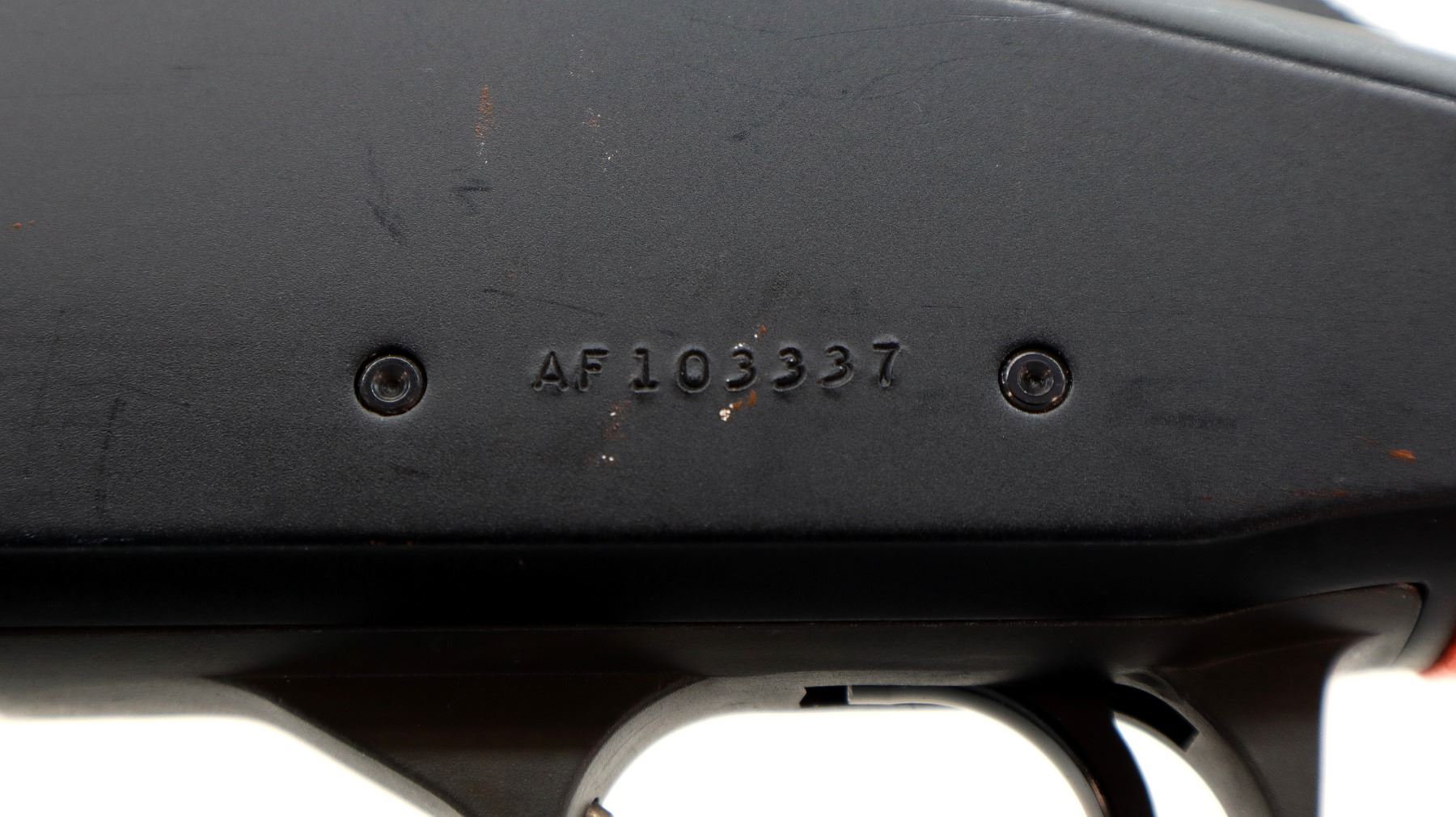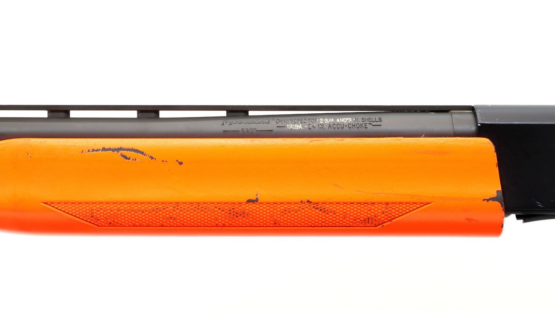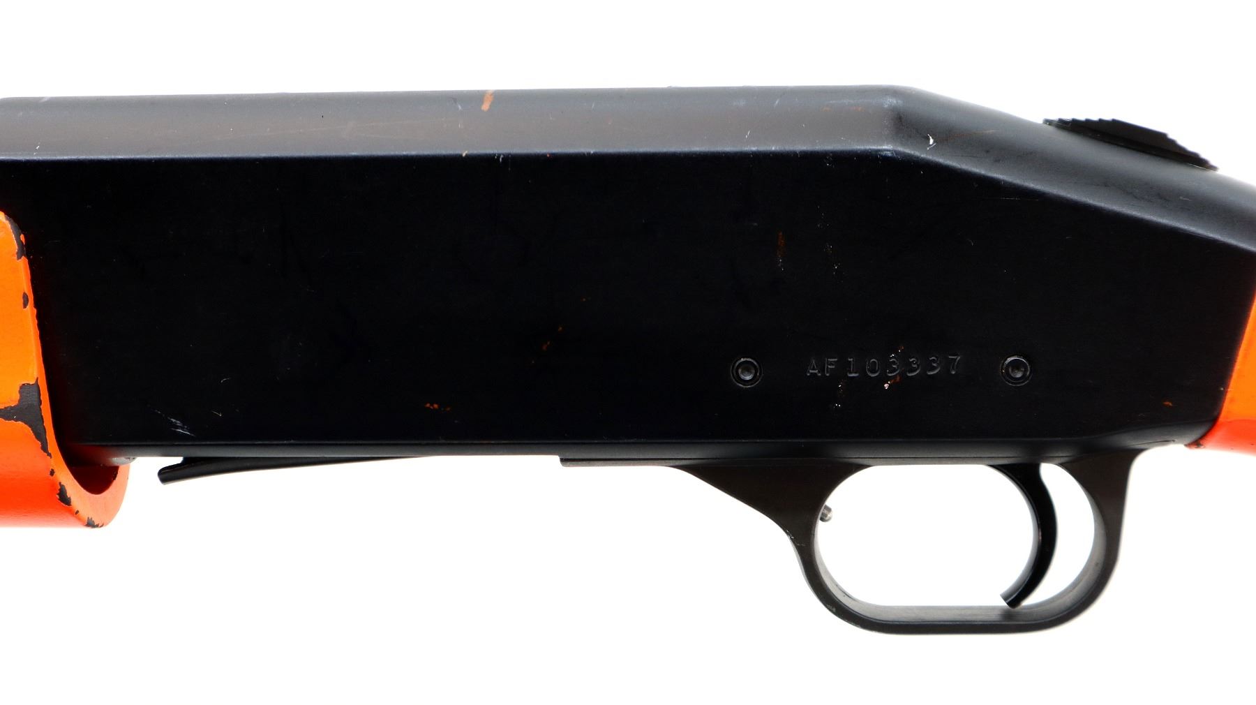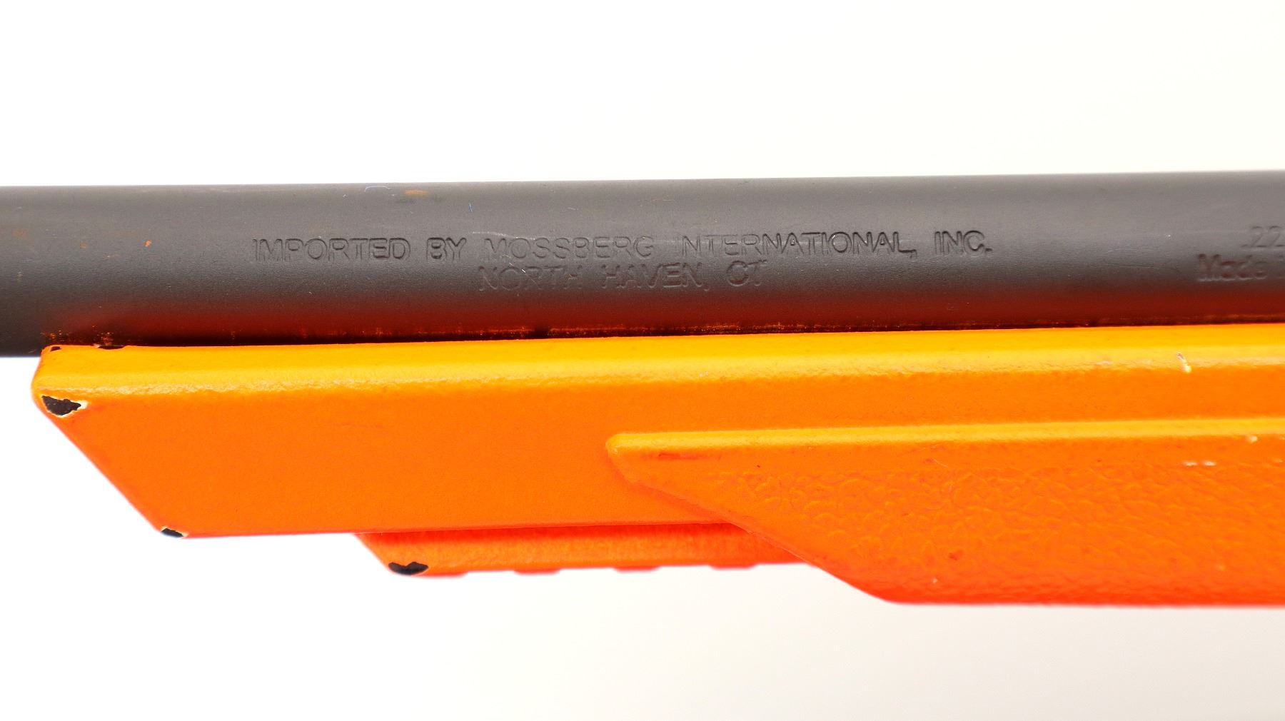 Main Description: This lot includes five non-firing firearms. All have Parkerized/Black painted metal finish and hunter-orange synthetic stocks. Model: 500, Cal: 12 G X 3", Serial: TR12093100, Action: Over Under, Barrel: 28", has Removable Full and IM Chokes. Has brass bead, solid rib, alloy receiver, manual safety, extractor, single mechanical trigger, checkered forearm and pistol grip, black rubber recoil pad. Model: 930, CAL: 12 G X 3", Serial: AF103337, Action: Semi Automatic Shotgun, Barrel: 24", Excellent Bore, Removable Mod Choke Installed, has broken bead, vent rib, alloy receiver drilled and tapped with plug screws installed, tang safety, checkered forearm and pistol grip, black vented rubber recoil pad, grip cap, swivel studs.Model: 500, CAL: 20 G X 3", Serial: U342319, Action: Pump Action Shotgun, Barrel: 26", Excellent Bore, Removable Mod Choke, has white front and brass mid rib beads, vent rib, alloy receiver drilled and tapped with plug screws installed, tang safety, textured forearm and pistol grip panels, black vented rubber recoil pad, rear swivel stud only. Model: 464, CAL: .30-30 WIN, Serial: LA030457, Action: Lever Action Rifle, Barrel: 20.5", Good Bore, Blade front sight, rear sight missing leaf has the base, receiver drilled and tapped with plug screws installed, grooved spur hammer, tang safety, straight grip, grooved brown rubber recoil pad, full length magtube. Model: 802, CAL: .22 LR, Serial: HLL3562841, Action: Bolt Action Rifle, 18", Magazine, Good Bore, Blade front sight with hood and ramp, adjustable u notched rear sight, grooved receiver, checkered bolt knob, textured forearm and thumb hole pistol grip, grooved black polymer butt plate, grip cap, short rail at forend tip. Note: Items are described in order they appear from top to bottom in the picture.