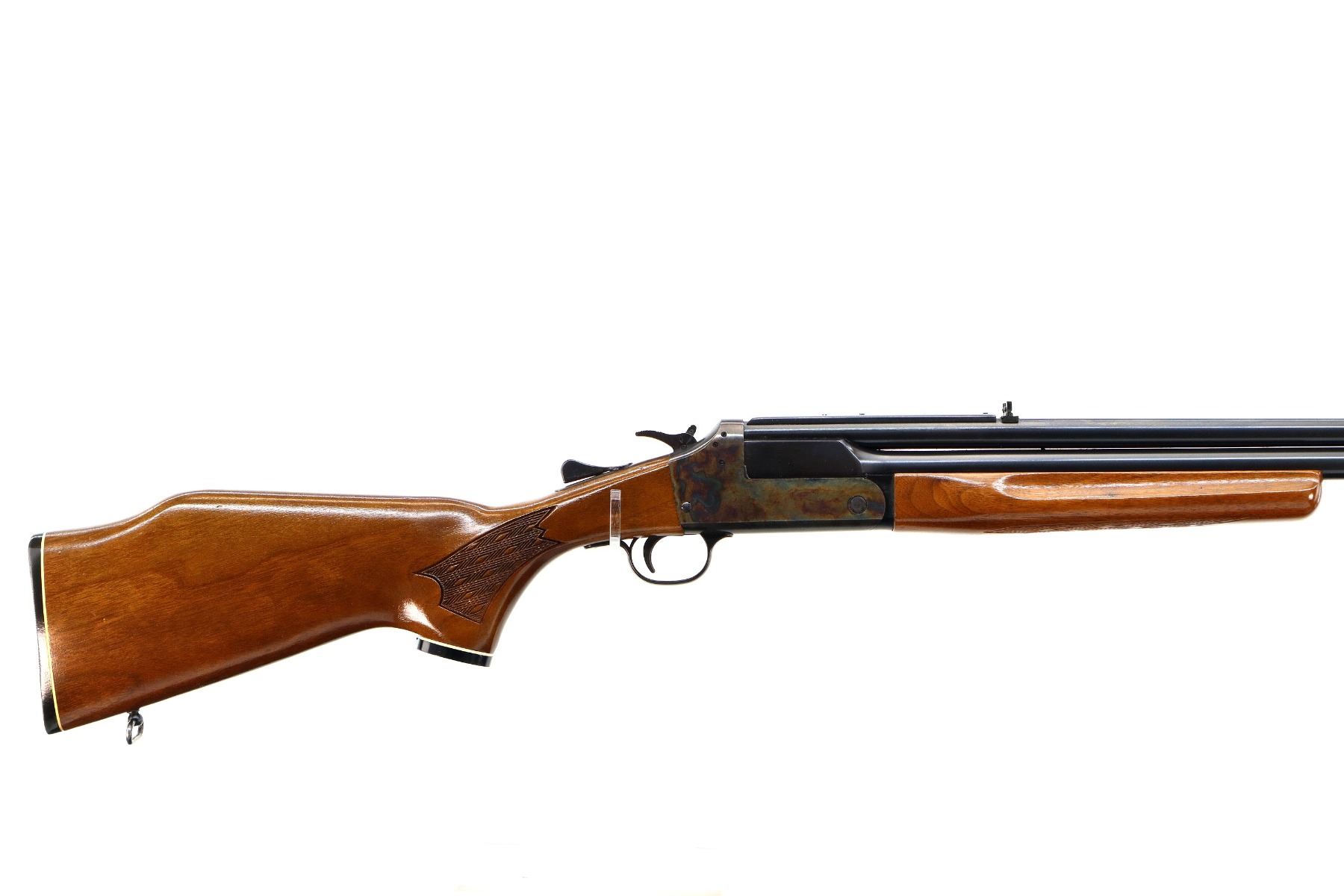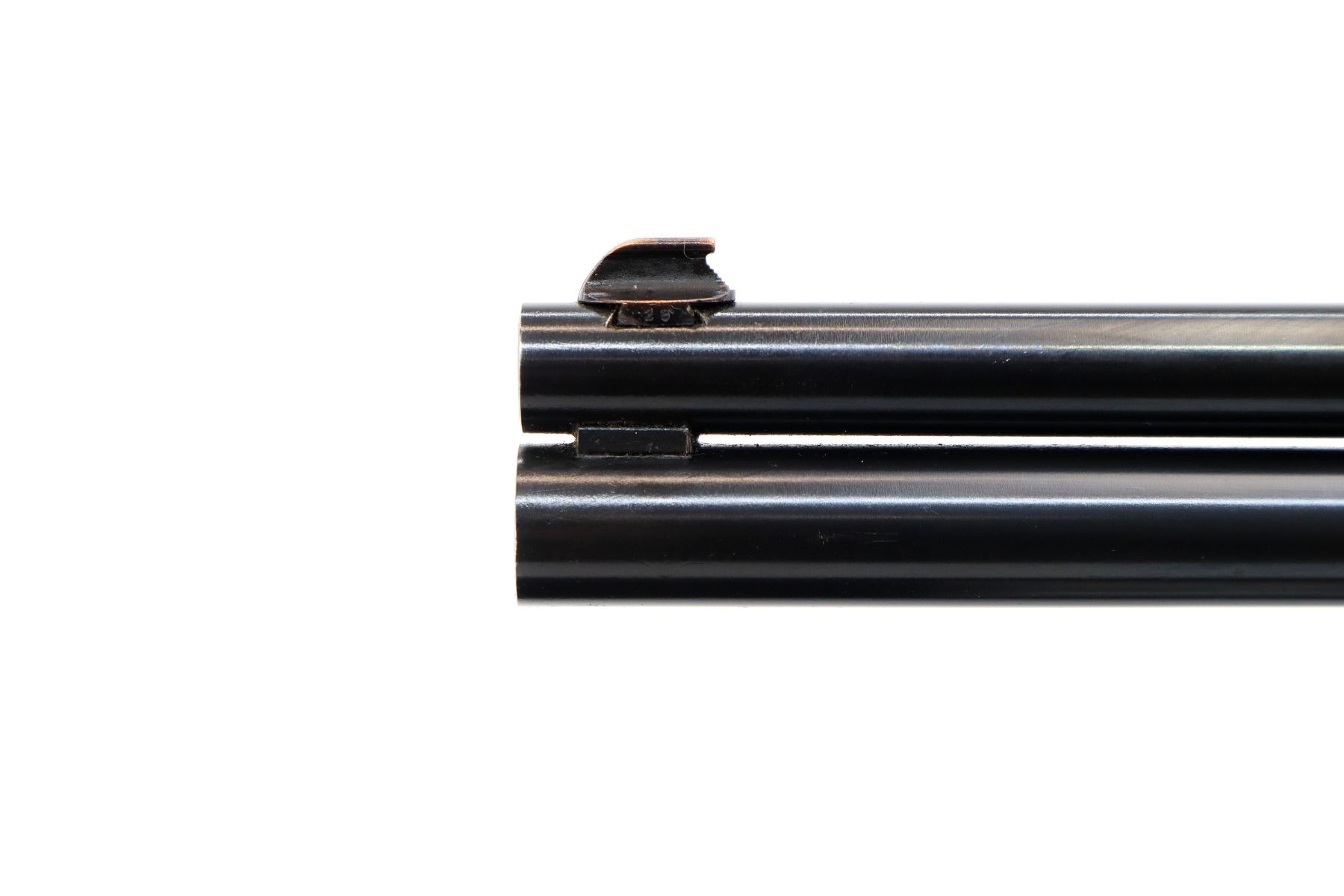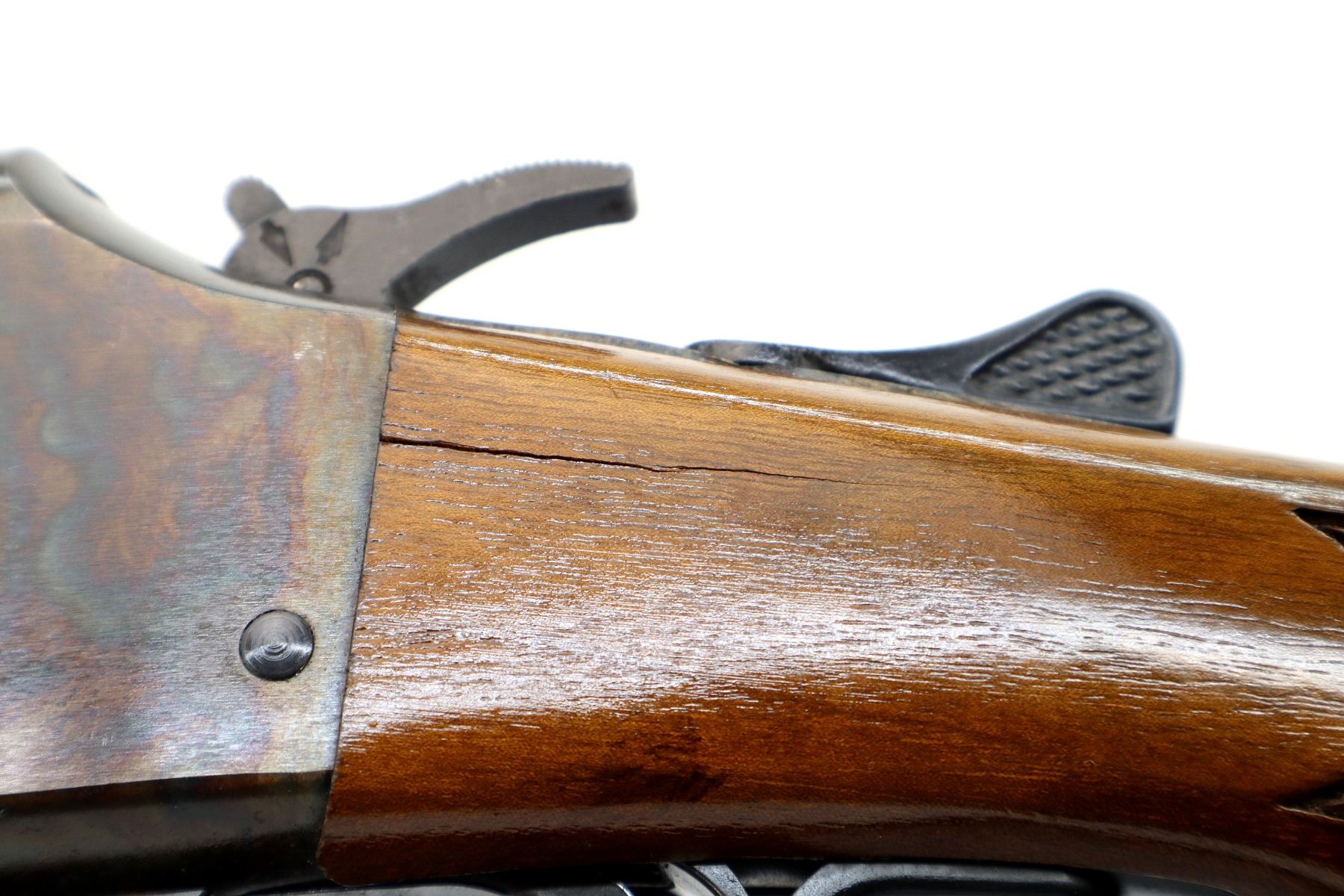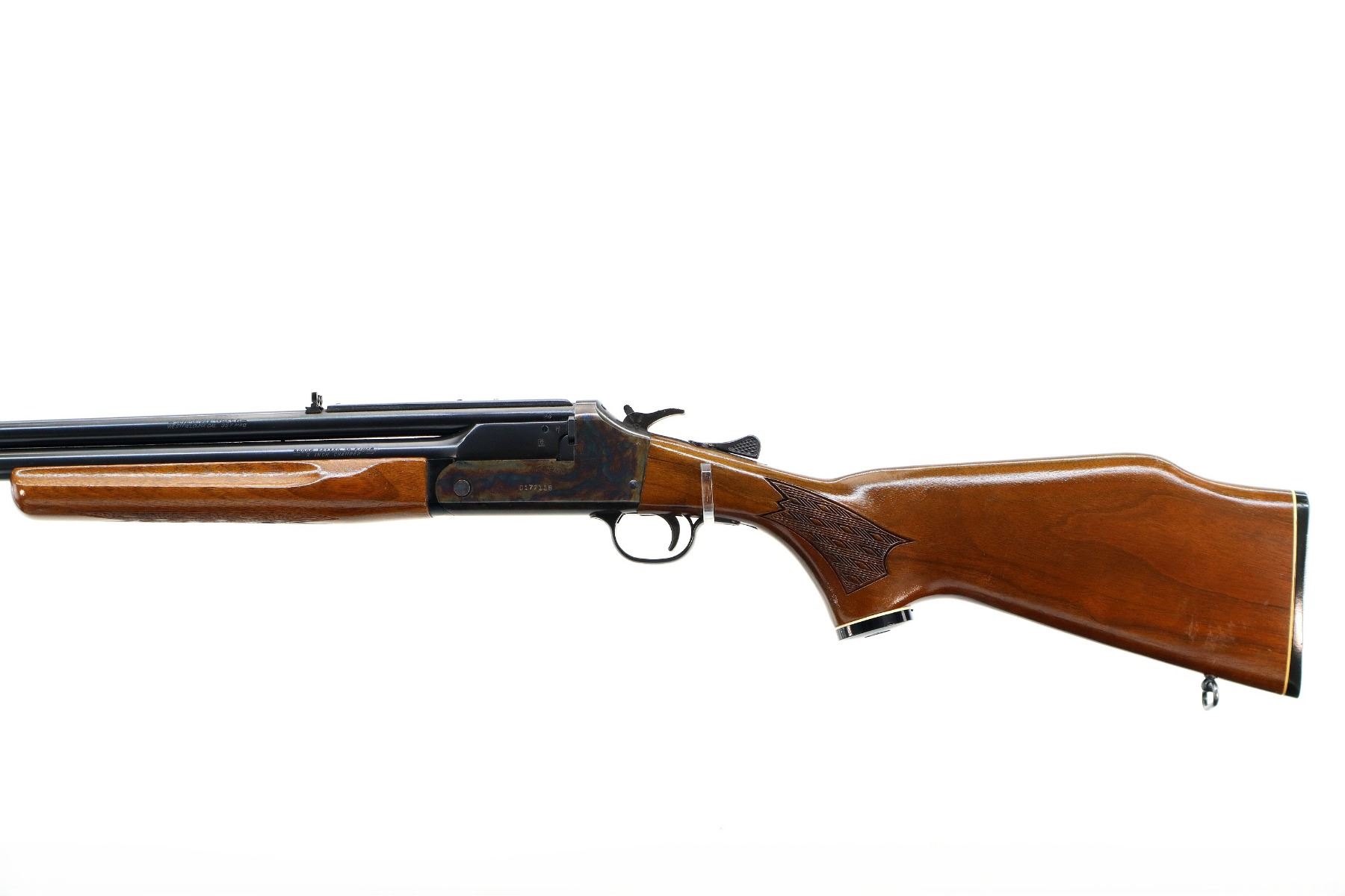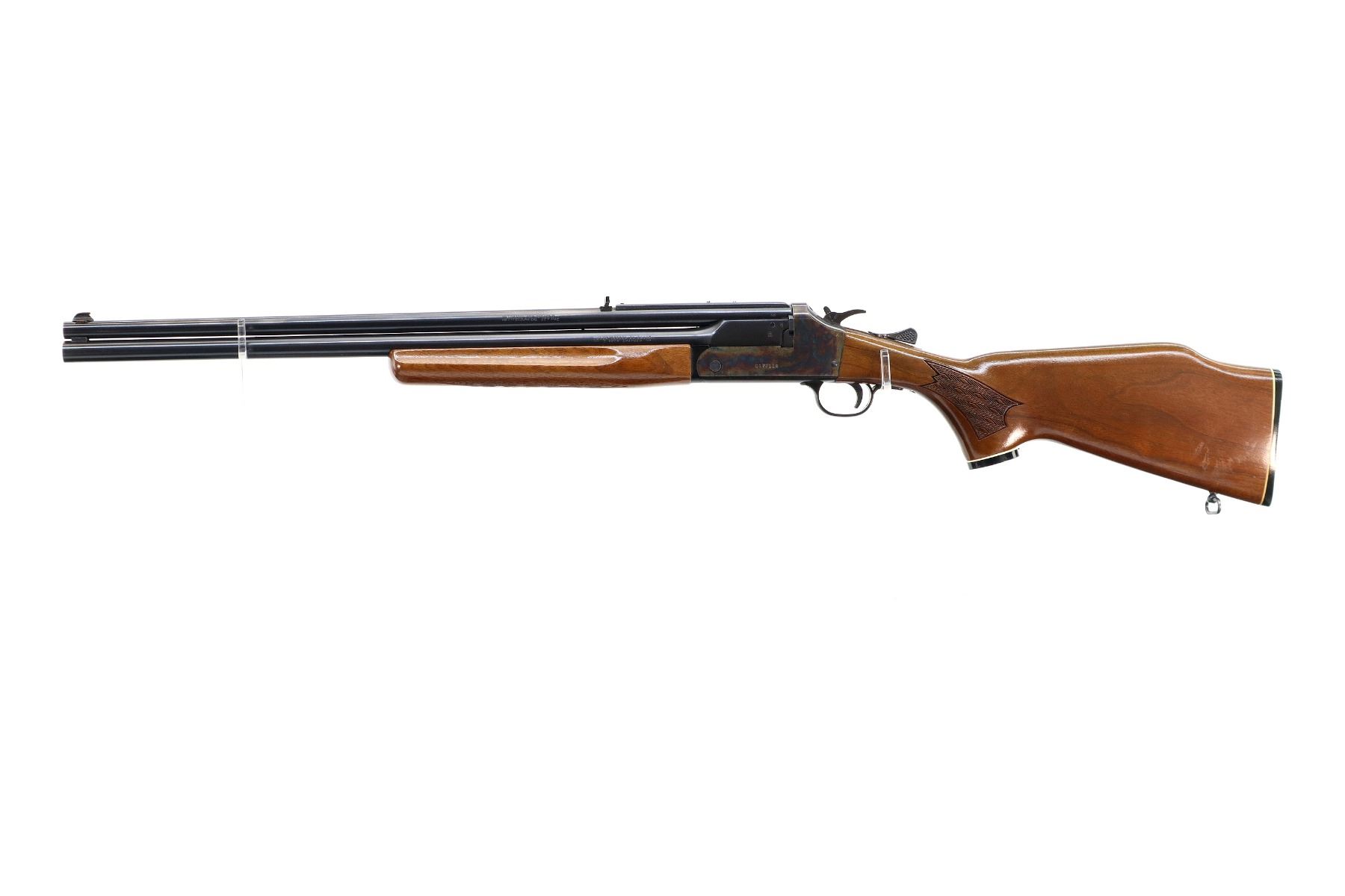 Main Description: Blade front sight, adjustable folding u notched rear sight, blued round barrels drilled and tapped at rear for scope mount with plug screws installed, colour case hardened receiver, grooved spur hammer with barrel selector. Two piece wood stocks, finger grooved checkered forearm and pistol grip, stock cracked on left side behind receiver, raised comb, grooved black polymer butt plate, grip cap, rear sling swivel only.