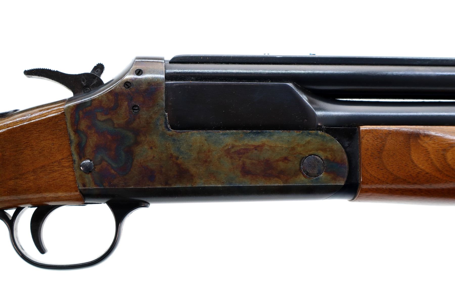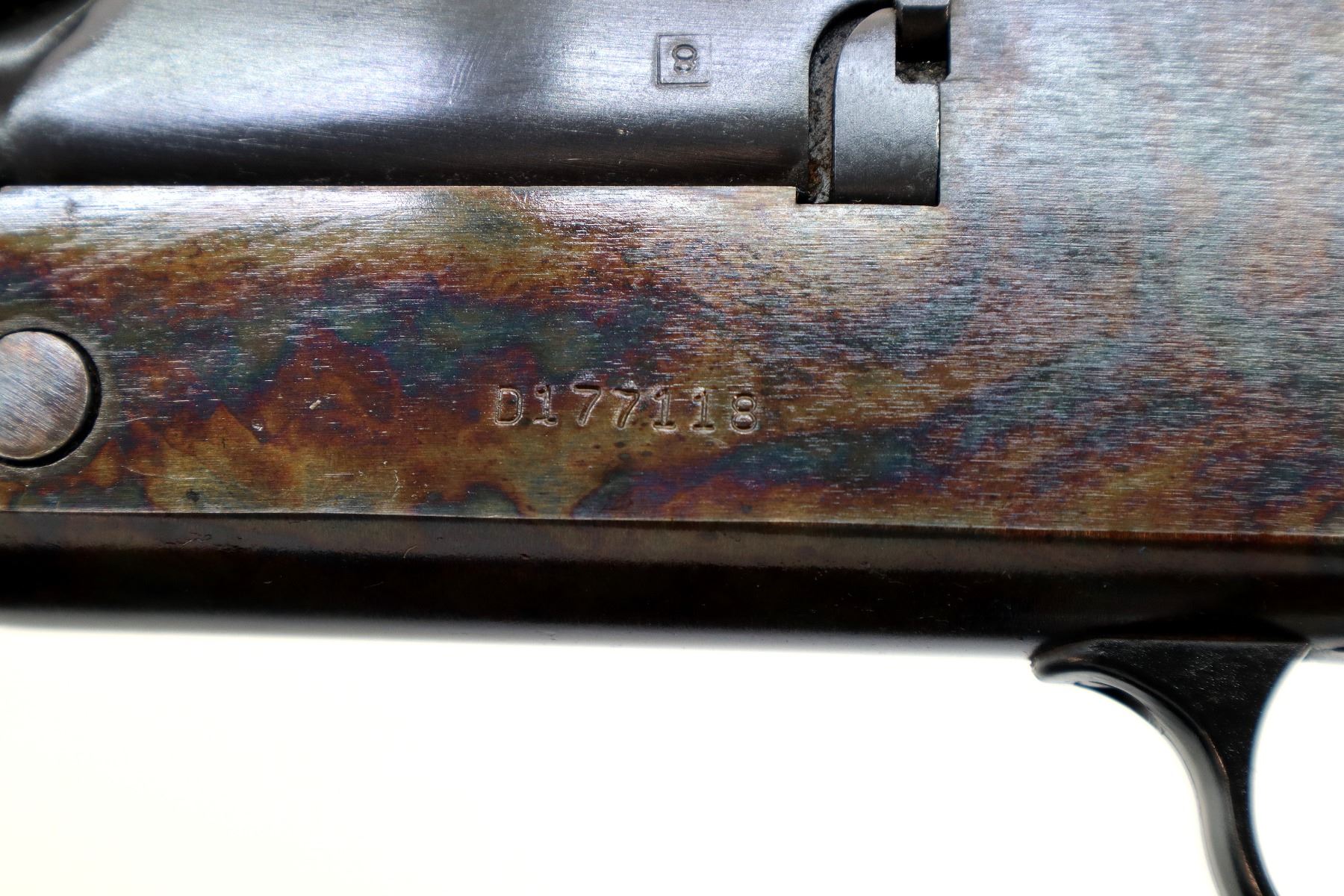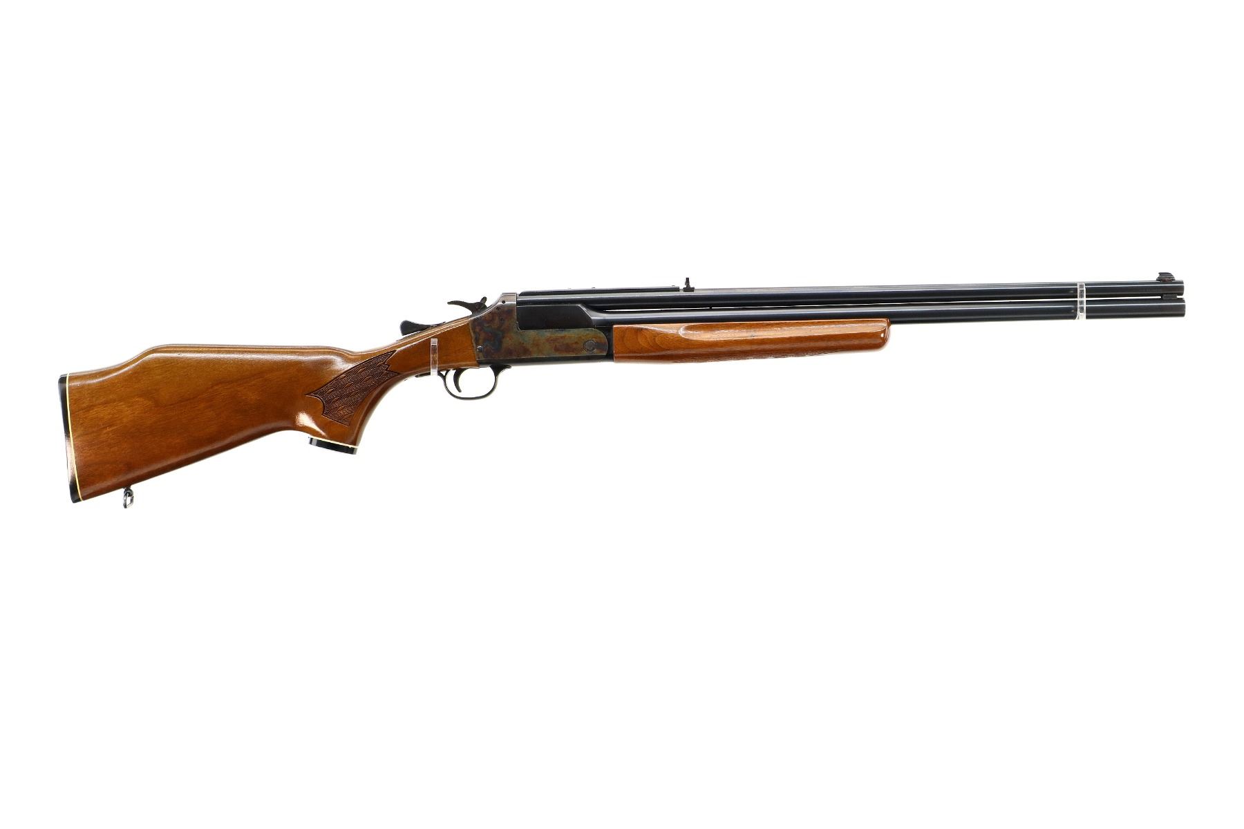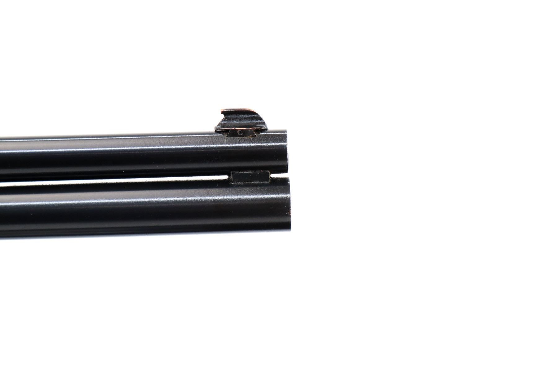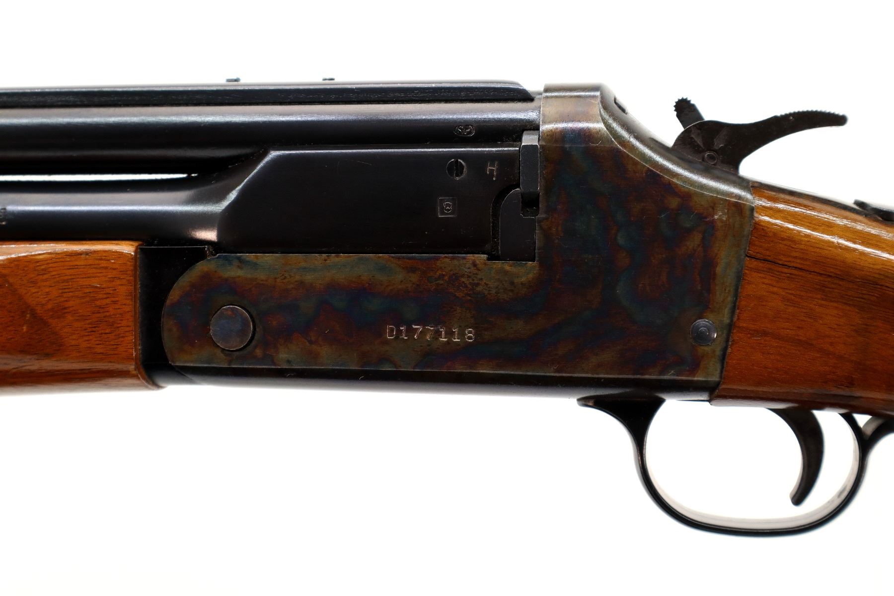 Main Description: Blade front sight, adjustable folding u notched rear sight, blued round barrels drilled and tapped at rear for scope mount with plug screws installed, colour case hardened receiver, grooved spur hammer with barrel selector. Two piece wood stocks, finger grooved checkered forearm and pistol grip, stock cracked on left side behind receiver, raised comb, grooved black polymer butt plate, grip cap, rear sling swivel only.