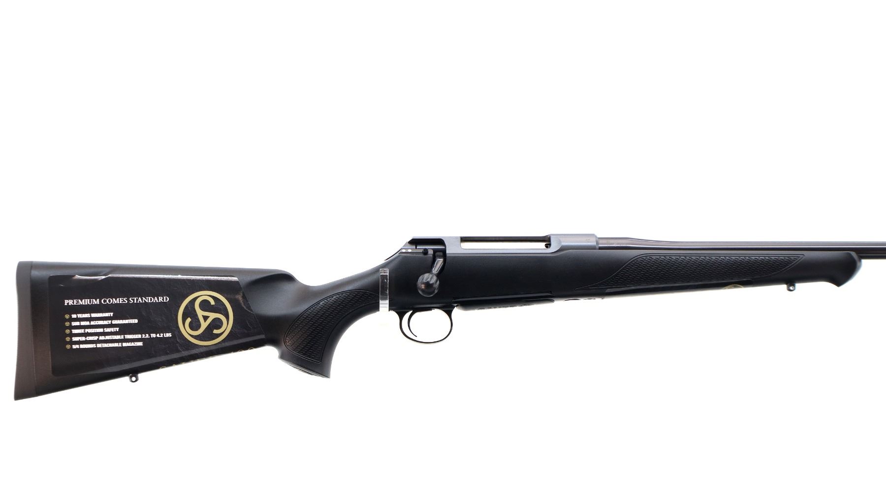 Main Description: No sights, blued tapered round barrel, Satin finish receiver drilled and tapped with no plug screws installed, grooved black polymer bolt knob. One piece black synthetic Ergo Max synthetic stock, checkered forearm and pistol grip panels with ambi palm swells, black rubber recoil pad, grip cap, swivel studs, retains factory stickers.