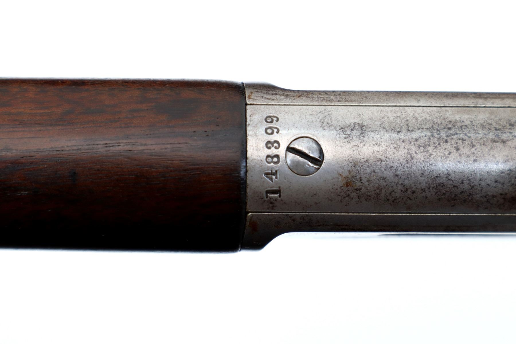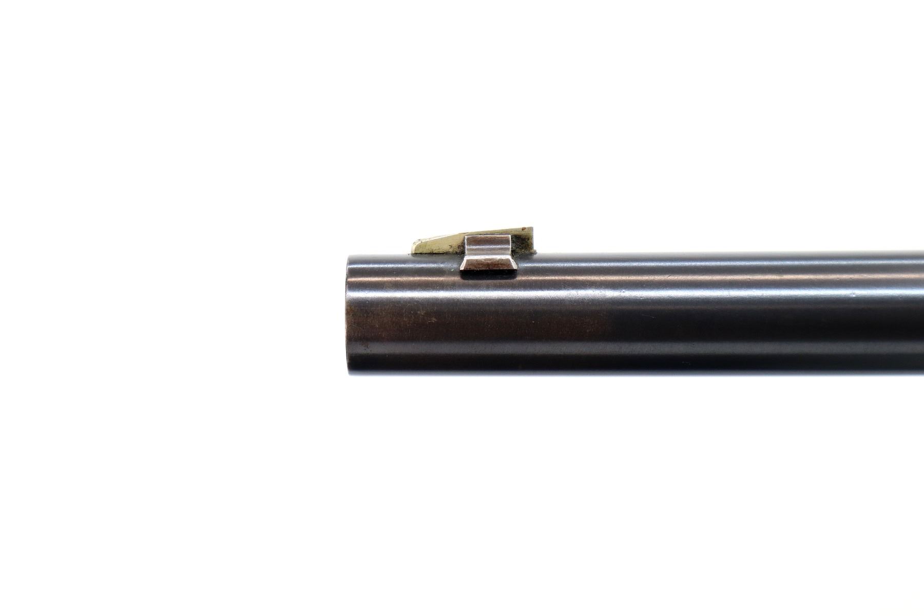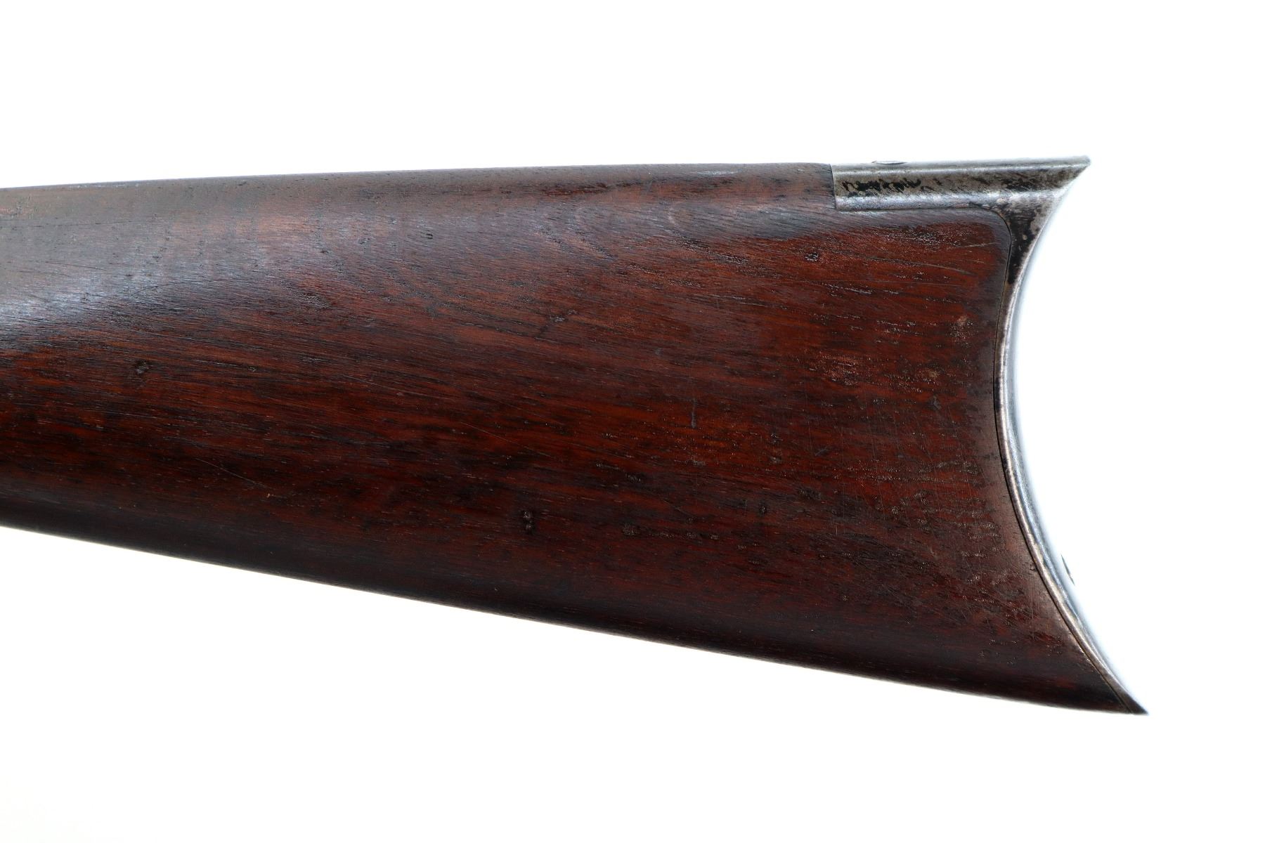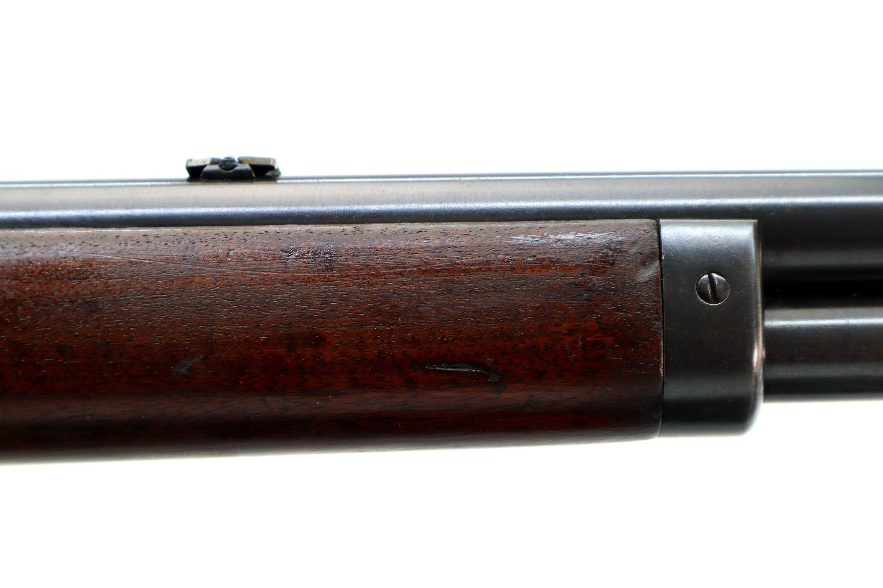 Main Description: Manufactured 1897. Blade front sight, folding flat leafed rear sight, blued round barrel, receiver drilled and tapped with Lyman 55A peep sight installed, checkered spur hammer. Two piece wood stocks, straight grip, smooth curved steel butt plate, half length magtube.