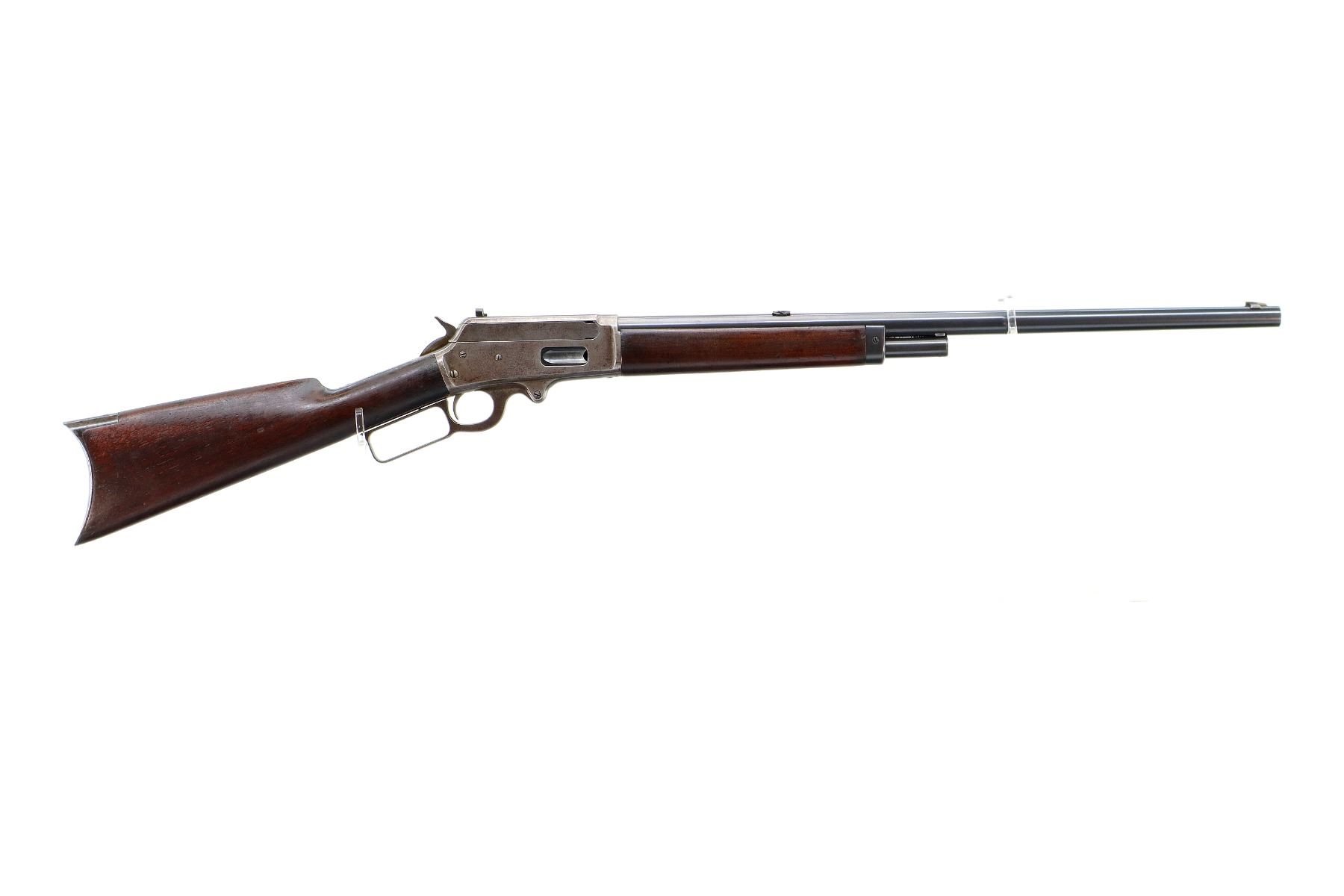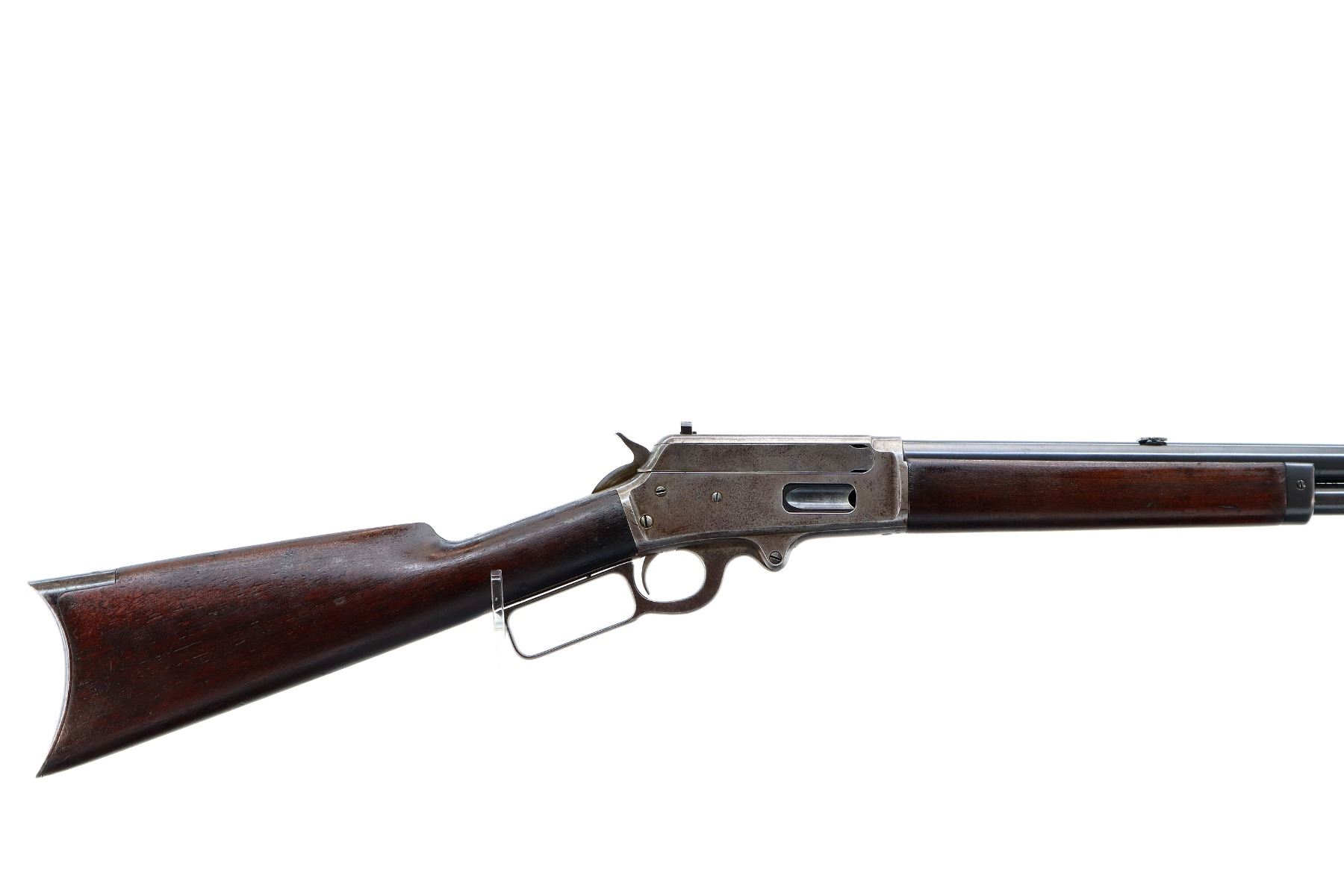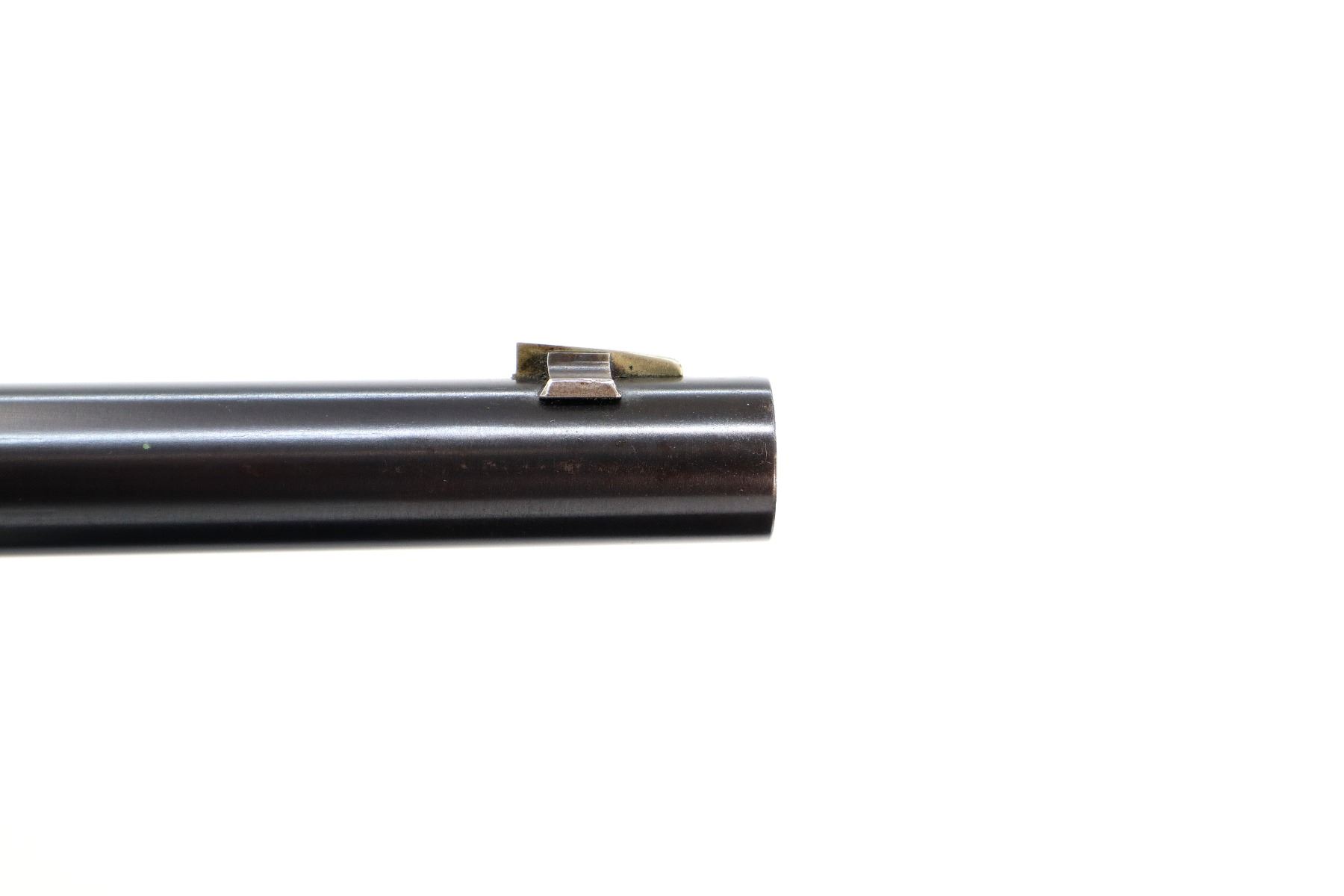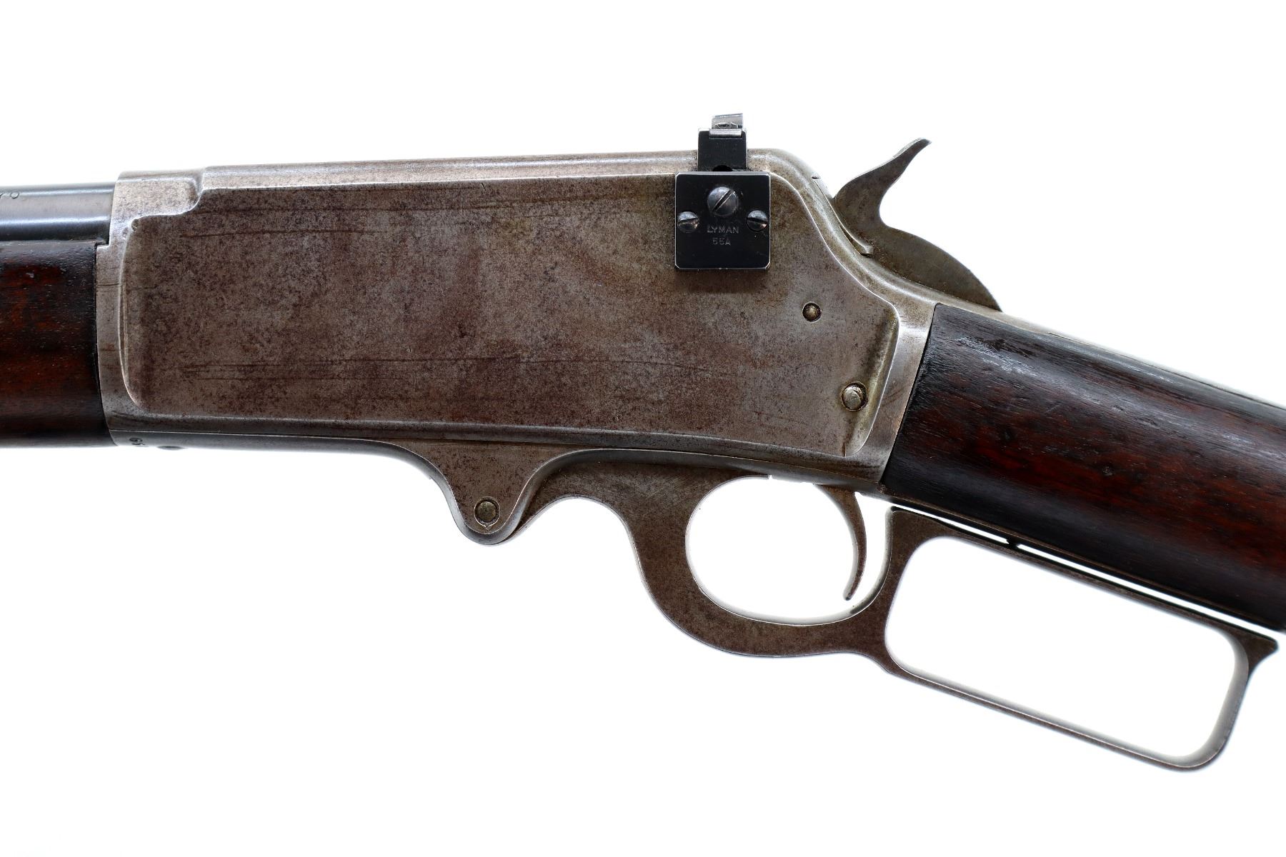 Main Description: Manufactured 1897. Blade front sight, folding flat leafed rear sight, blued round barrel, receiver drilled and tapped with Lyman 55A peep sight installed, checkered spur hammer. Two piece wood stocks, straight grip, smooth curved steel butt plate, half length magtube.