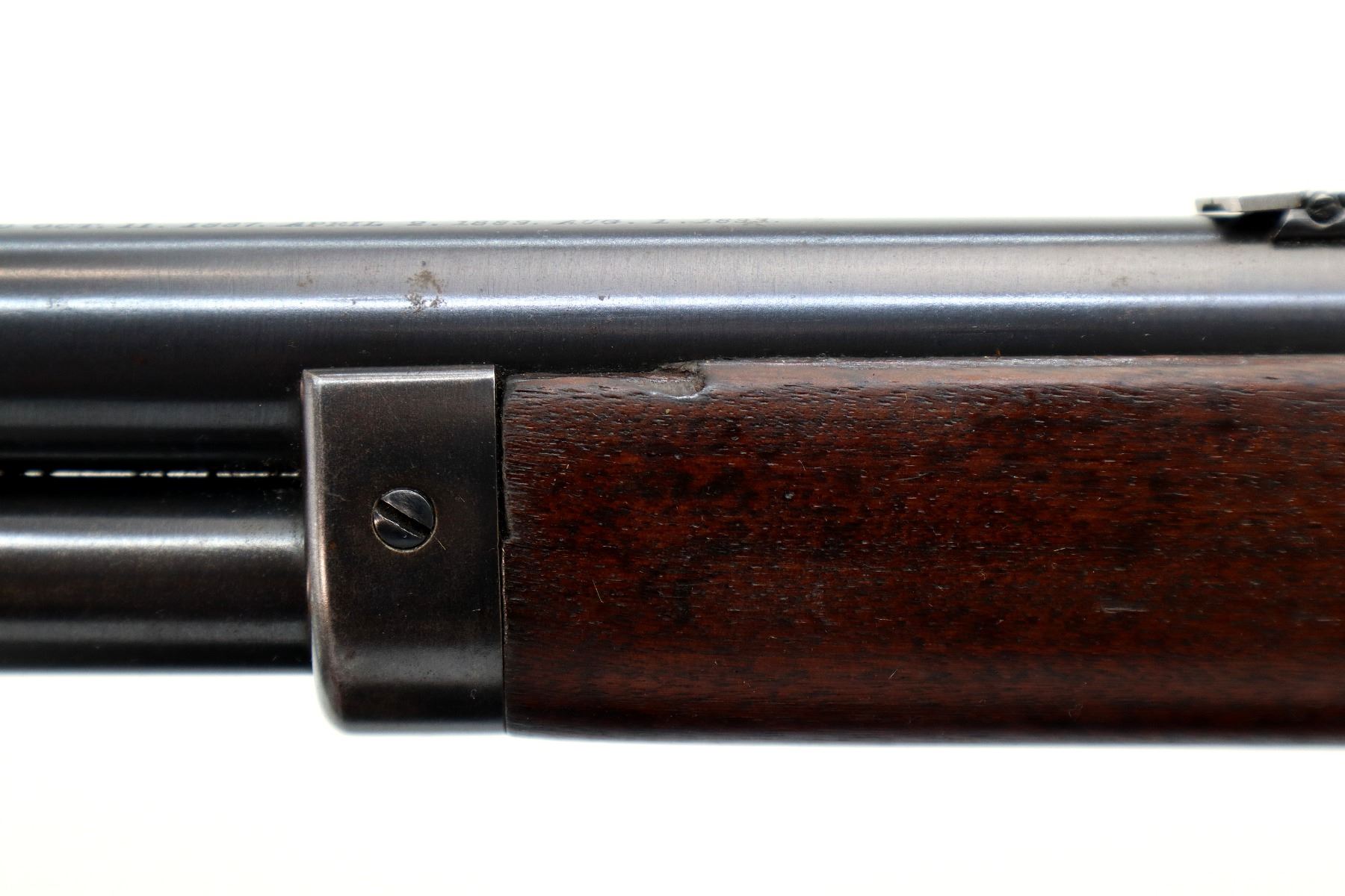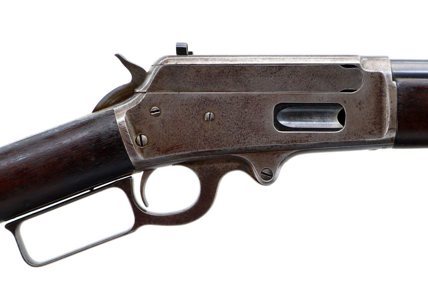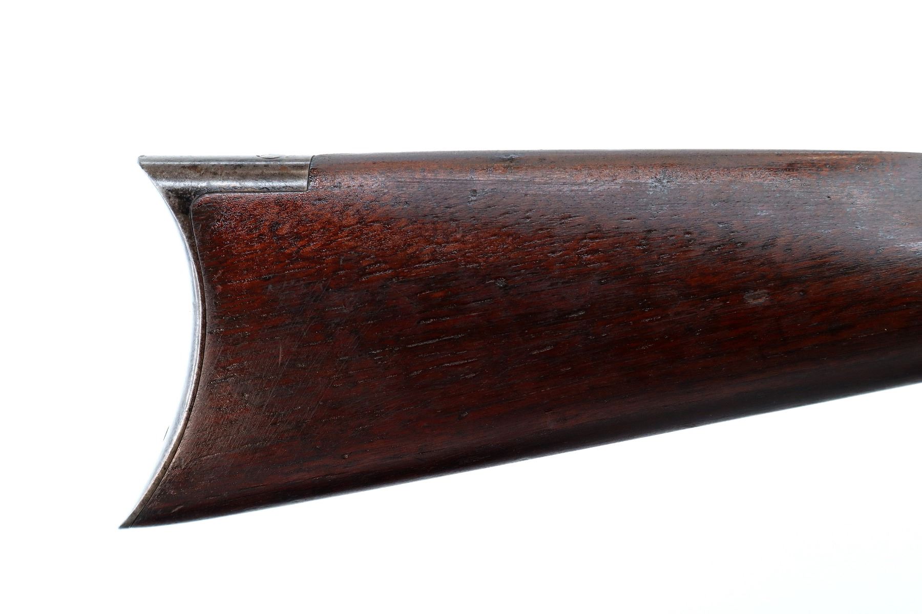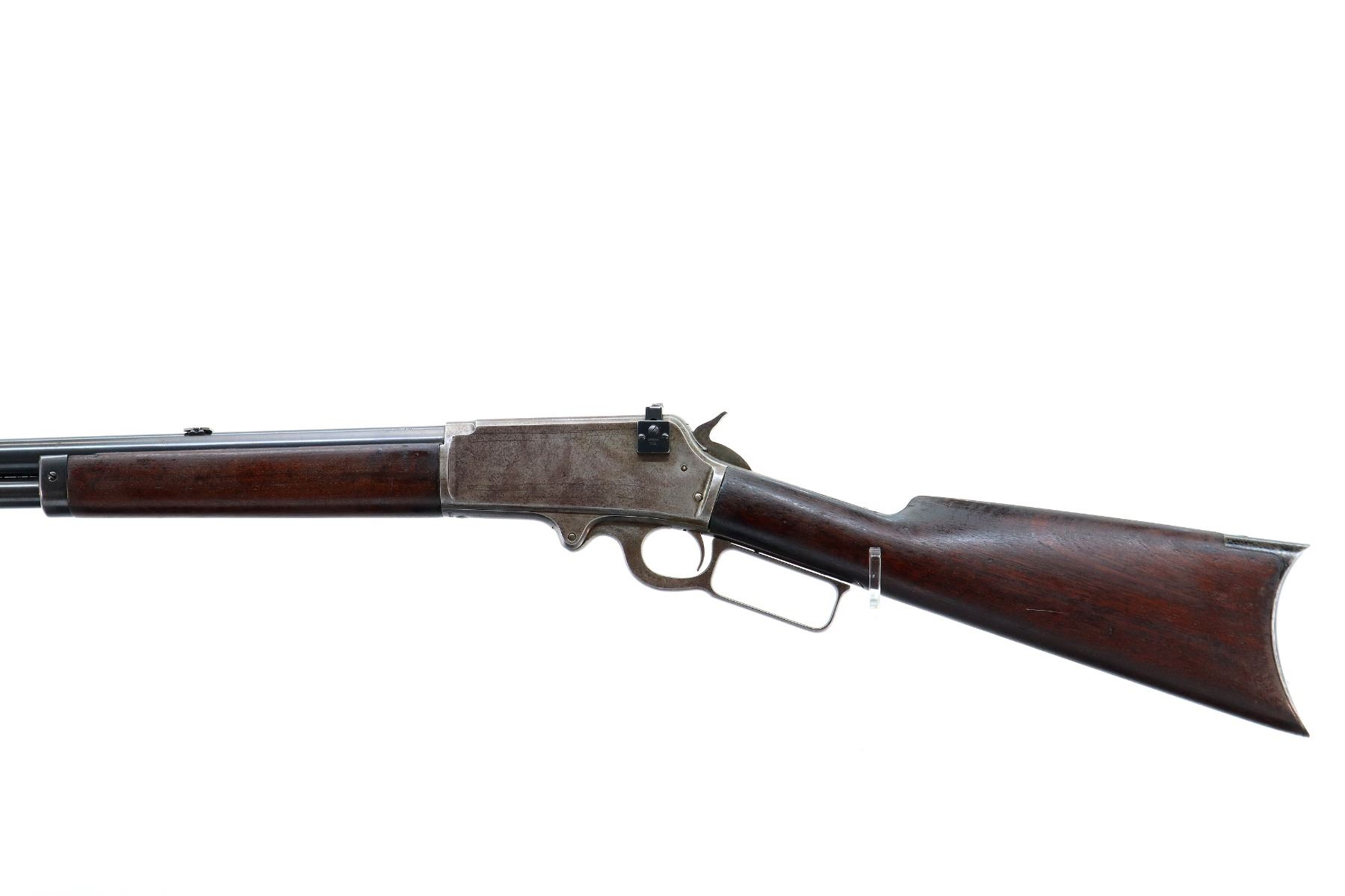 Main Description: Manufactured 1897. Blade front sight, folding flat leafed rear sight, blued round barrel, receiver drilled and tapped with Lyman 55A peep sight installed, checkered spur hammer. Two piece wood stocks, straight grip, smooth curved steel butt plate, half length magtube.