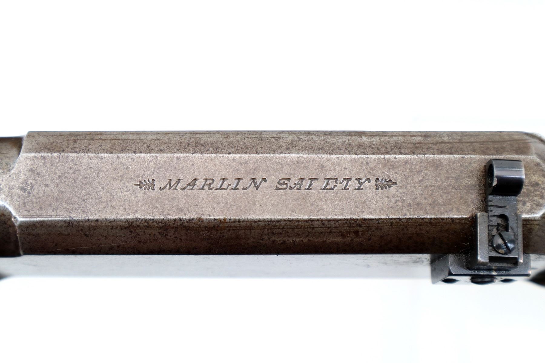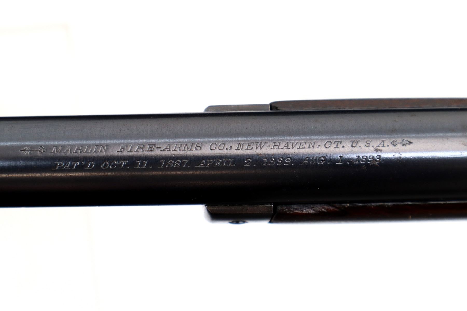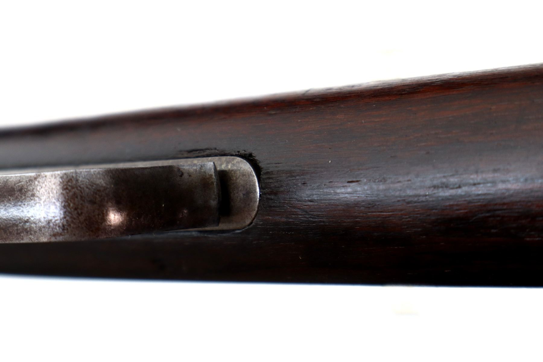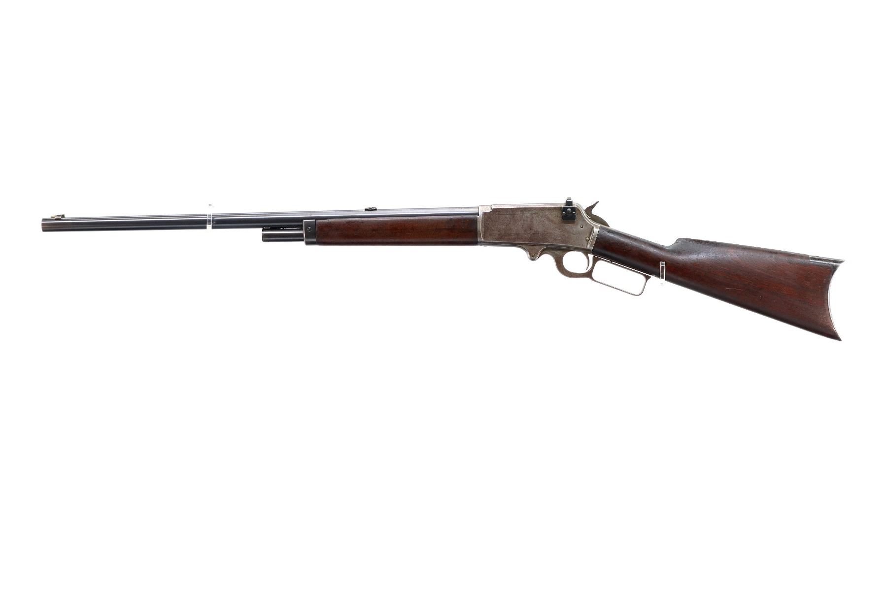 Main Description: Manufactured 1897. Blade front sight, folding flat leafed rear sight, blued round barrel, receiver drilled and tapped with Lyman 55A peep sight installed, checkered spur hammer. Two piece wood stocks, straight grip, smooth curved steel butt plate, half length magtube.