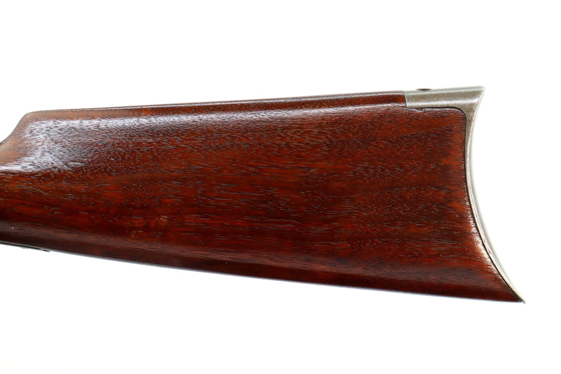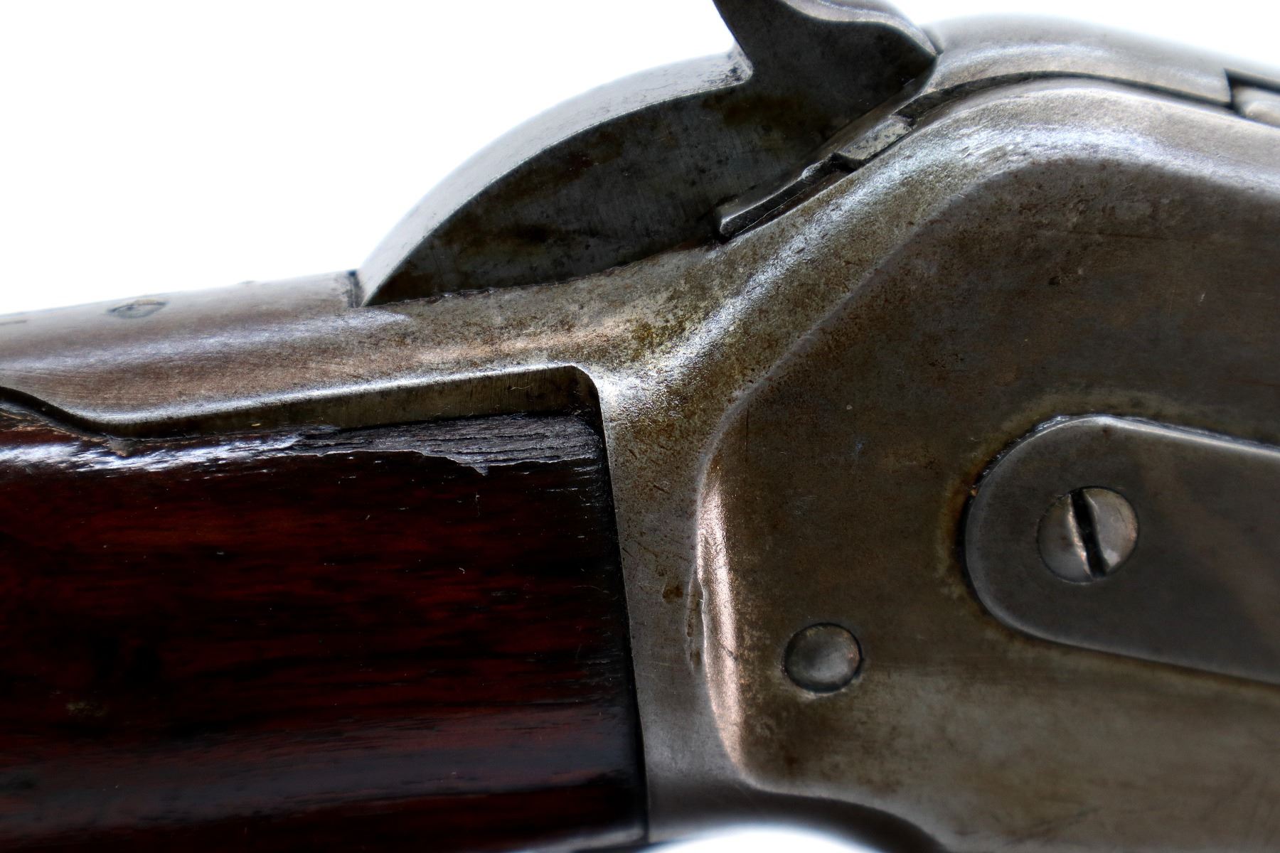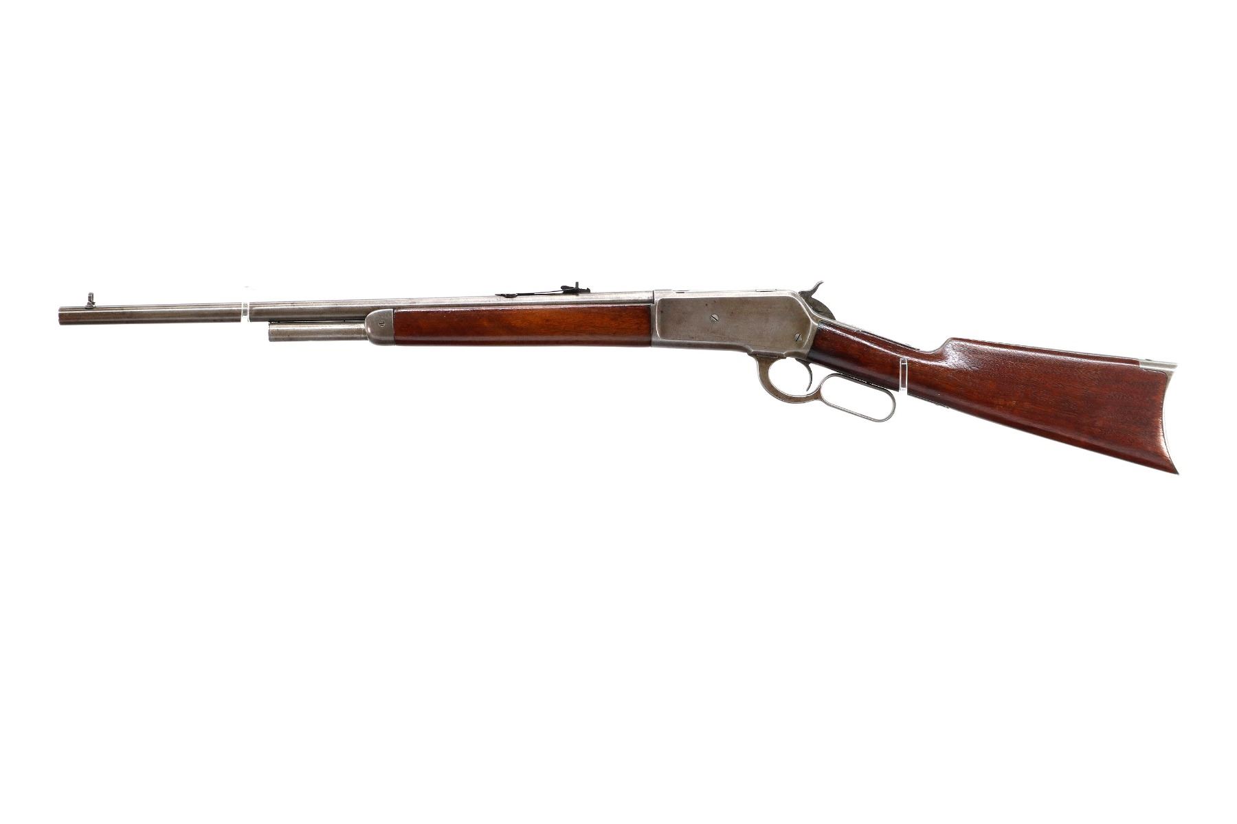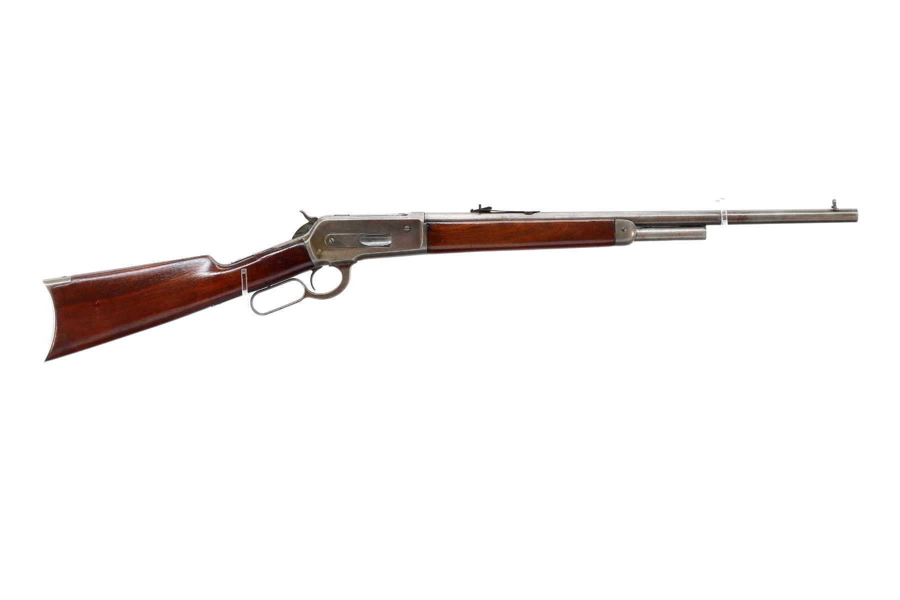 Main Description: Manufactured 1896. USA Antique. Consignor states: this rifle has a custom modified barrel from a Martini Henry installed. Folding front sight with one blade and one post with hood, adjustable u notched rear sight, checkered spur hammer. Two piece refinished wood stocks, straight grip, chipped and cracked on right side, smooth curved steel butt plate, 2/3rd length magtube.