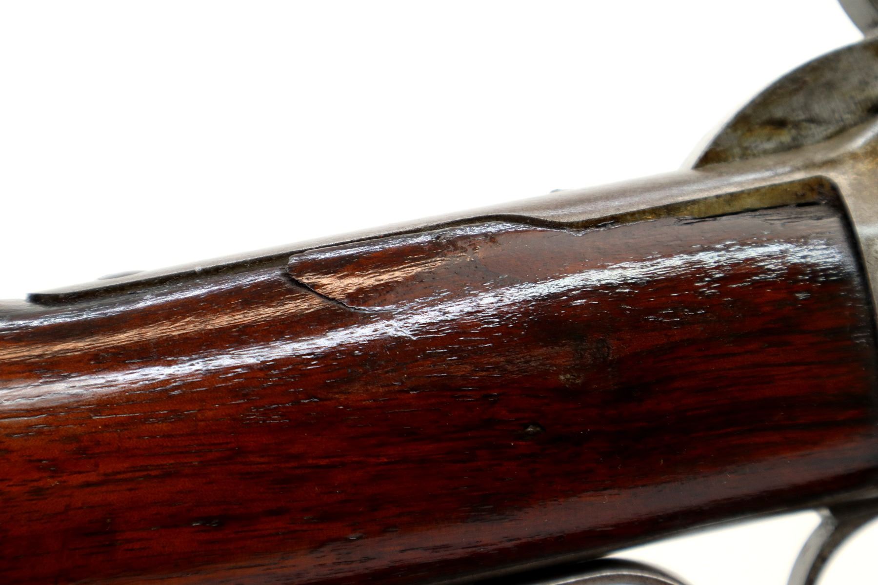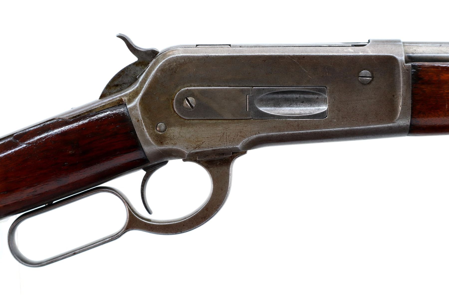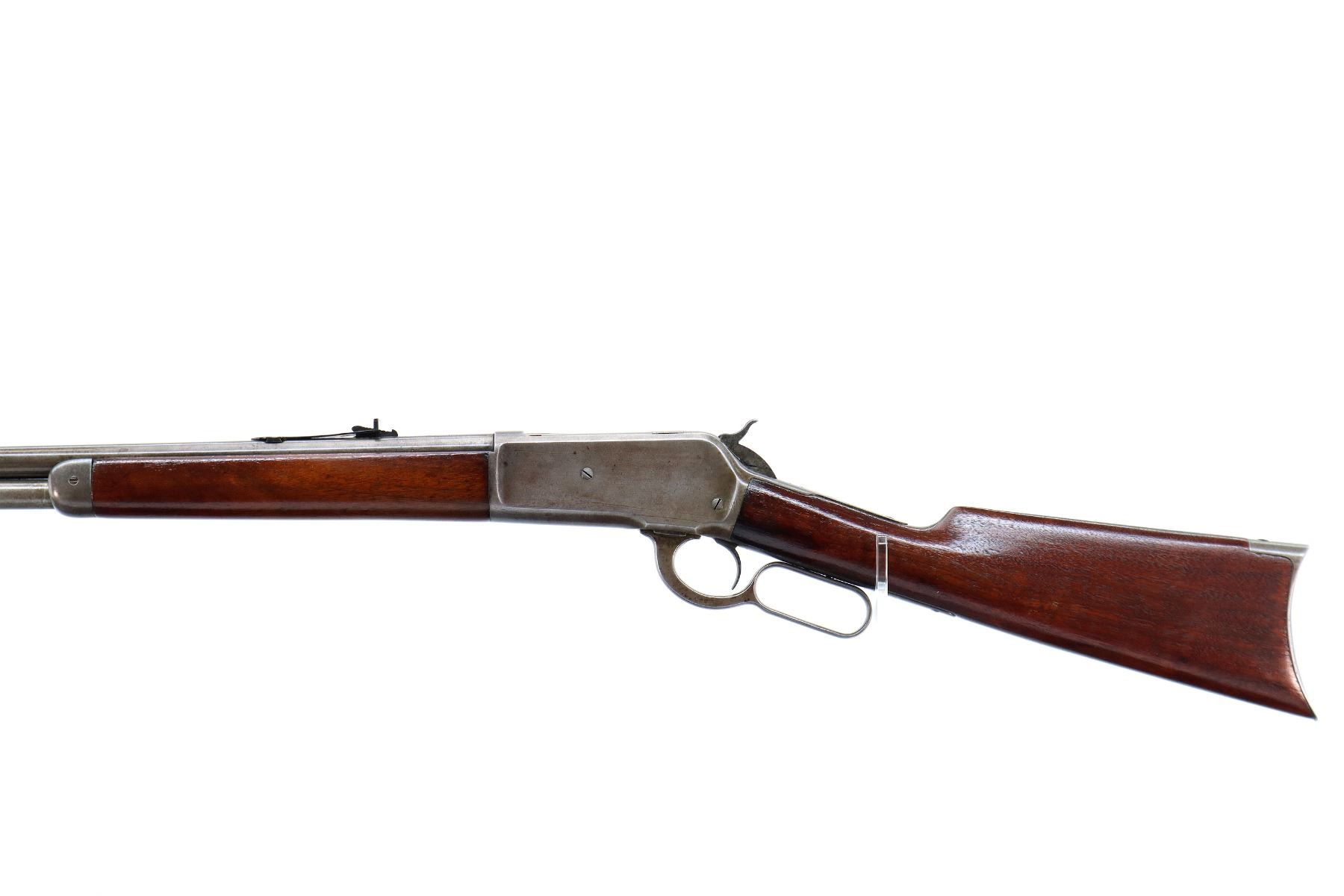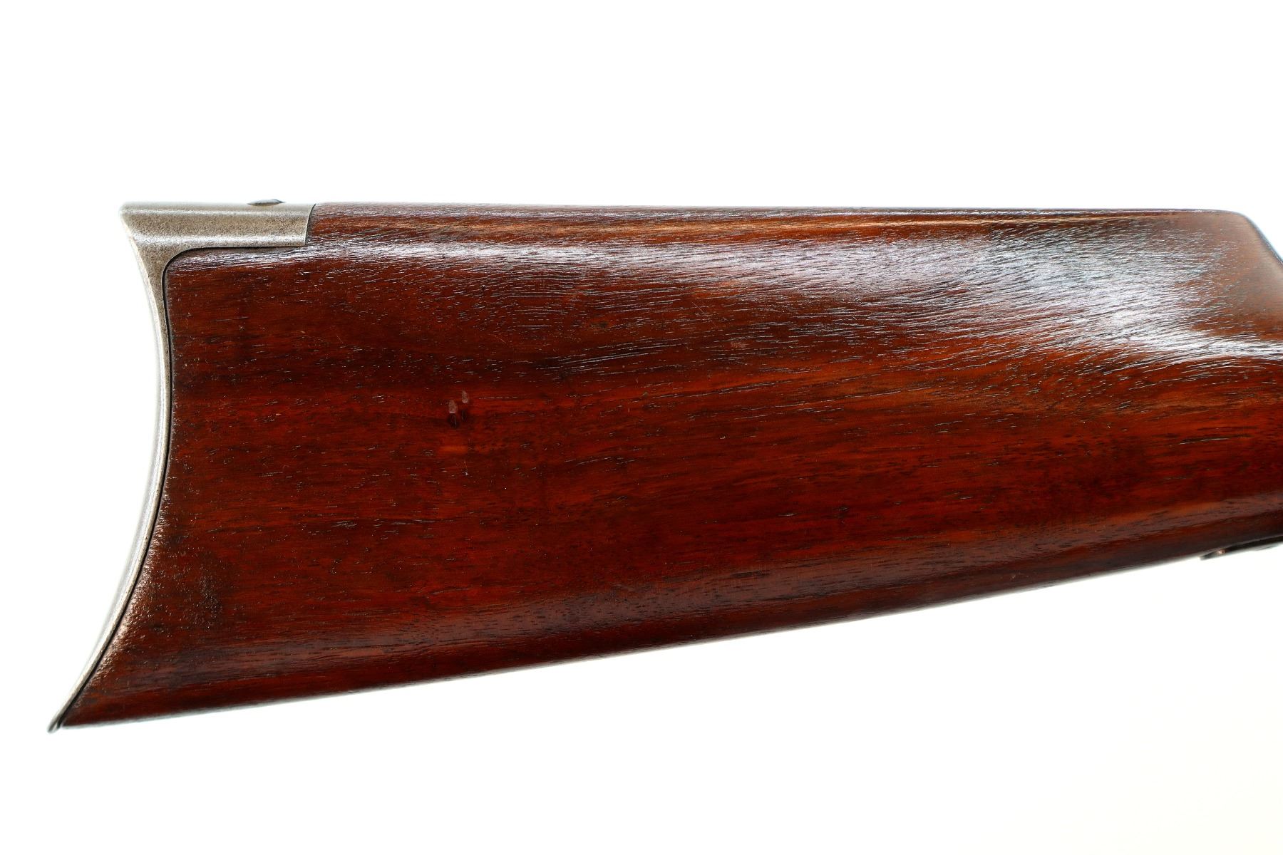 Main Description: Manufactured 1896. USA Antique. Consignor states: this rifle has a custom modified barrel from a Martini Henry installed. Folding front sight with one blade and one post with hood, adjustable u notched rear sight, checkered spur hammer. Two piece refinished wood stocks, straight grip, chipped and cracked on right side, smooth curved steel butt plate, 2/3rd length magtube.