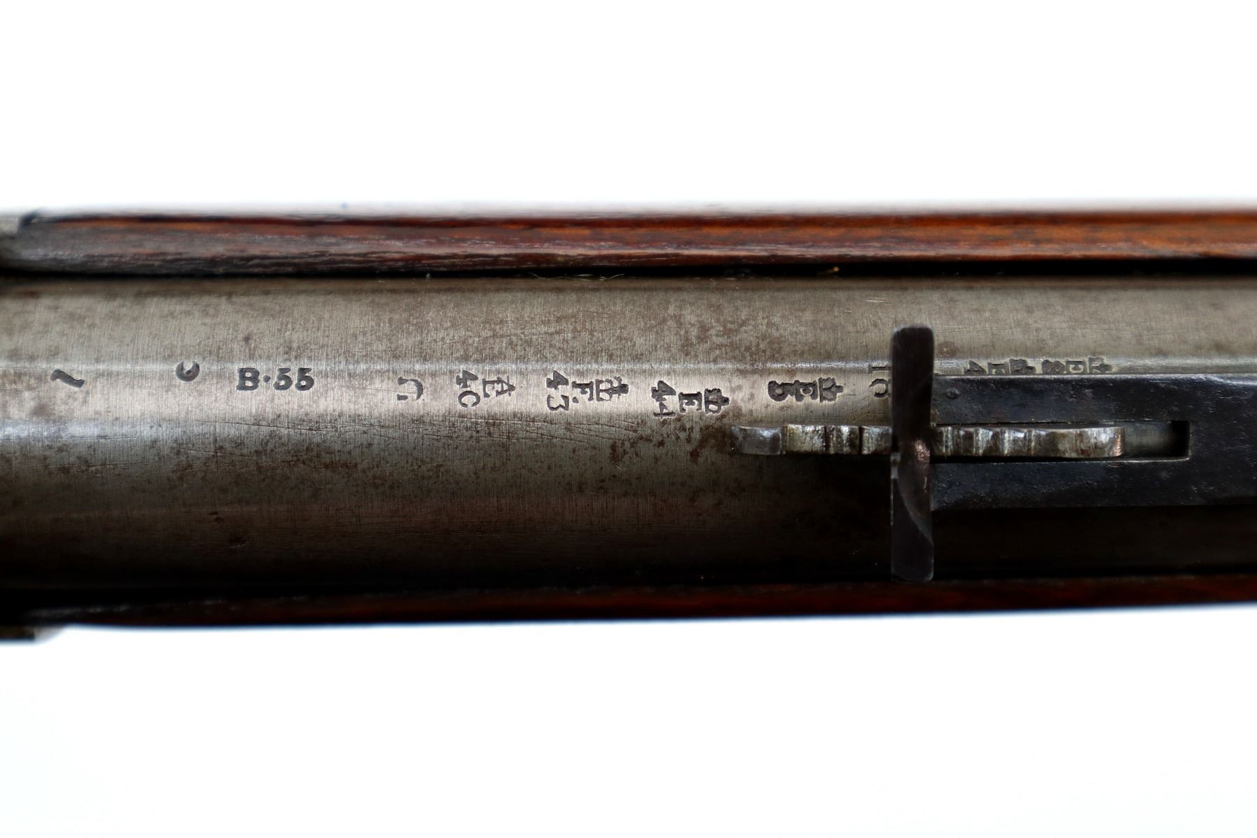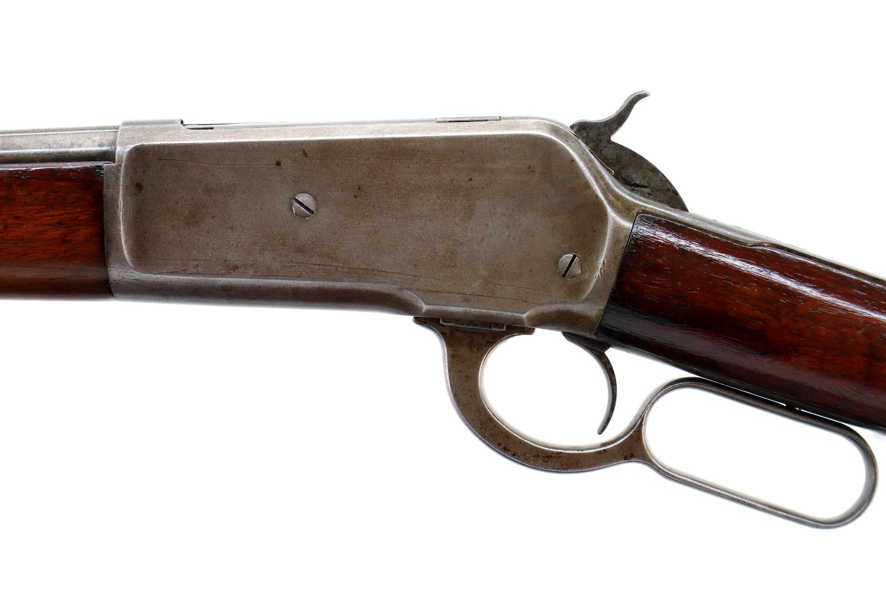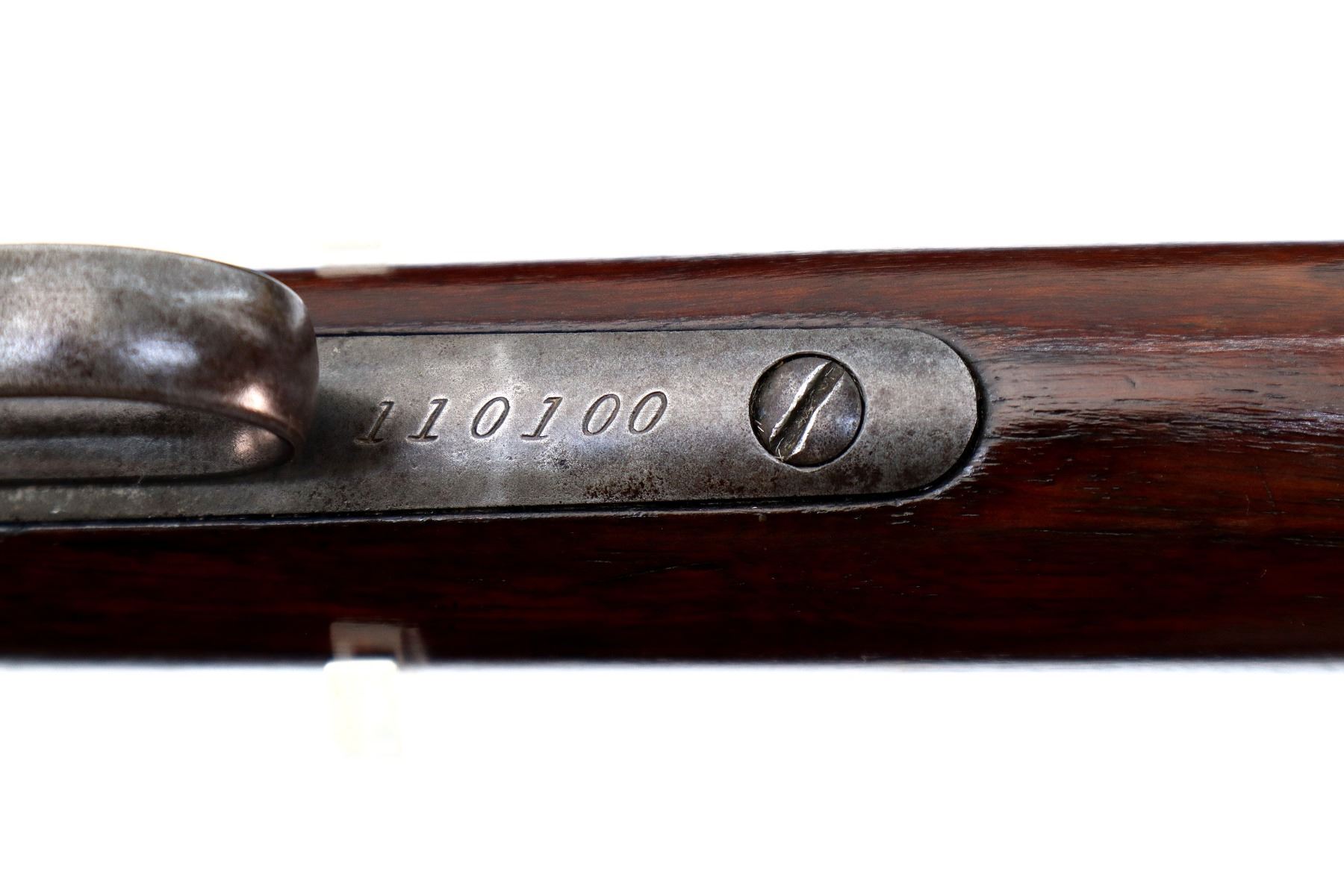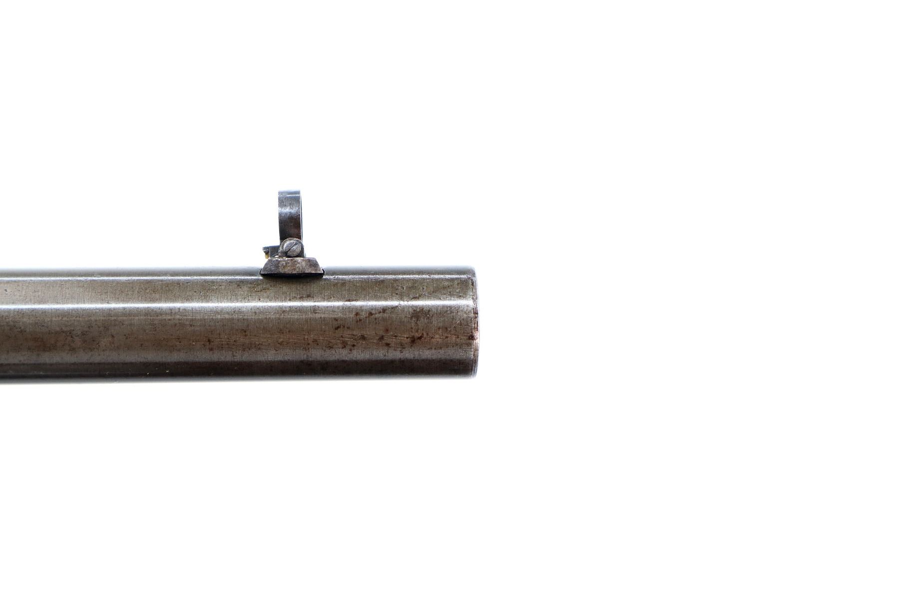 Main Description: Manufactured 1896. USA Antique. Consignor states: this rifle has a custom modified barrel from a Martini Henry installed. Folding front sight with one blade and one post with hood, adjustable u notched rear sight, checkered spur hammer. Two piece refinished wood stocks, straight grip, chipped and cracked on right side, smooth curved steel butt plate, 2/3rd length magtube.