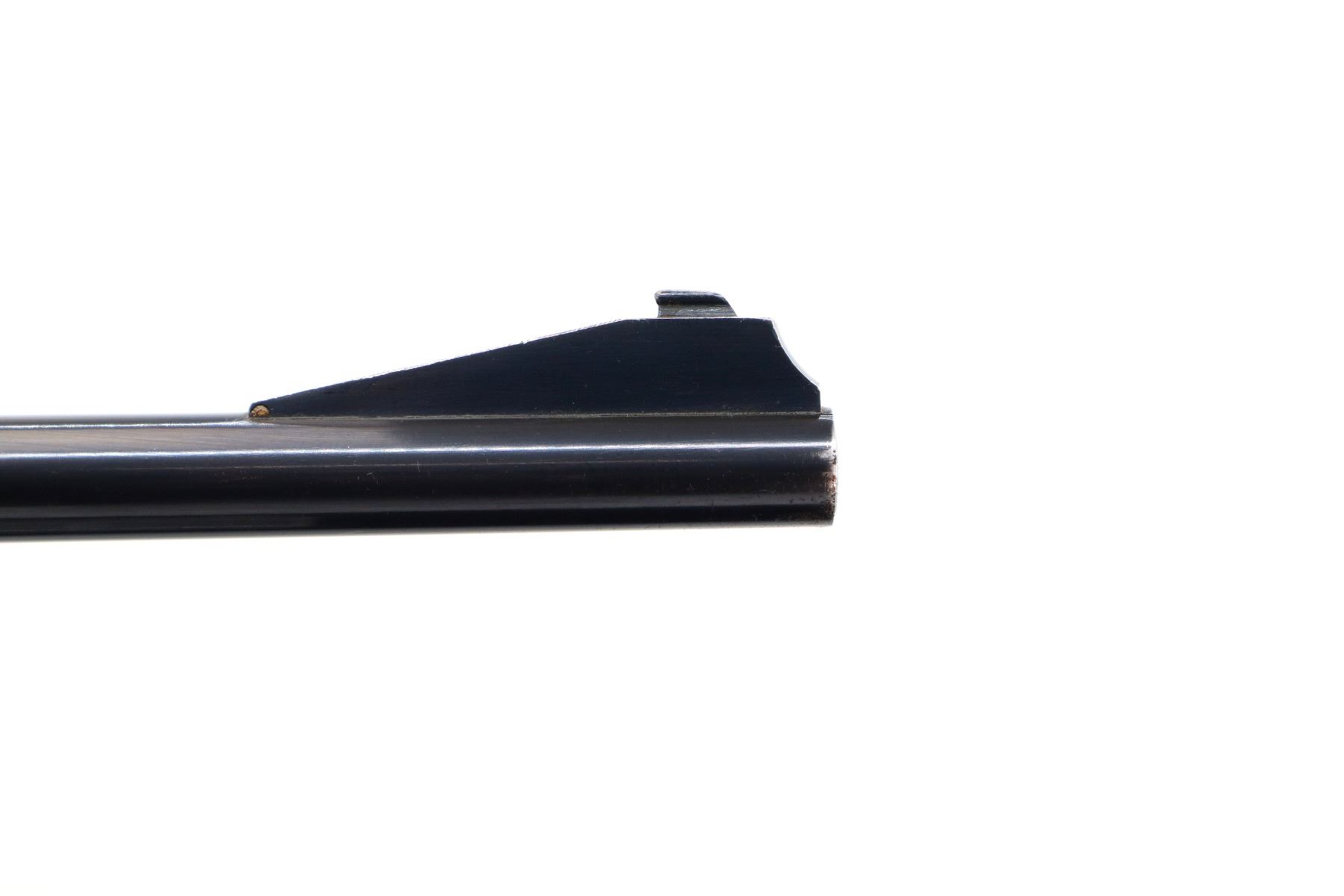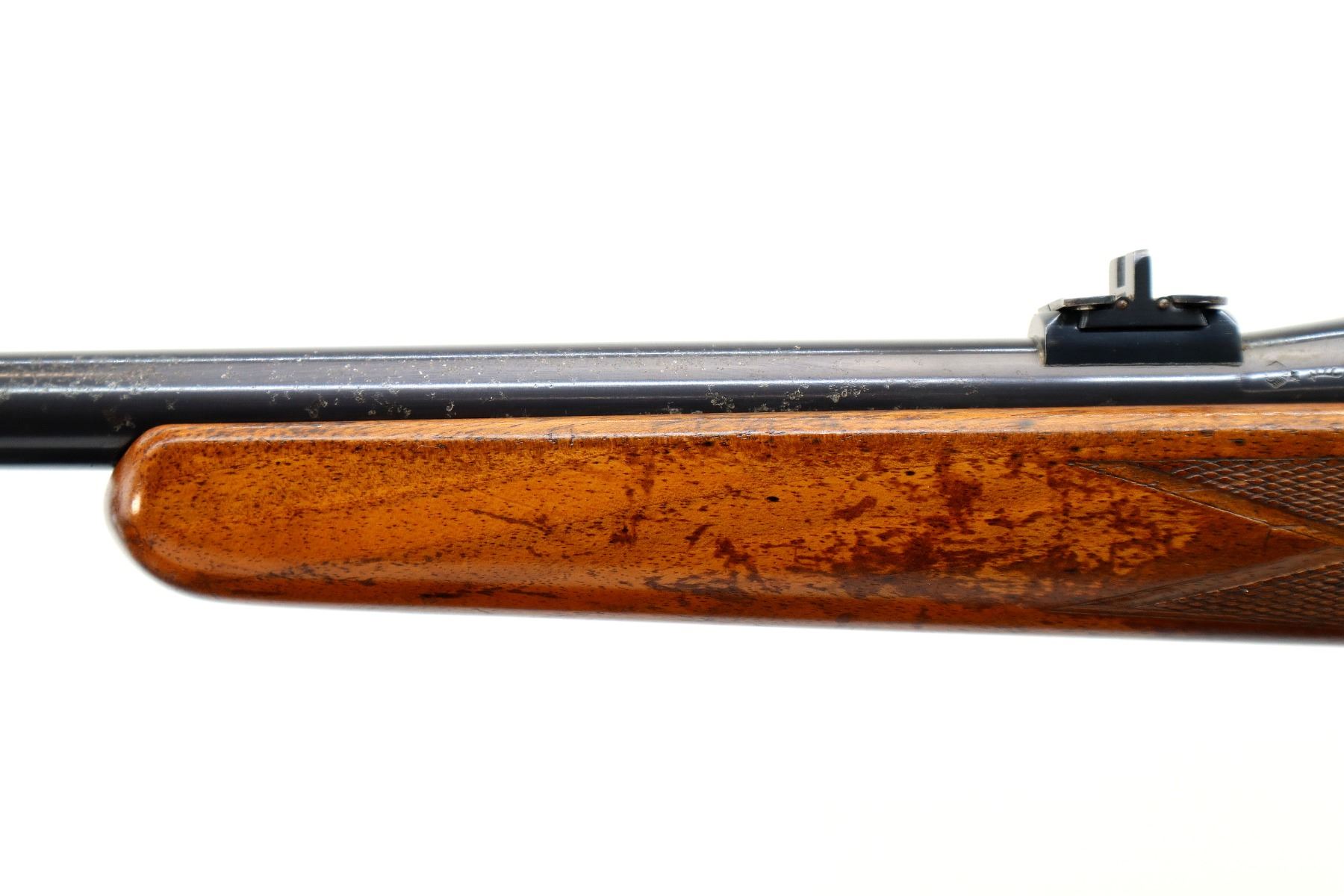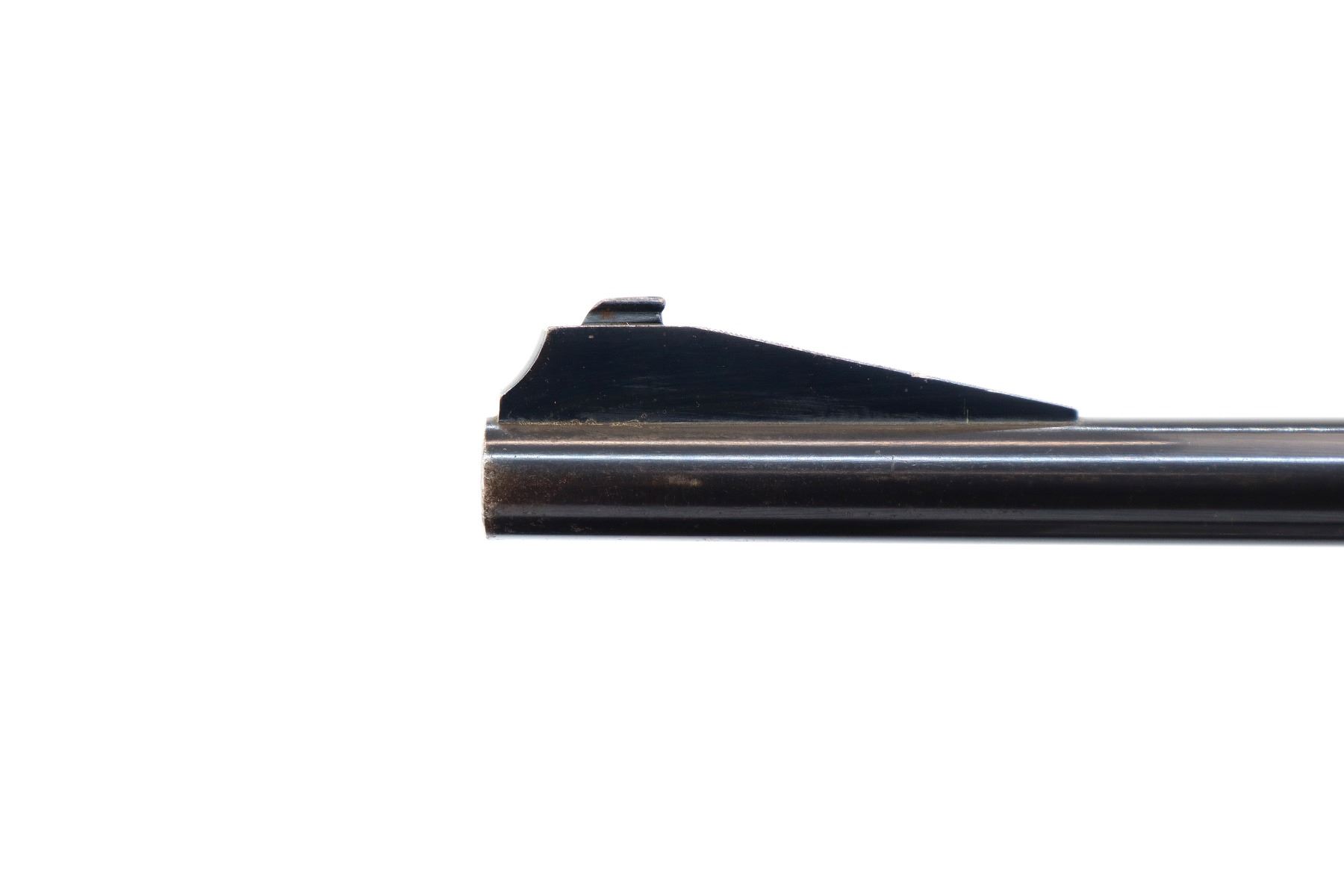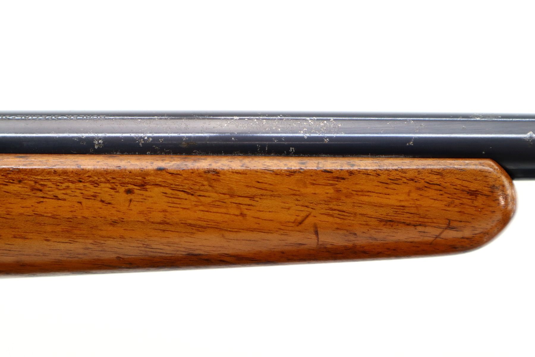Main Description: This rifle has the Walther Banner and ULM/DO on rear of barrel. Blade front sight with ramp, adjustable u notched rear sight, one fixed and two folding leafs, blued finish, receiver drilled and tapped with plug screws installed, silver bolt with swept back low scope bolt handle and smooth knob. One piece wood stock, checkered forearm and pistol grip, crossbolt safety above trigger, cheek rest, grooved black polymer butt plate which is broken, small chips at toe, grip cap, sling swivels