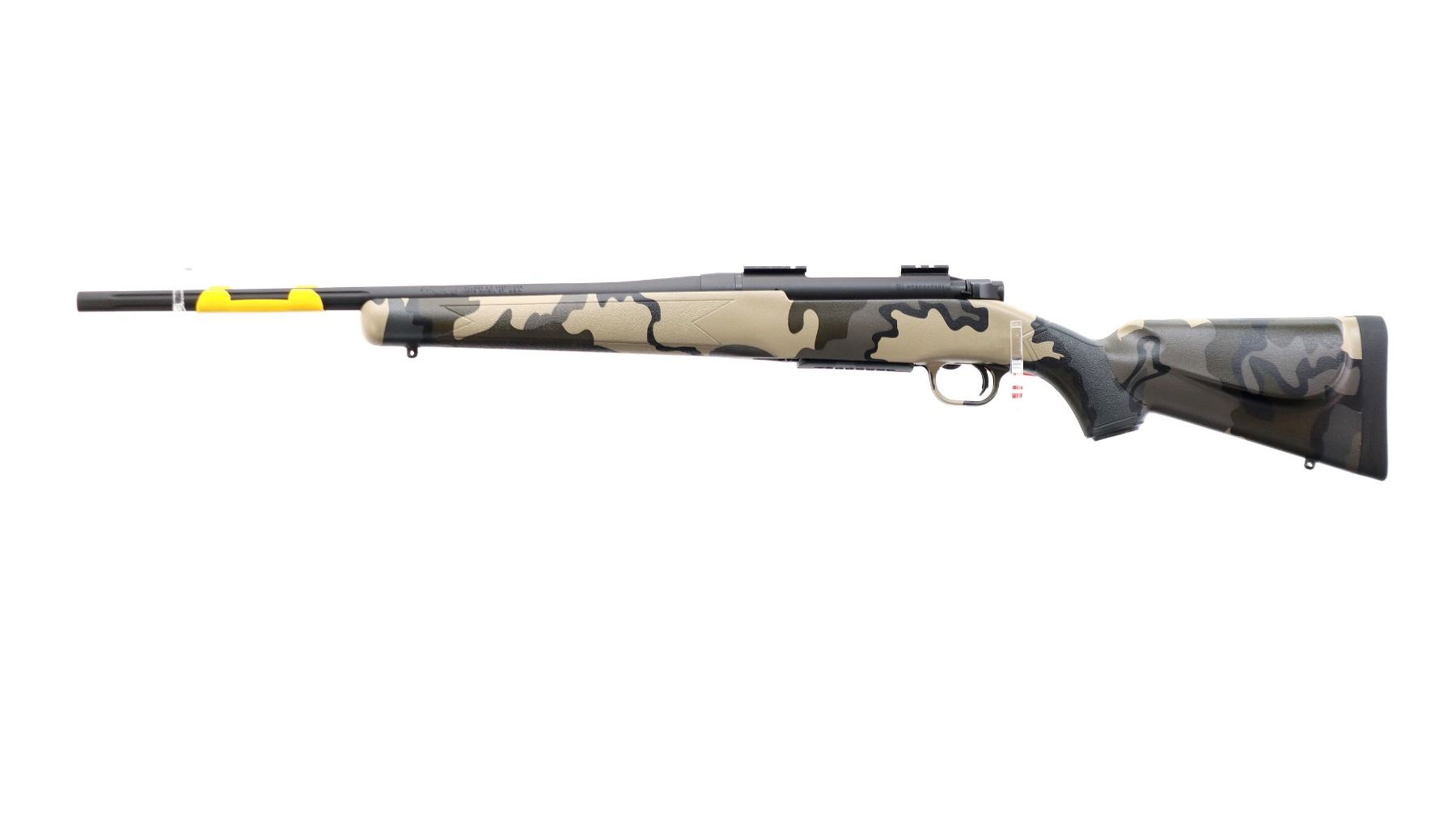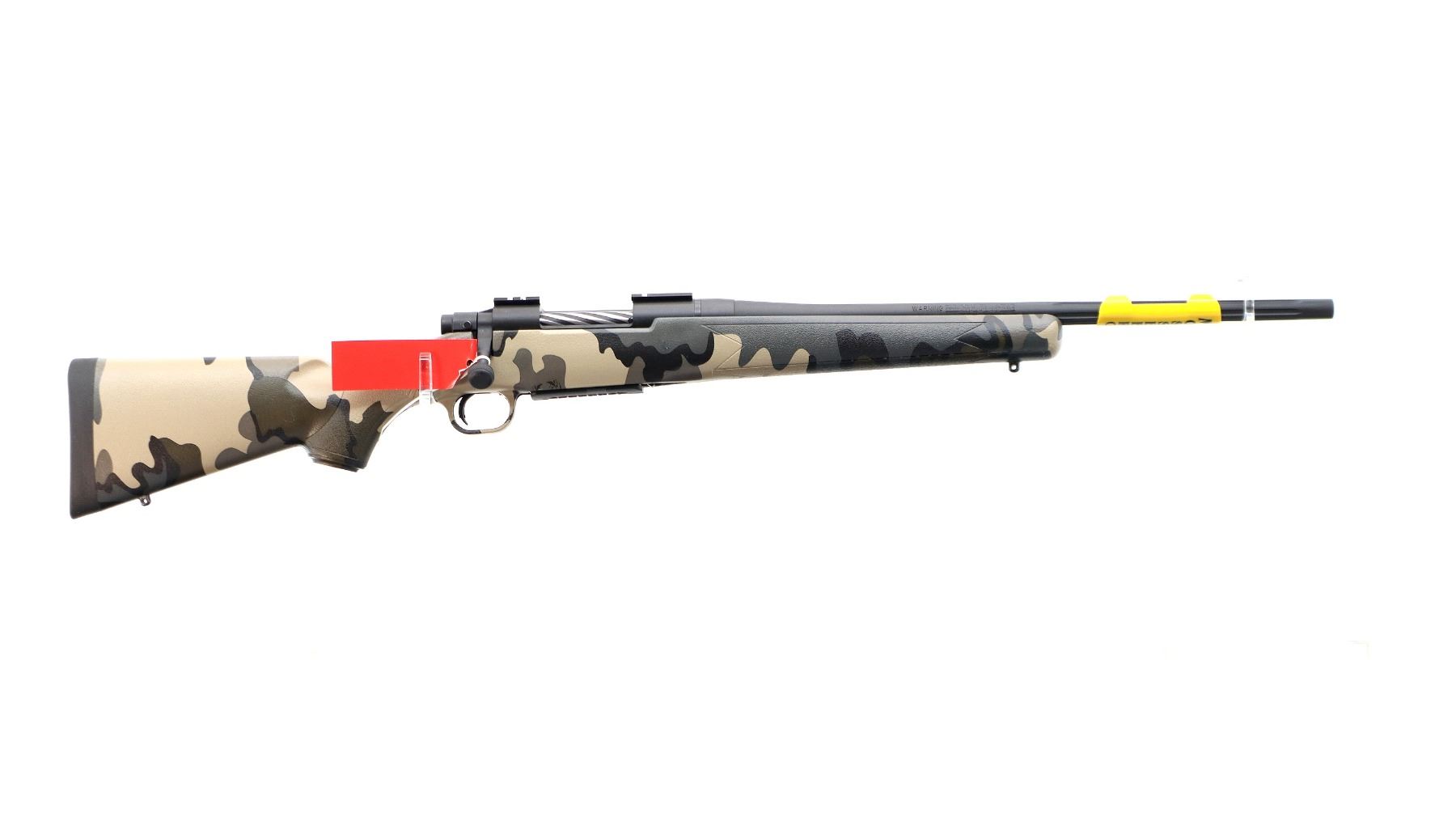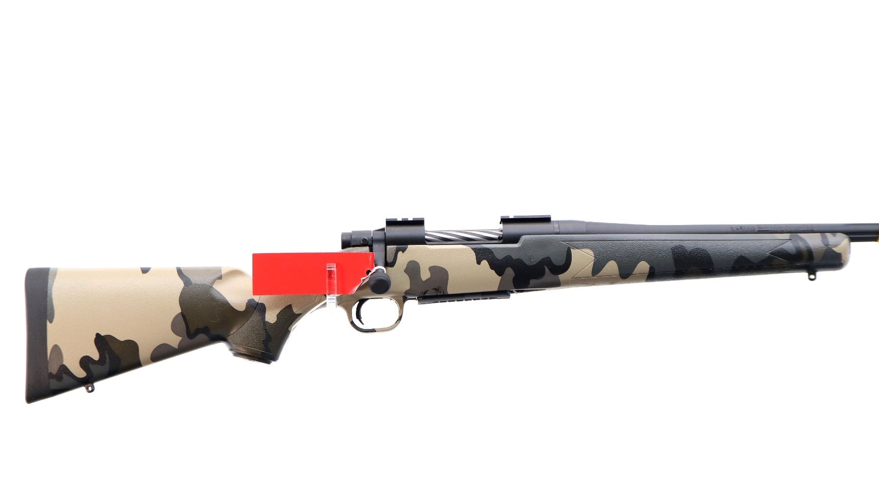 Main Description: No sights, Parkerized metal finish, fluted barrel, receiver drilled and tapped with two piece scope bases installed, fluted bolt with checkered knob. One piece Kuiu Camo Synthetic stock, textured forearm and pistol grip panels, cheek rest, black rubber recoil pad, 12.25" LOP, grip cap, swivel studs, retains factory tags. Accessories include: Spare Stock spacer and recoil pad with screws, trigger lock.