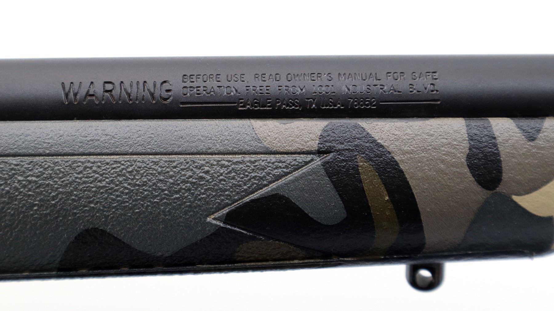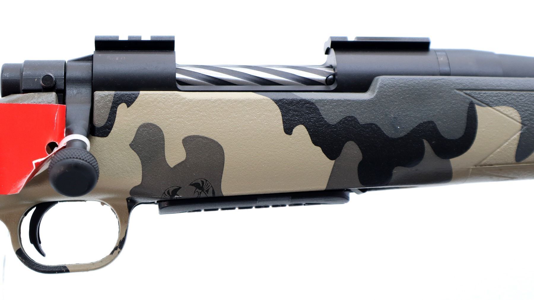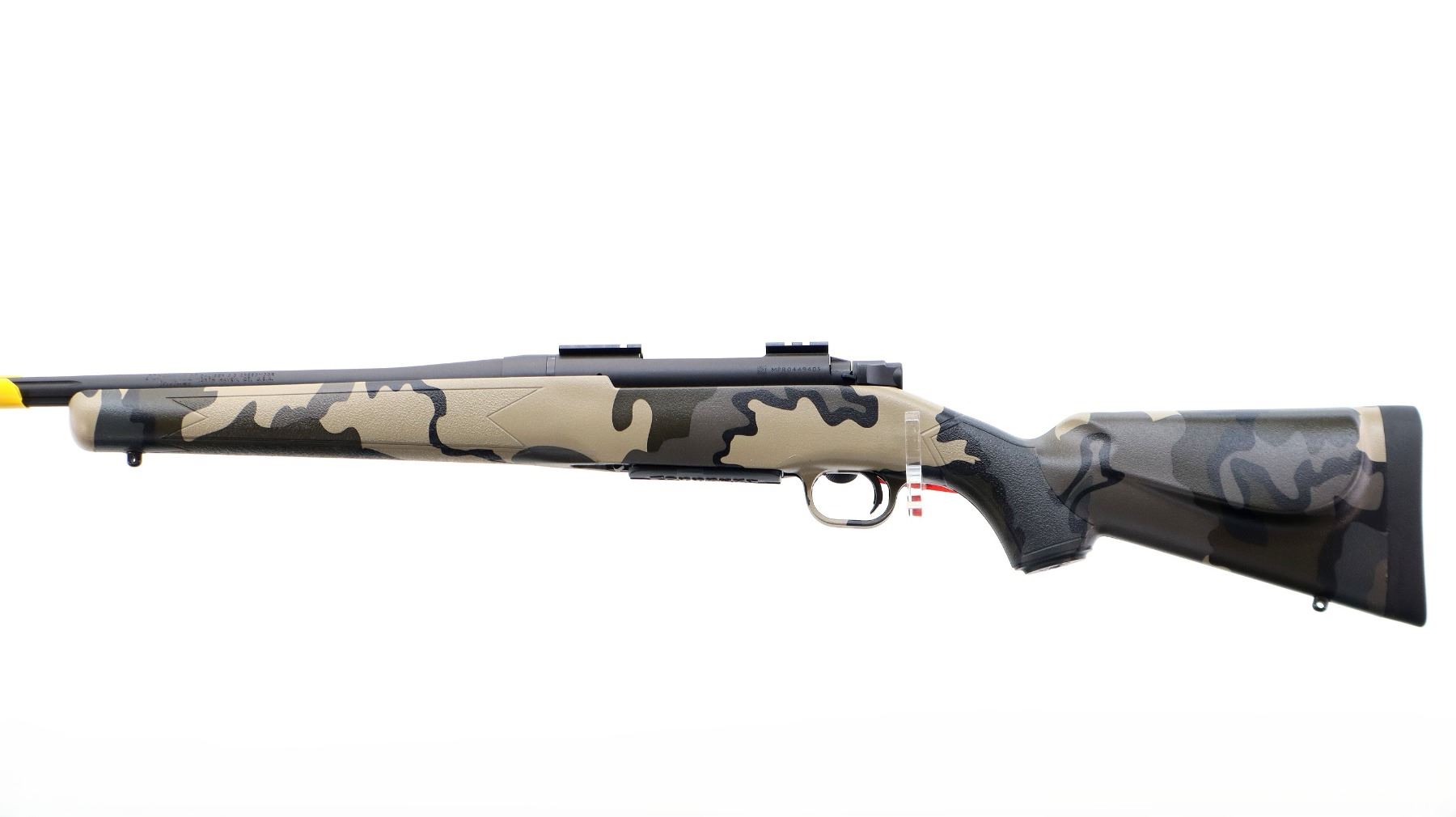 Main Description: No sights, Parkerized metal finish, fluted barrel, receiver drilled and tapped with two piece scope bases installed, fluted bolt with checkered knob. One piece Kuiu Camo Synthetic stock, textured forearm and pistol grip panels, cheek rest, black rubber recoil pad, 12.25" LOP, grip cap, swivel studs, retains factory tags. Accessories include: Spare Stock spacer and recoil pad with screws, trigger lock.