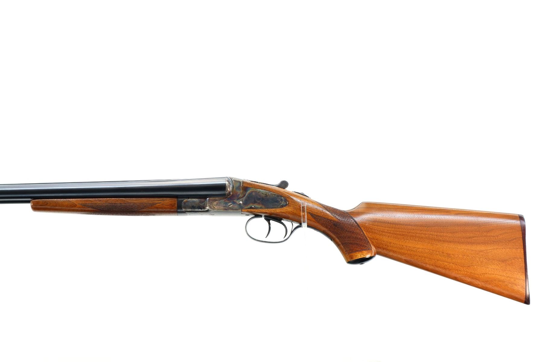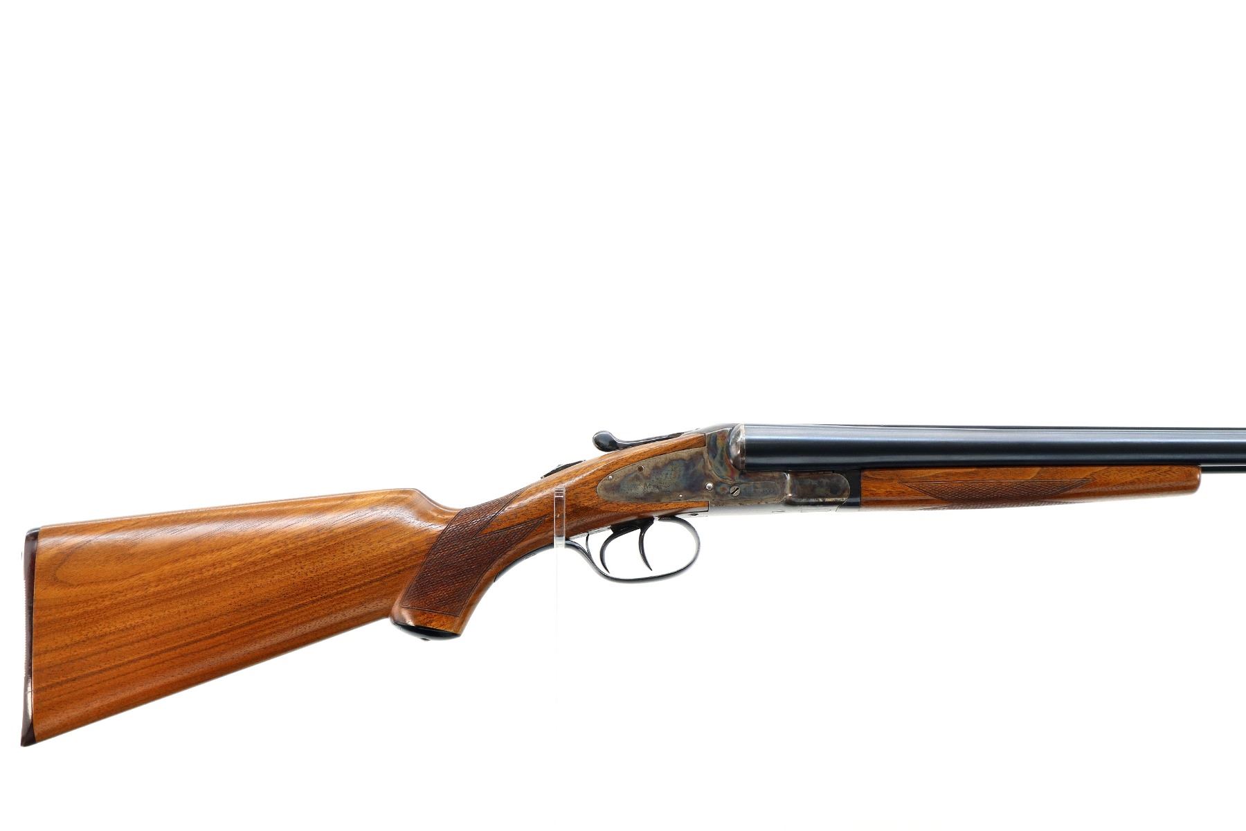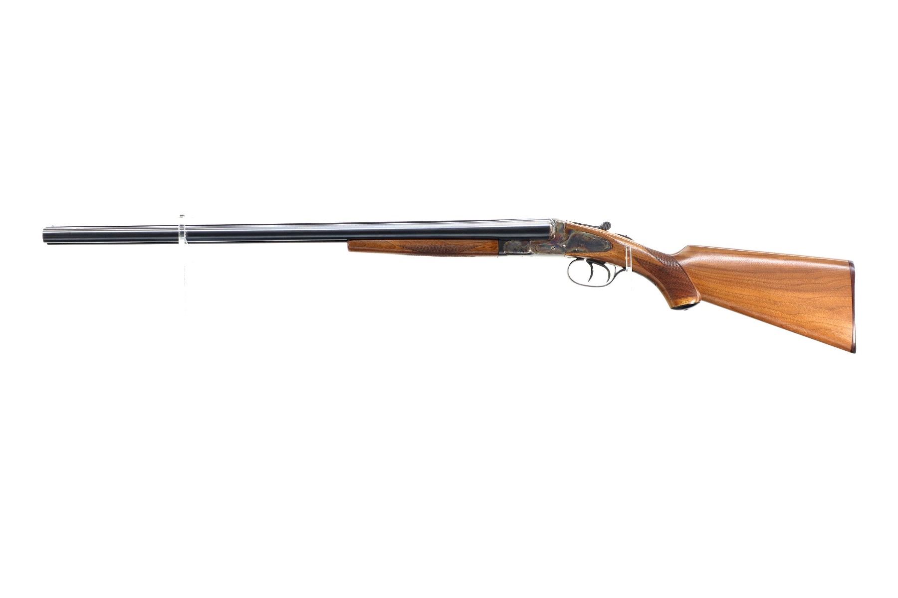 Main Description: Brass bead, blued barrels with solid rib that chime and are tight on face, colour case hardened receiver and side locks, automatic safety, right hammer may have a weak spring, extractor, double triggers. Two piece wood stocks, checkered splinter forearm and pistol grip, grooved brown polymer butt plate, 14.25" LOP, grip cap