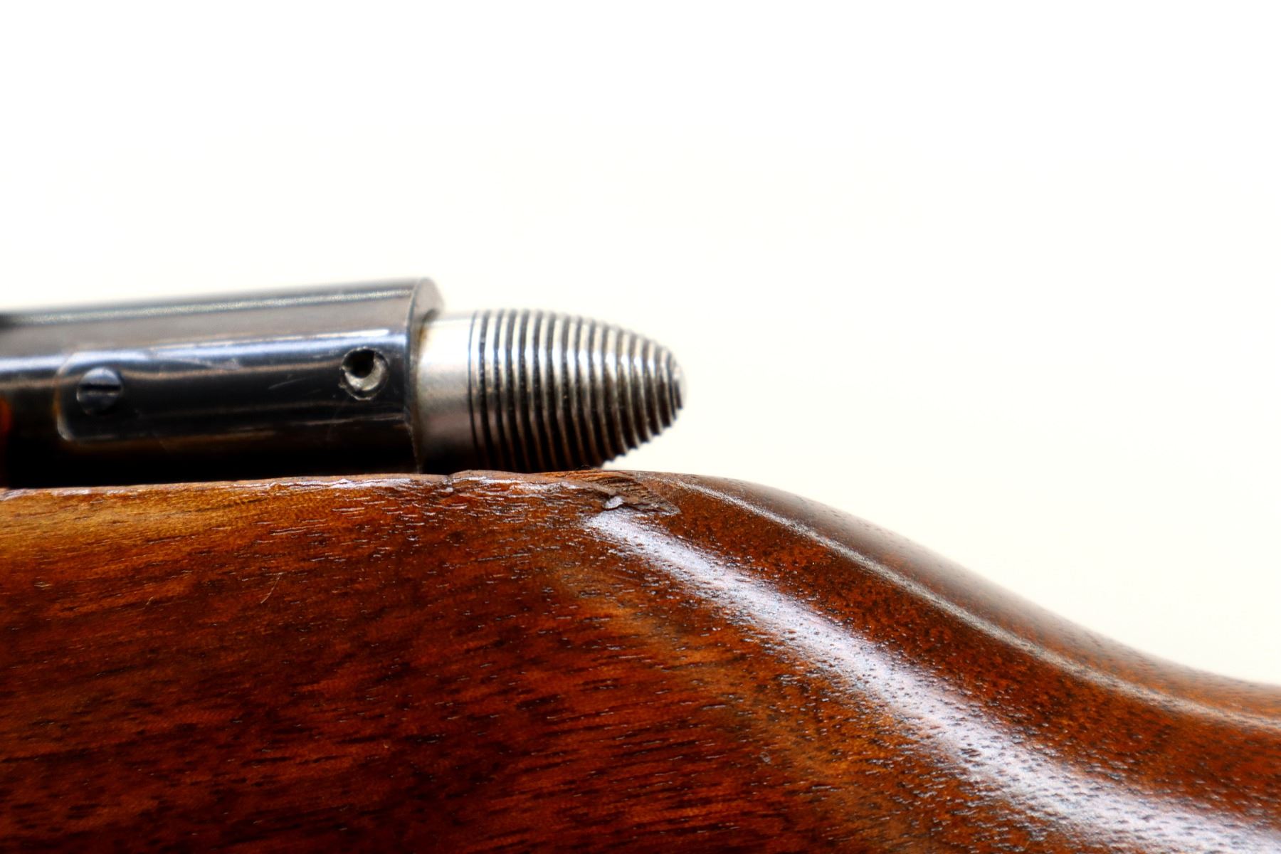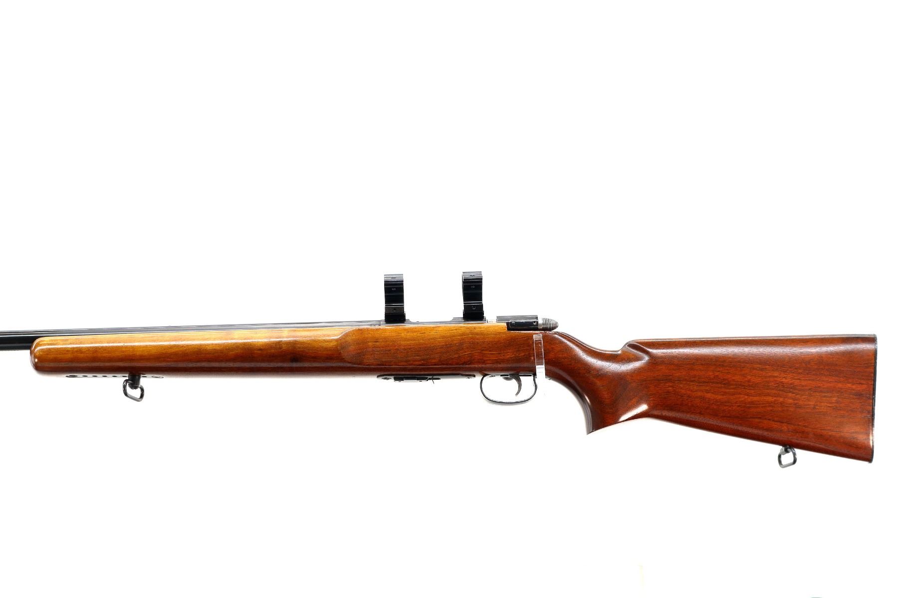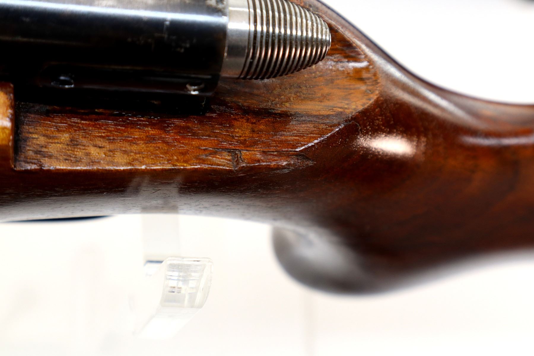 Main Description: Globe front sight with ramp, no rear sight, metal has been polished and reblued, receiver drilled and tapped with 1" scope rings installed, smooth bolt knob. One piece target wood stock, wide forearm, pistol grip, checkered black painted steel butt plate, 13.75" LOP, short rail under forearm and sling swivels.