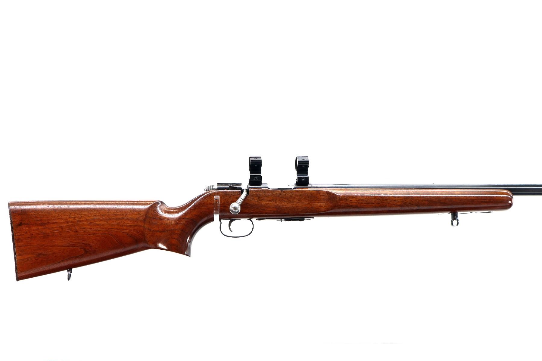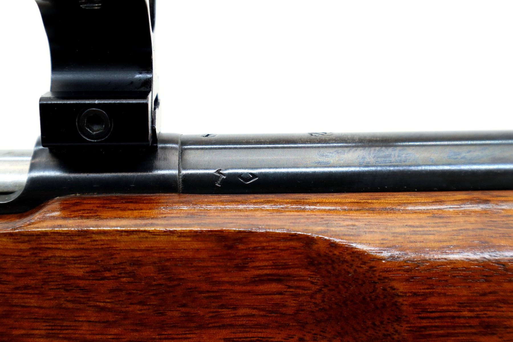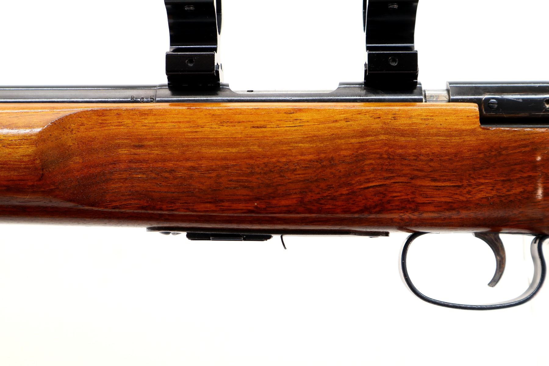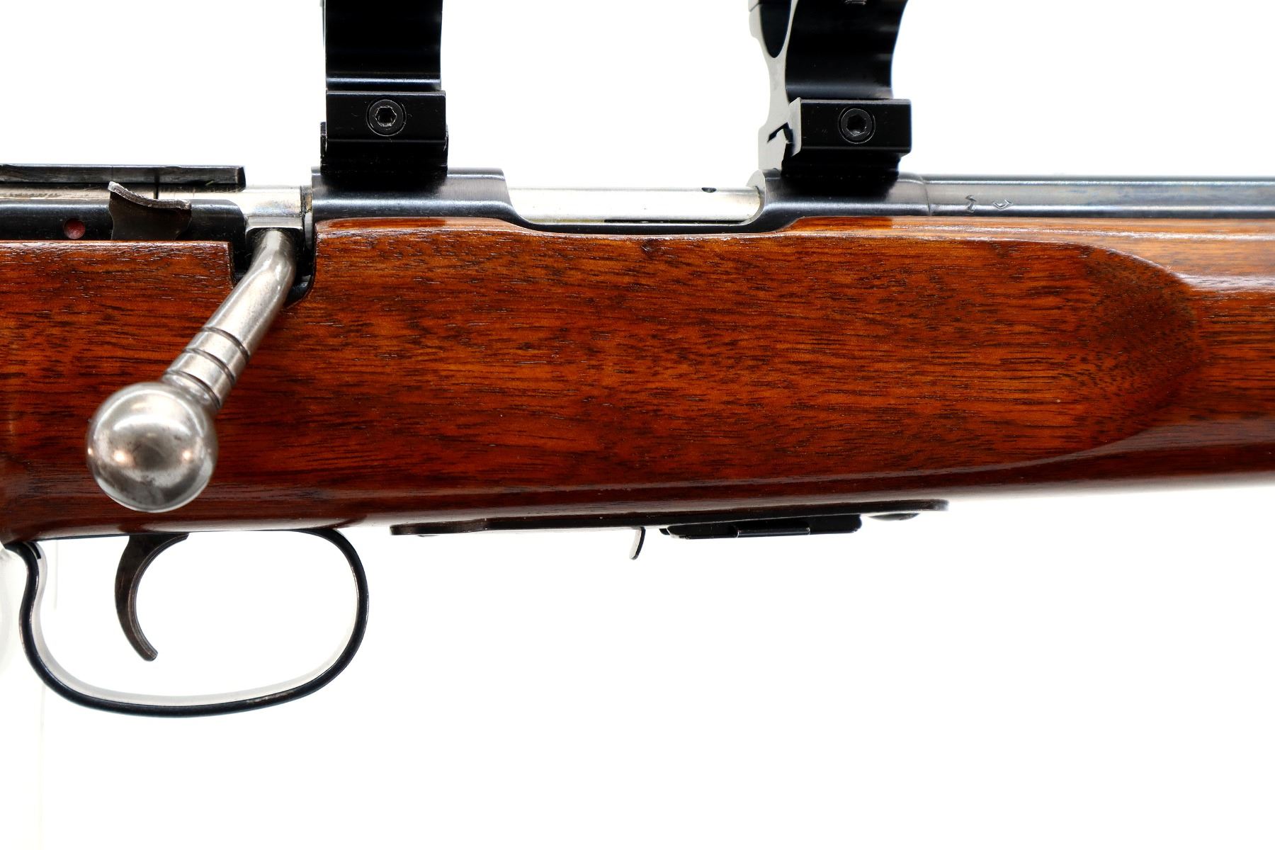 Main Description: Globe front sight with ramp, no rear sight, metal has been polished and reblued, receiver drilled and tapped with 1" scope rings installed, smooth bolt knob. One piece target wood stock, wide forearm, pistol grip, checkered black painted steel butt plate, 13.75" LOP, short rail under forearm and sling swivels.