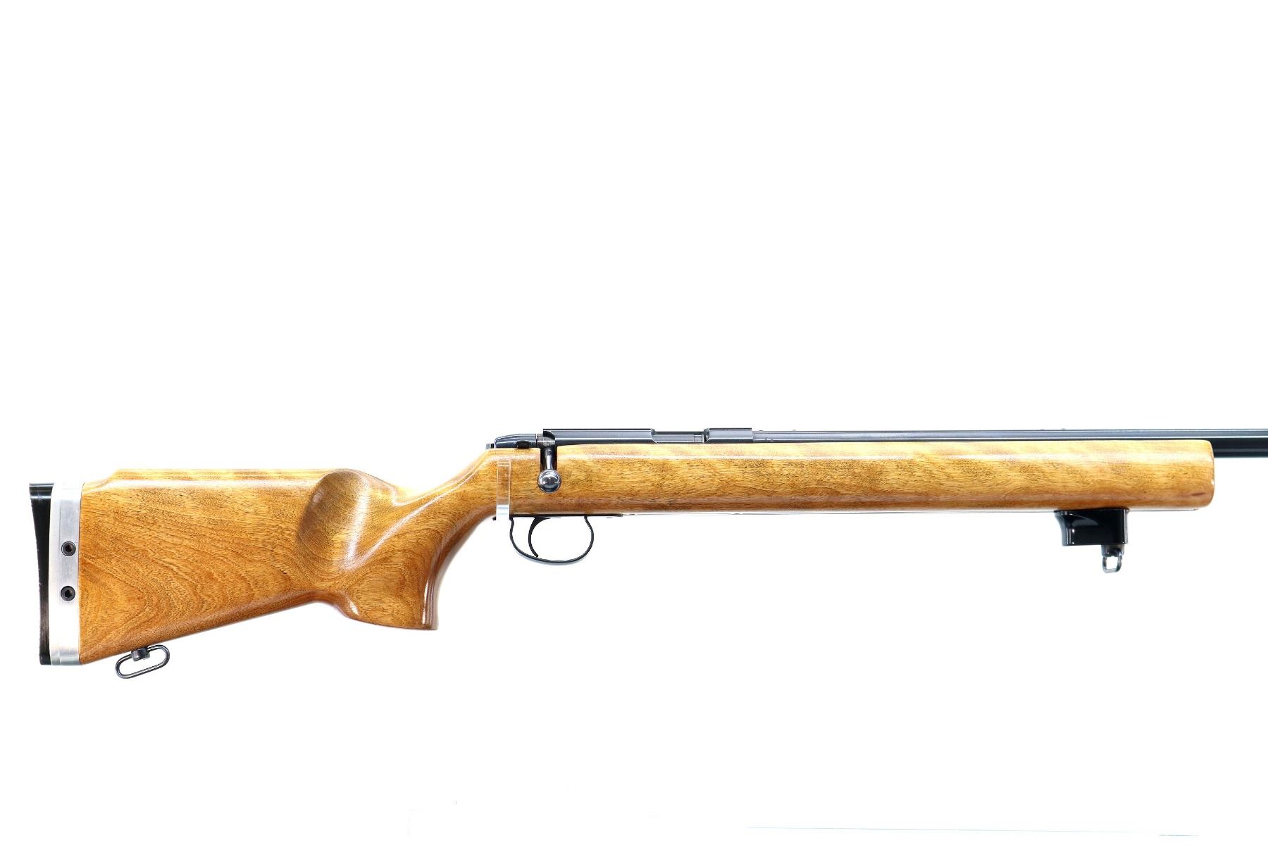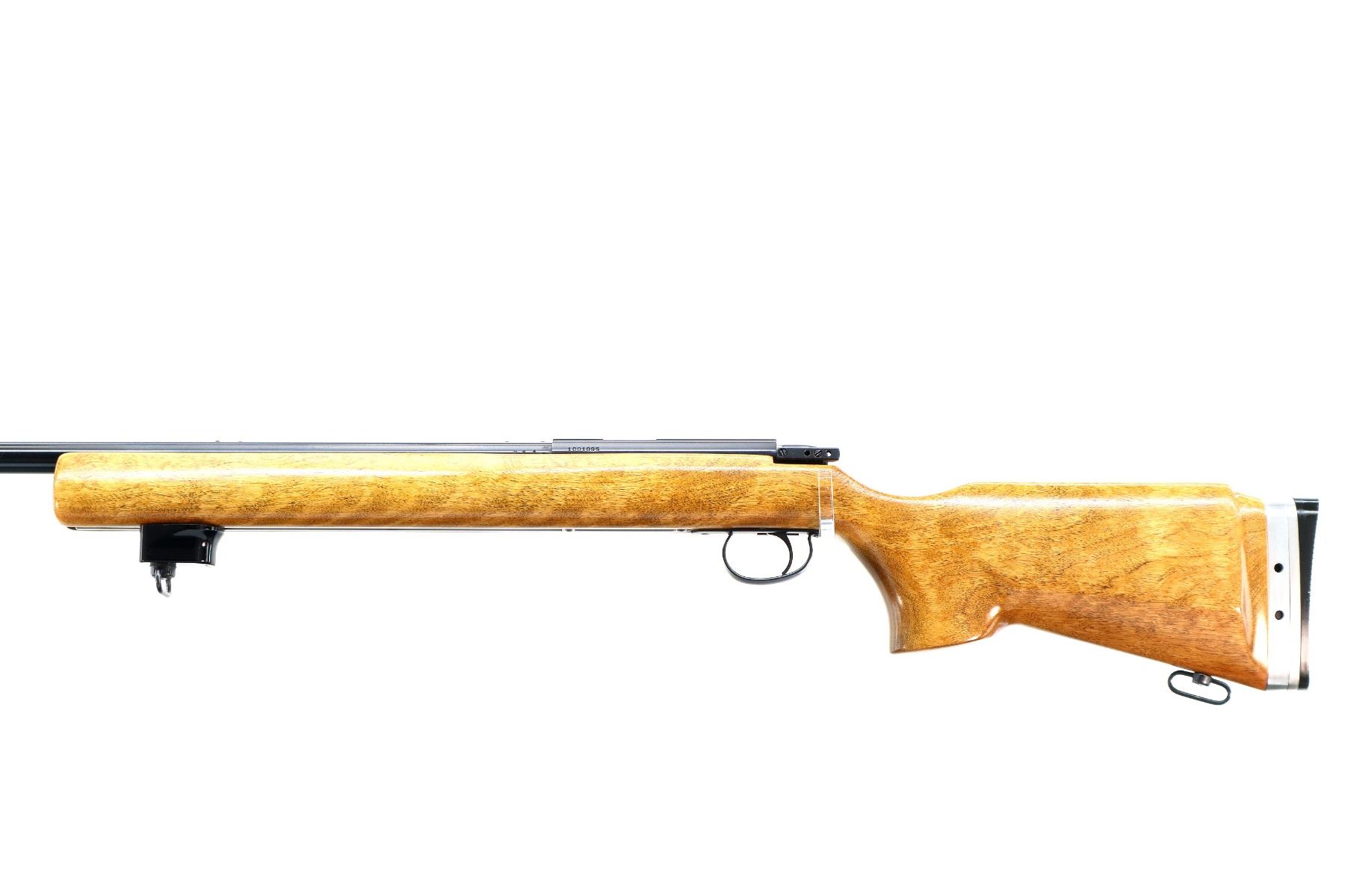 Main Description: Missing front and rear sights bases present, metal has been polished and reblued, heavy barrel drilled and tapped with plug screws installed, grooved receiver, smooth bolt knob. One piece refinished target style wood stock, wide forearm, thumb rest pistol grip, cheek rest, checkered black alloy butt plate with aluminum spacers, 12.75" LOP, full length rail under forearm with black polymer hand stop and sling swivels.