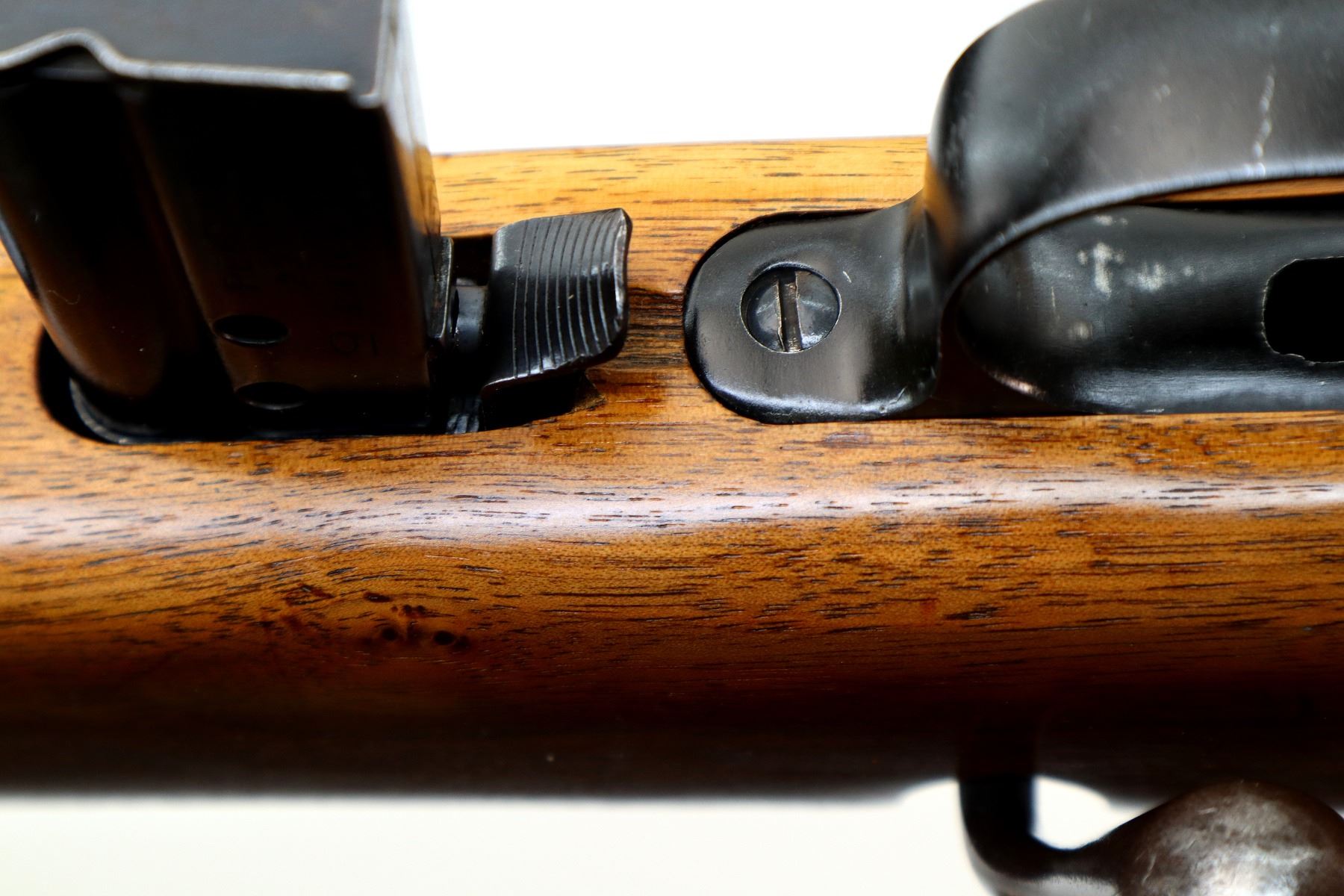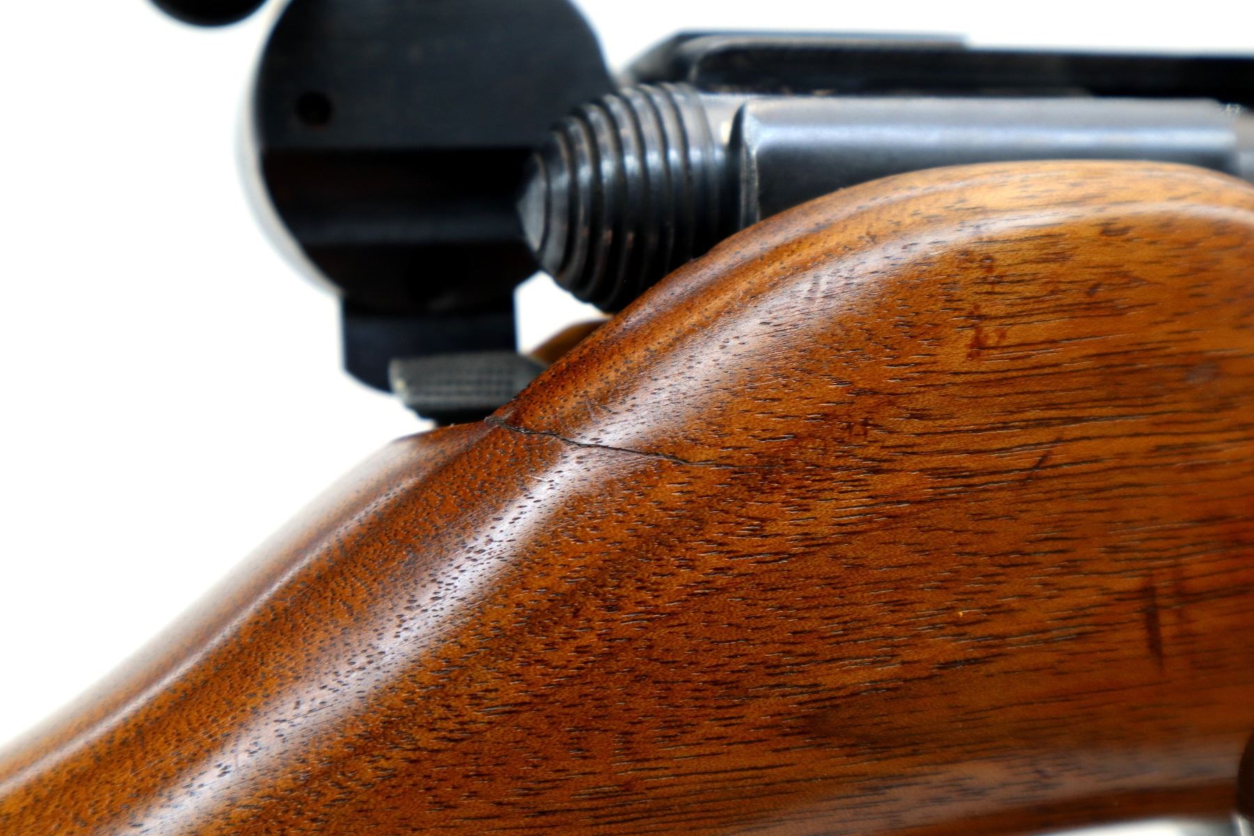 Main Description: Globe front sight with insert and ramp, adjustable Lyman rear peep sight with large eye cup, blued finish, heavy barrel drilled and tapped with two piece Unertl scope bases installed, smooth bolt knob. One piece wood stock, pistol grip cracked behind receiver, grooved steel butt plate, sling swivels.