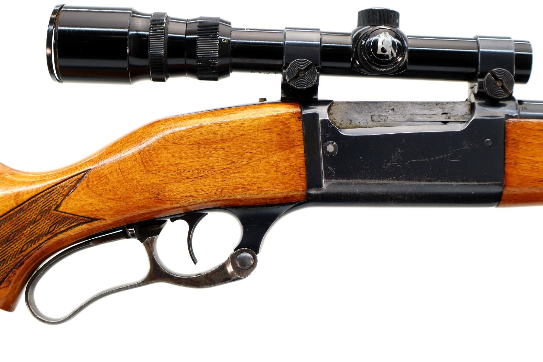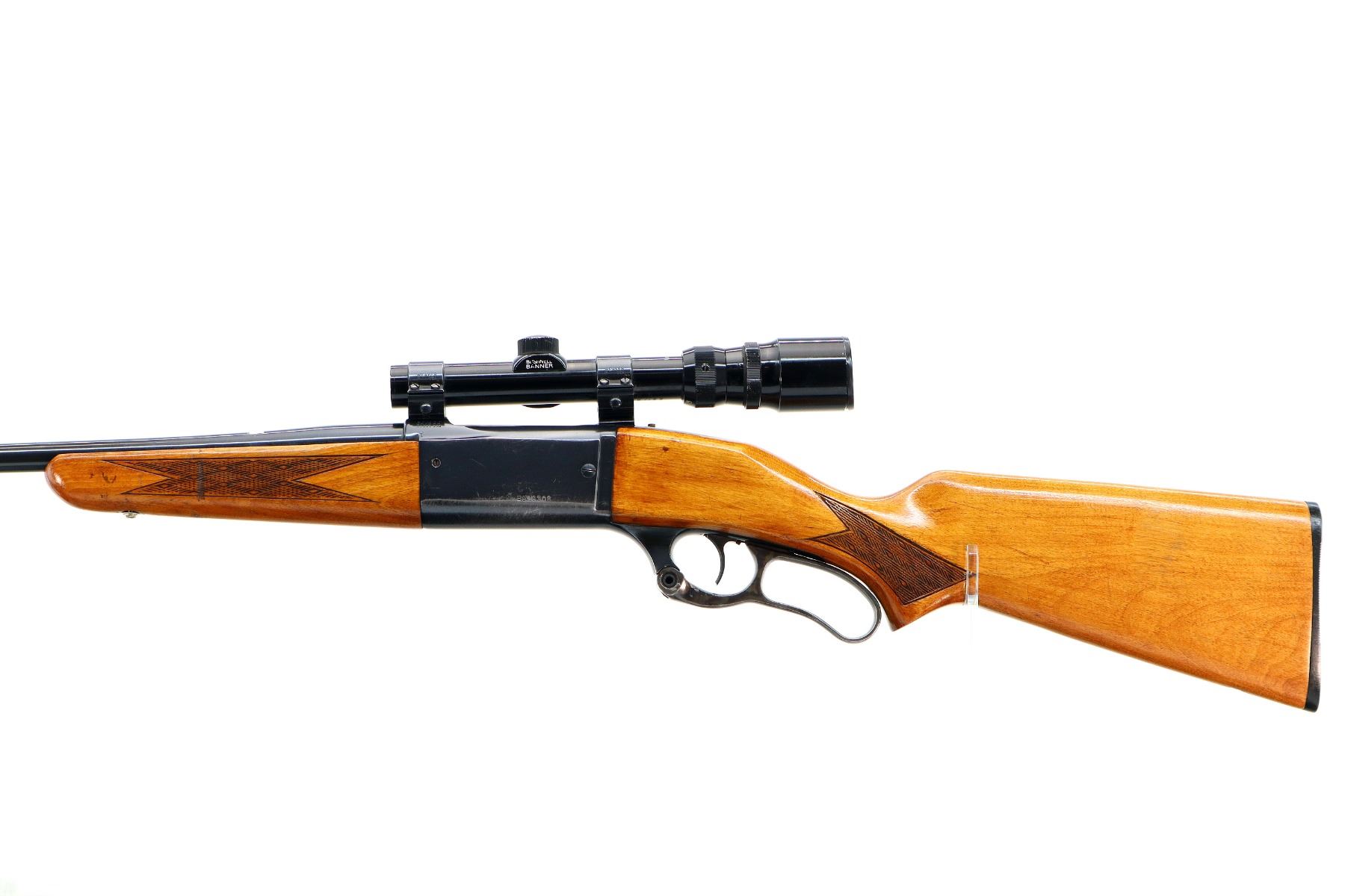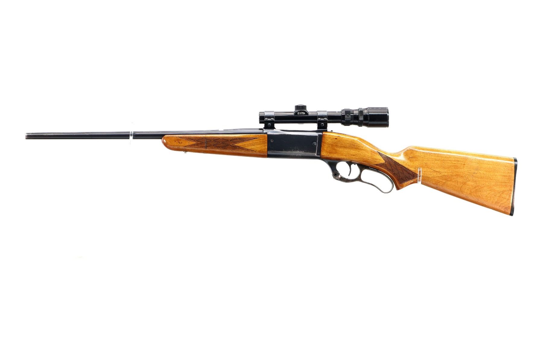 Main Description: Missing front and rear sights, threaded hole and dovetail present, blued finish, receiver drilled and tapped with Bushnell Banner 1.75-4.5x20 scope installed, clear optics with duplex crosshair. Cocking indicator. Two piece wood stocks, checkered forearm with replaced screw, checkered pistol grip, grooved black polymer butt plate with replaced screws, colour case hardened lever missing the bushing screw.
