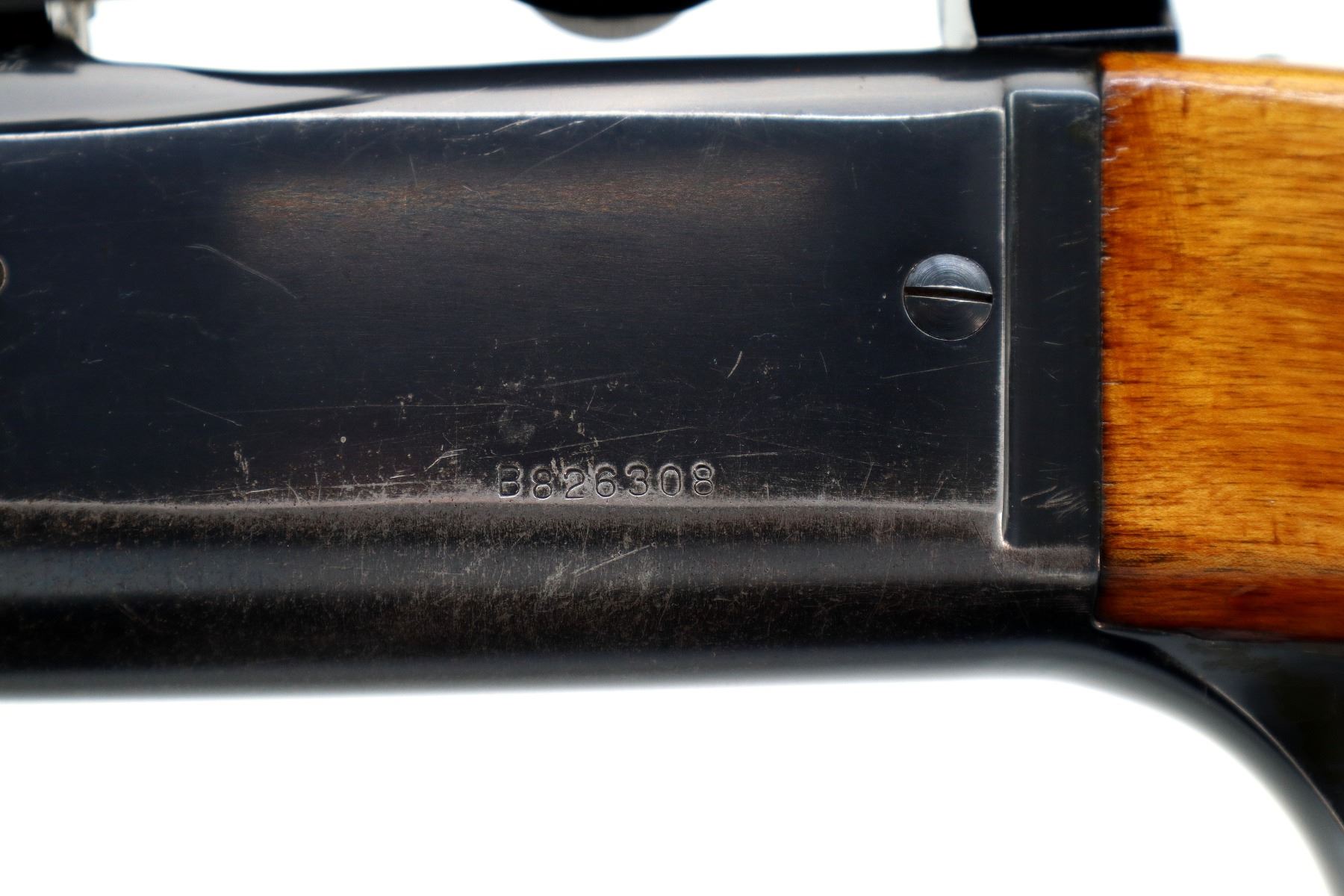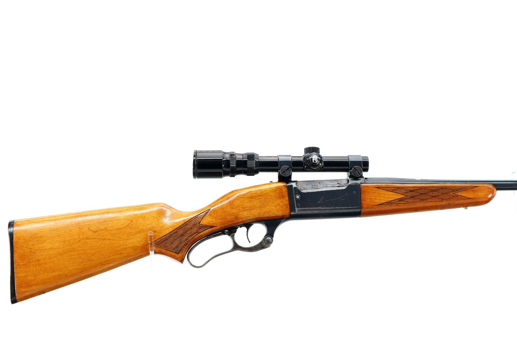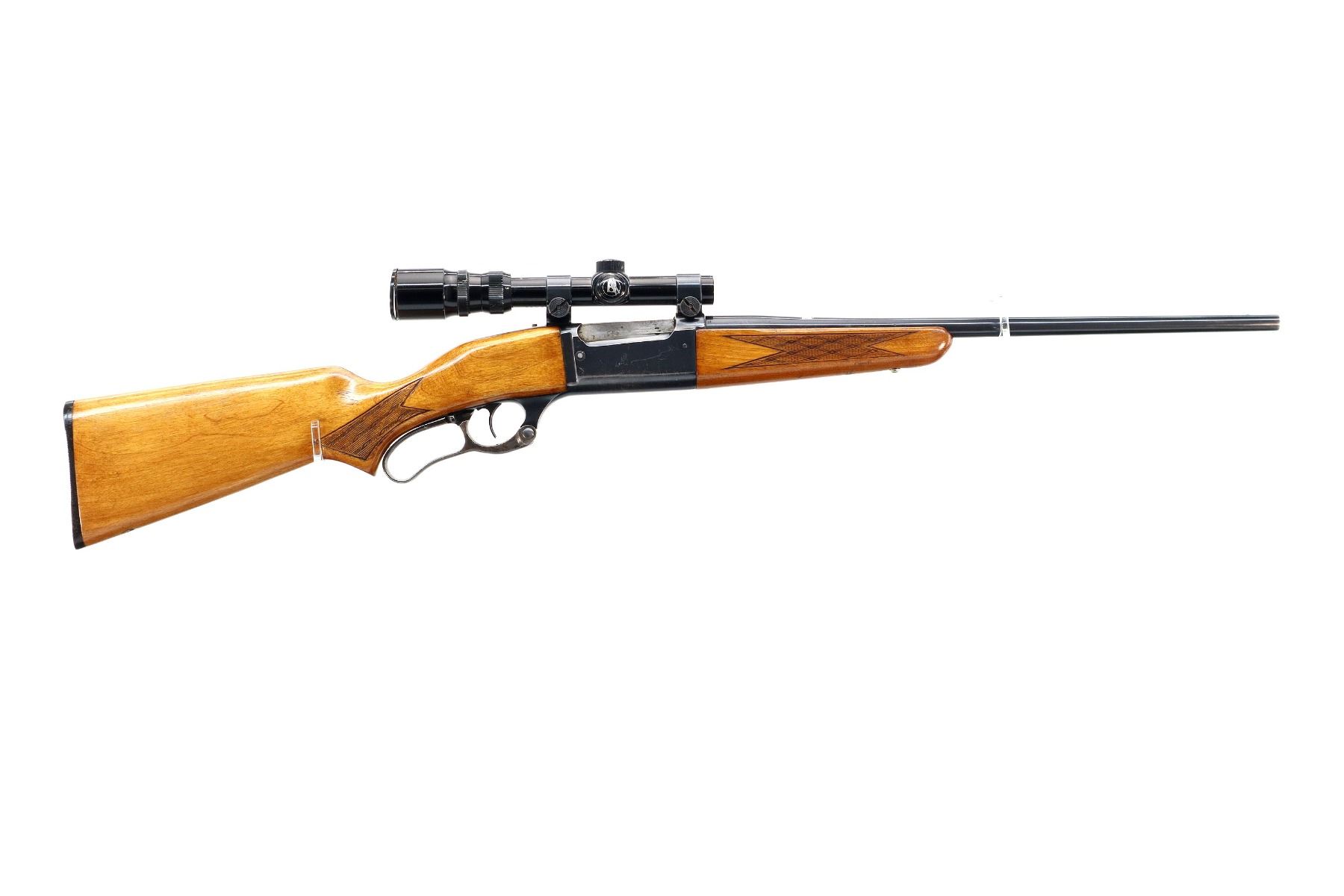 Main Description: Missing front and rear sights, threaded hole and dovetail present, blued finish, receiver drilled and tapped with Bushnell Banner 1.75-4.5x20 scope installed, clear optics with duplex crosshair. Cocking indicator. Two piece wood stocks, checkered forearm with replaced screw, checkered pistol grip, grooved black polymer butt plate with replaced screws, colour case hardened lever missing the bushing screw.