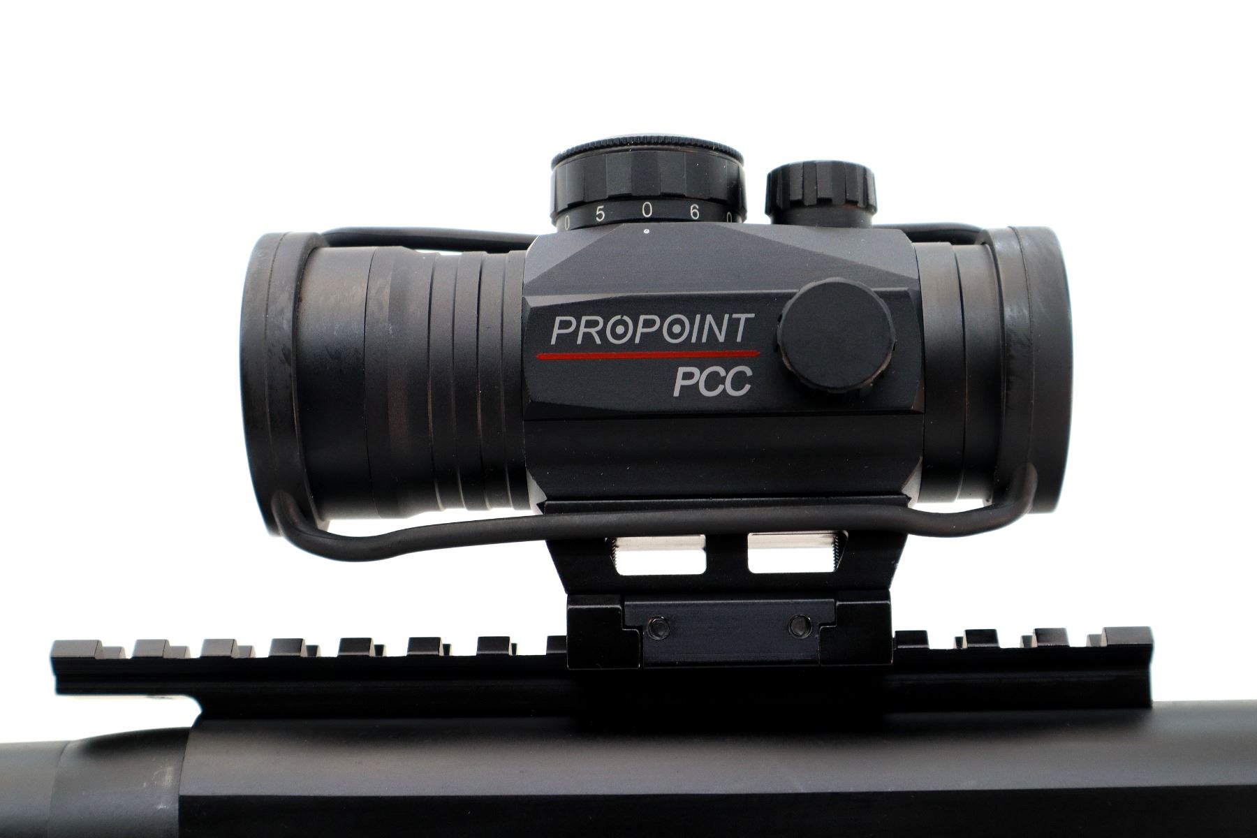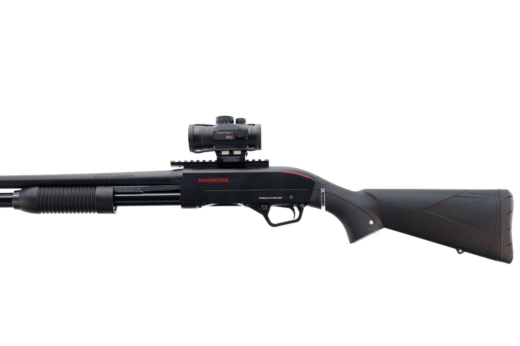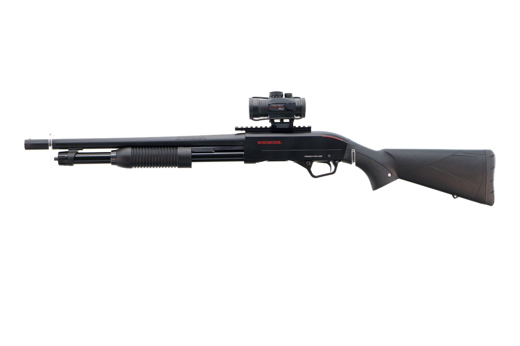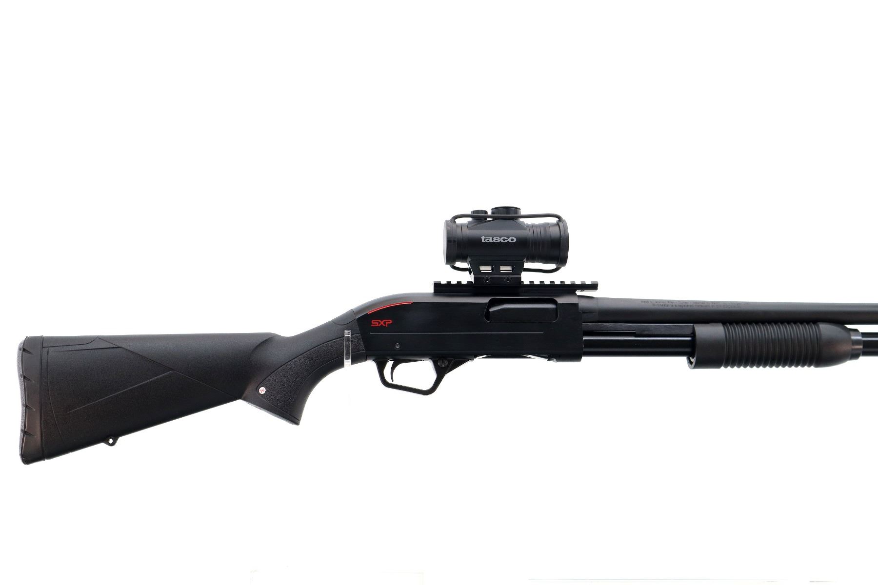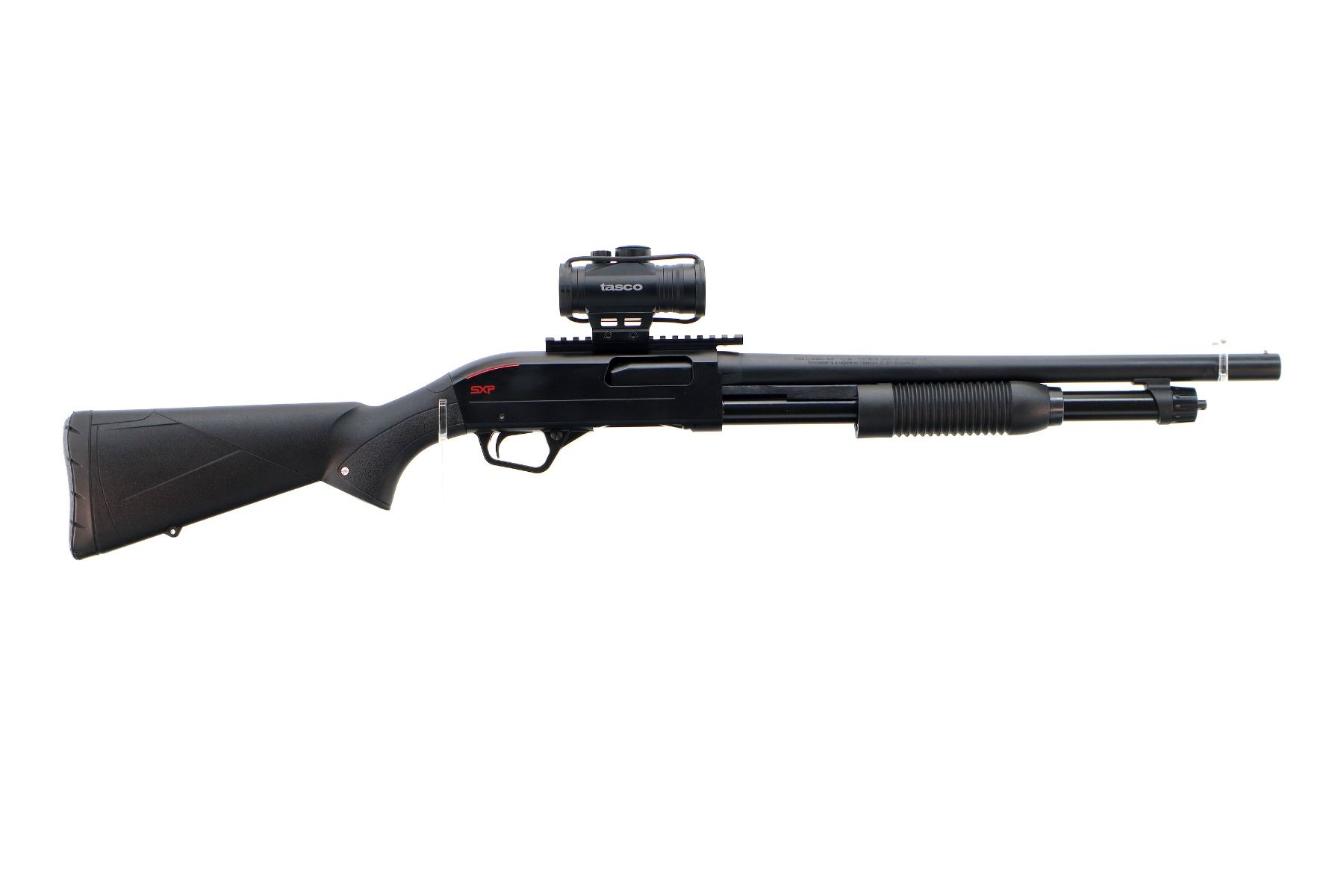 Main Description: Brass bead, Parkerized round barrel, black alloy receiver drilled and tapped with one piece rail and Tasco Pro point PCC red dot installed, clear optics that functions. Two piece black synthetic stocks, grooved forearm, textured pistol grip, black rubber recoil pad, grip cap, swivel studs.