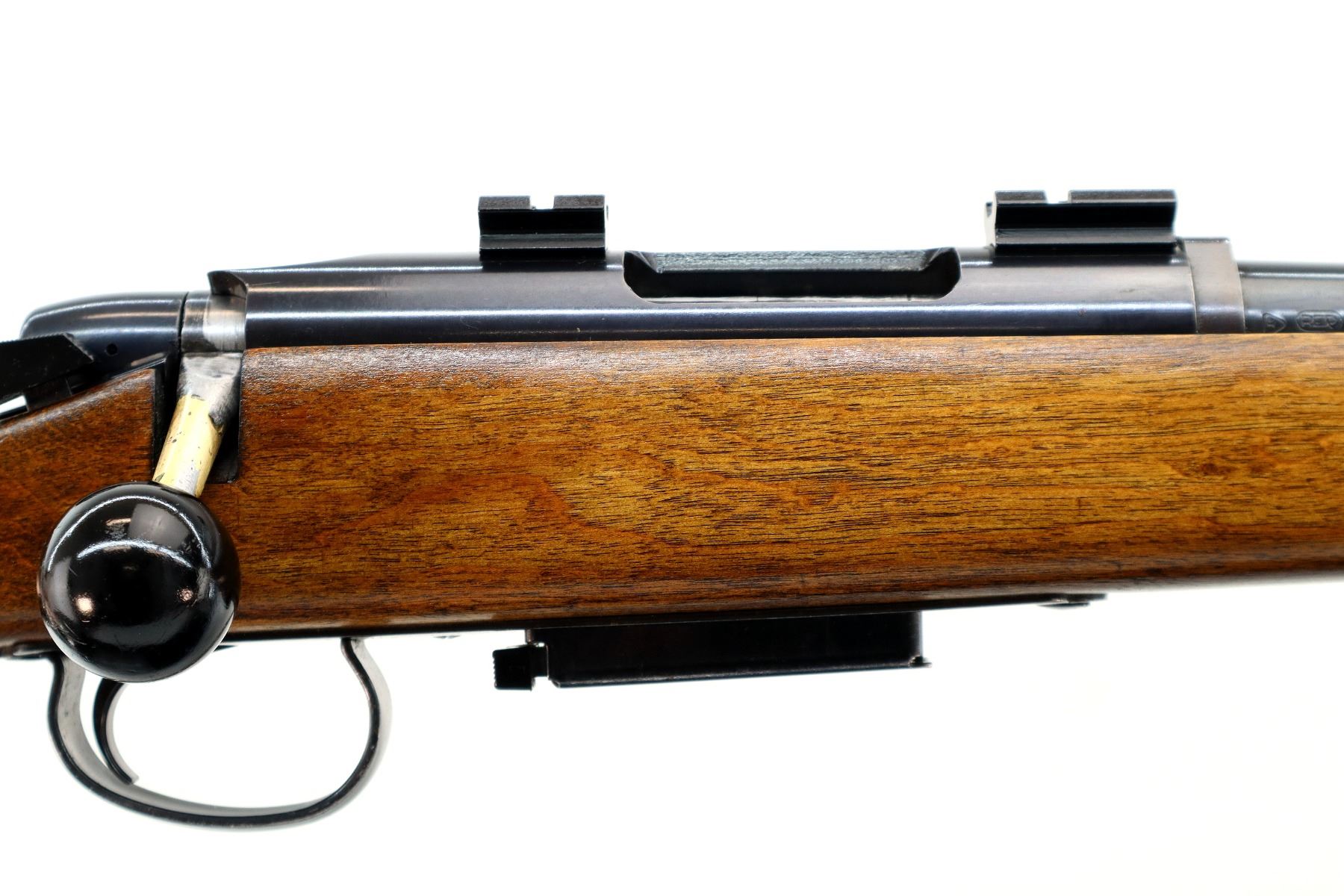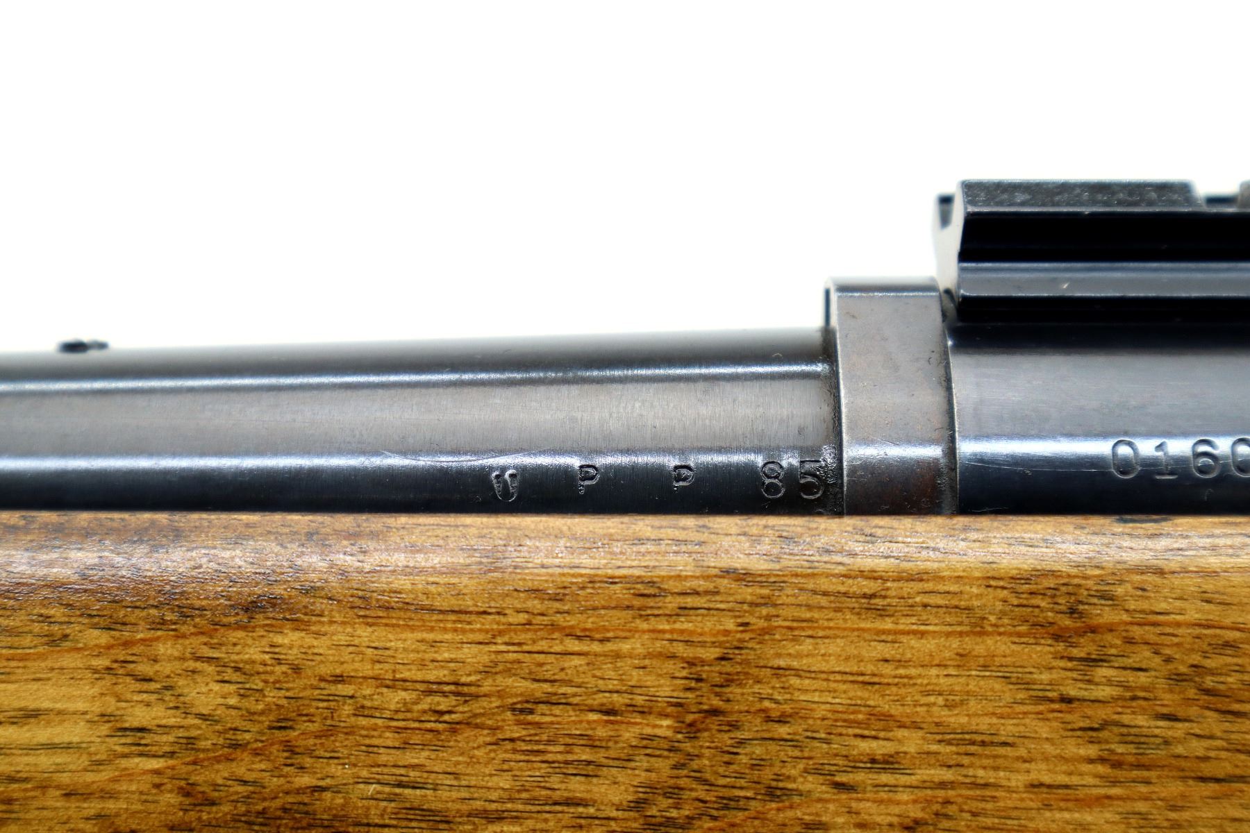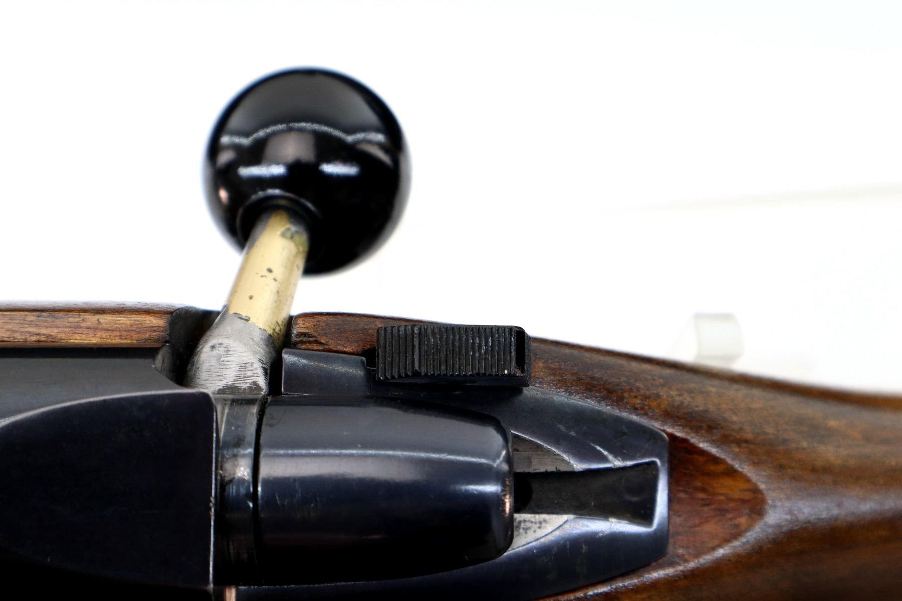 Main Description: Missing sights, threaded holes filled with plug screws, blued finish, receiver drilled and tapped with two piece scope bases installed, repaired bolt handle with large black polymer knob. One piece wood stock, pistol grip, raised comb, grooved black polymer butt plate, sling swivels.