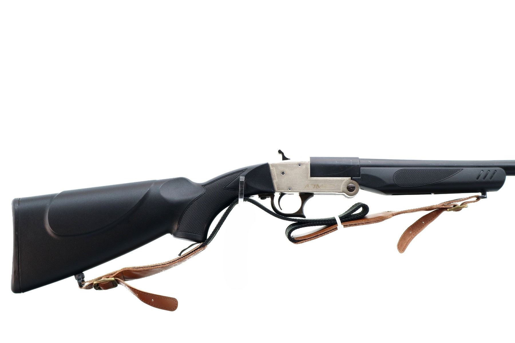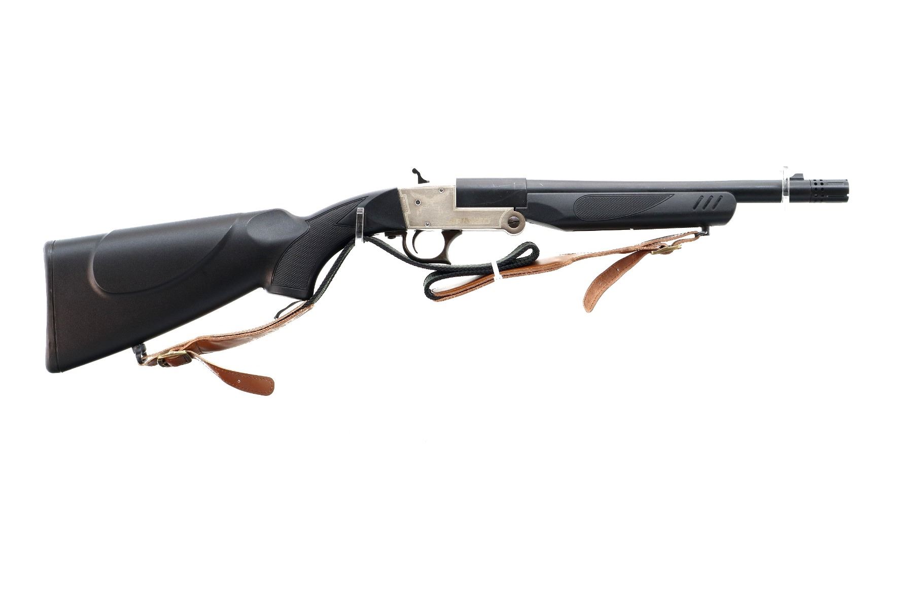 Main Description: Blade front sight, fixed u notched rear sight, black matte round barrel, silver receiver, grooved spur hammer, extractor. Two piece black synthetic stocks, checkered forearm , pistol grip and black polymer butt plate, ambi cheek rest, sling swivels with brown leather and black sling.