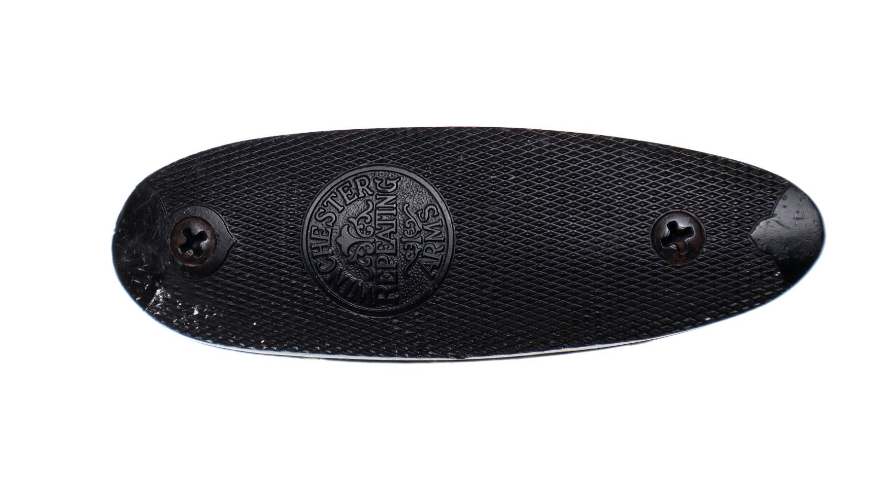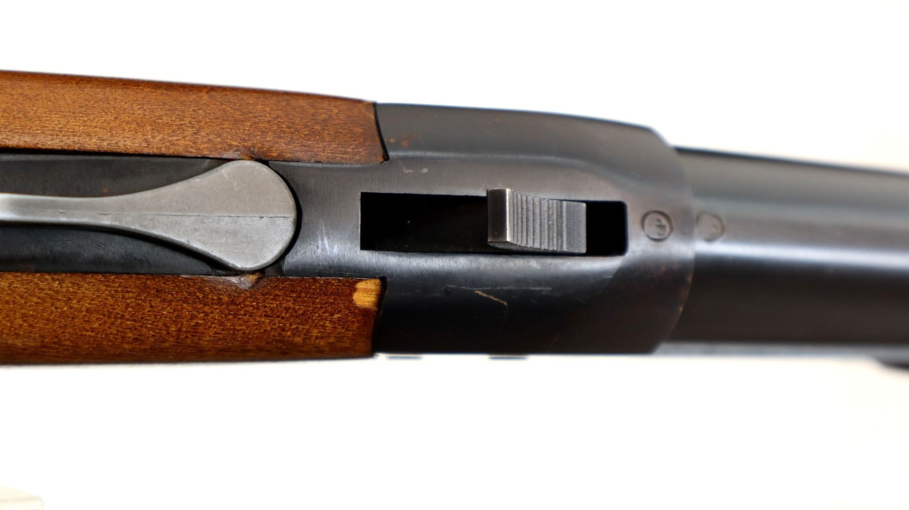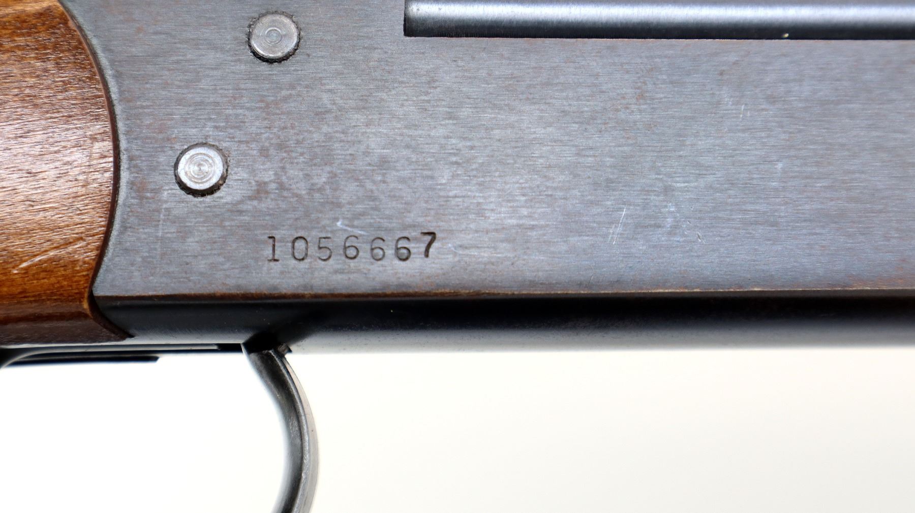 Main Description: Brass bead, blued finish, round barrel, grooved spur hammer, ejector. Two piece wood stocks, finger grooved forearm, pistol grip, small chip behind receiver, checkered black polymer butt plate.