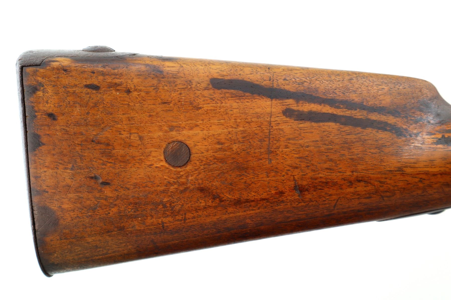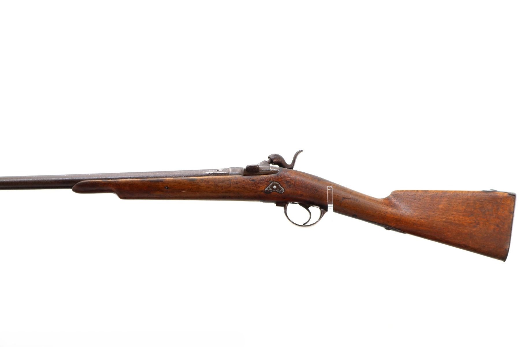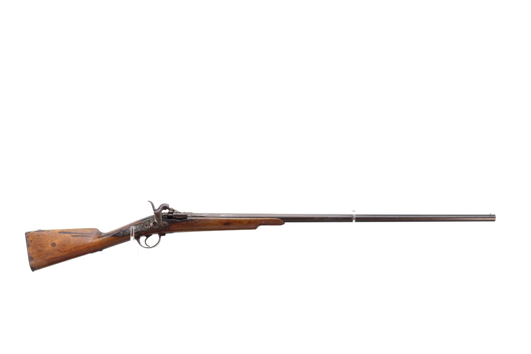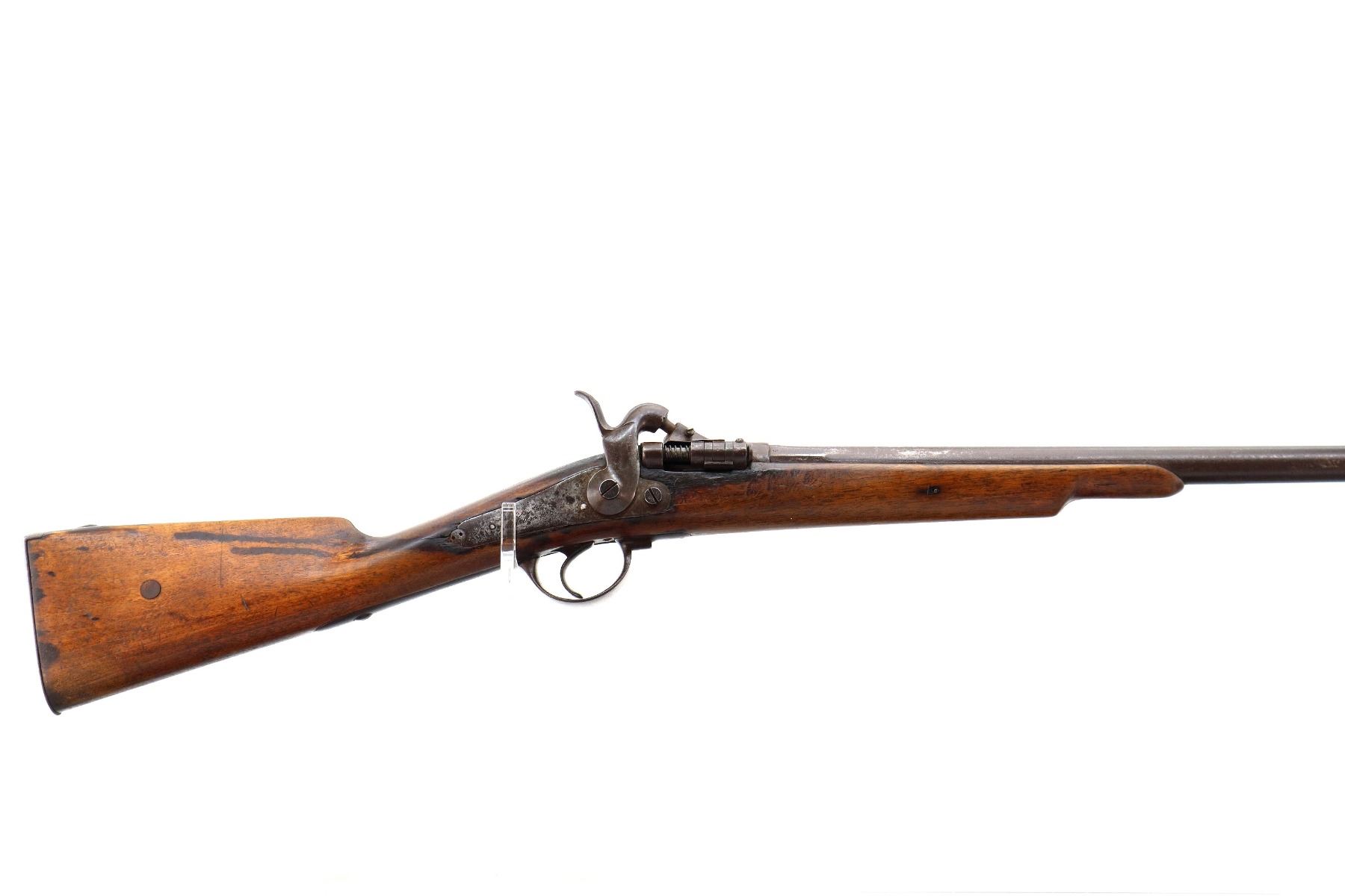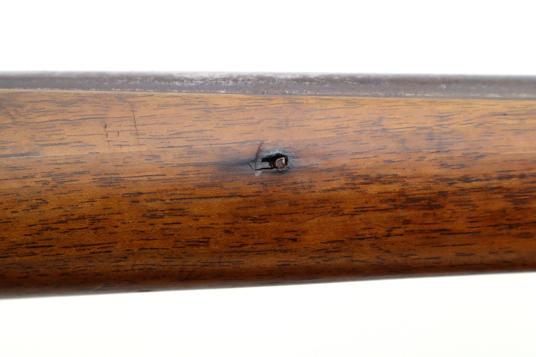 Main Description: Brass bead, tapered round barrel, back action lock with checkered spur hammer that functions, extractor is present. One piece half length wood stock, straight grip chipped and cracked behind lock and receiver, smooth steel butt plate.