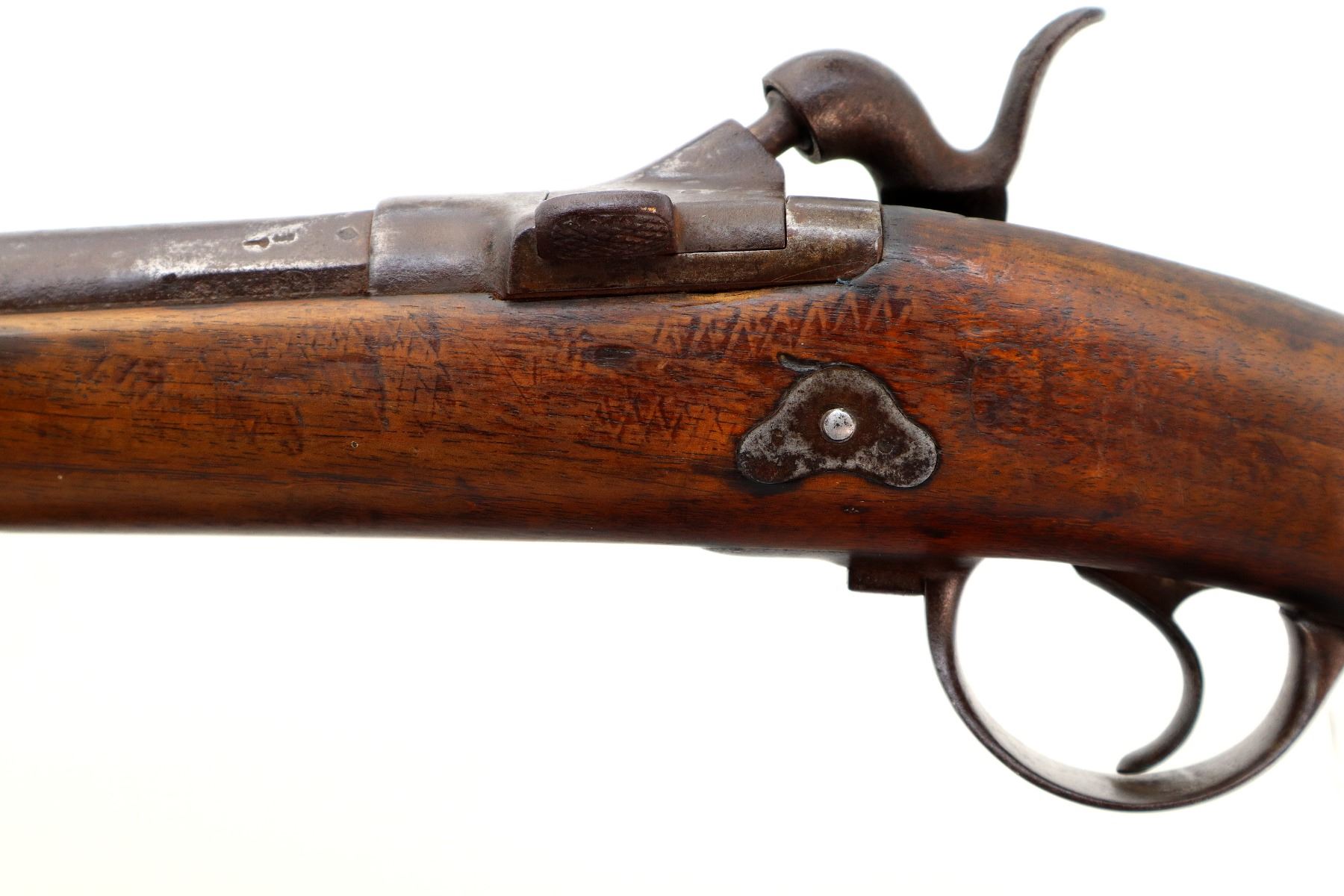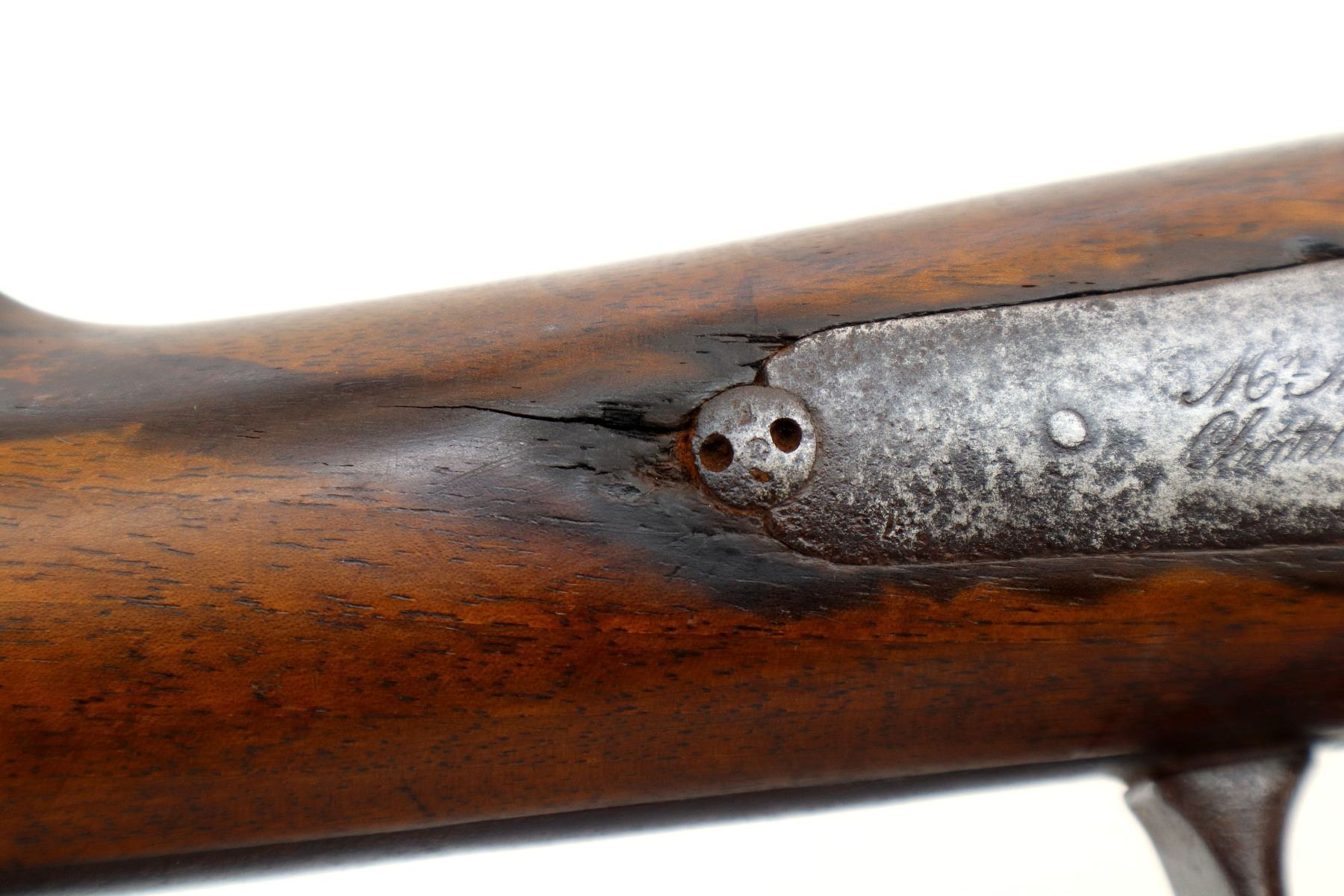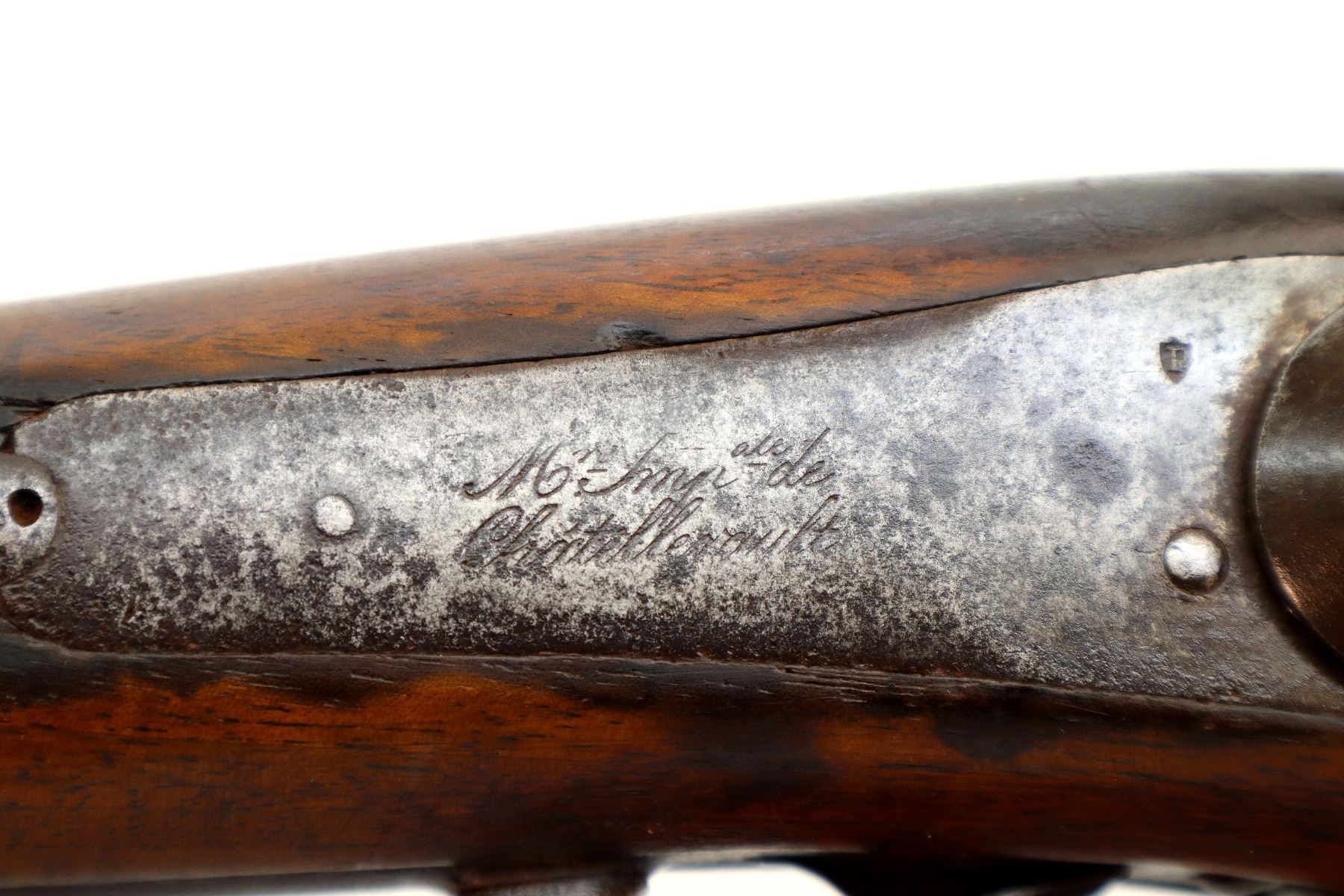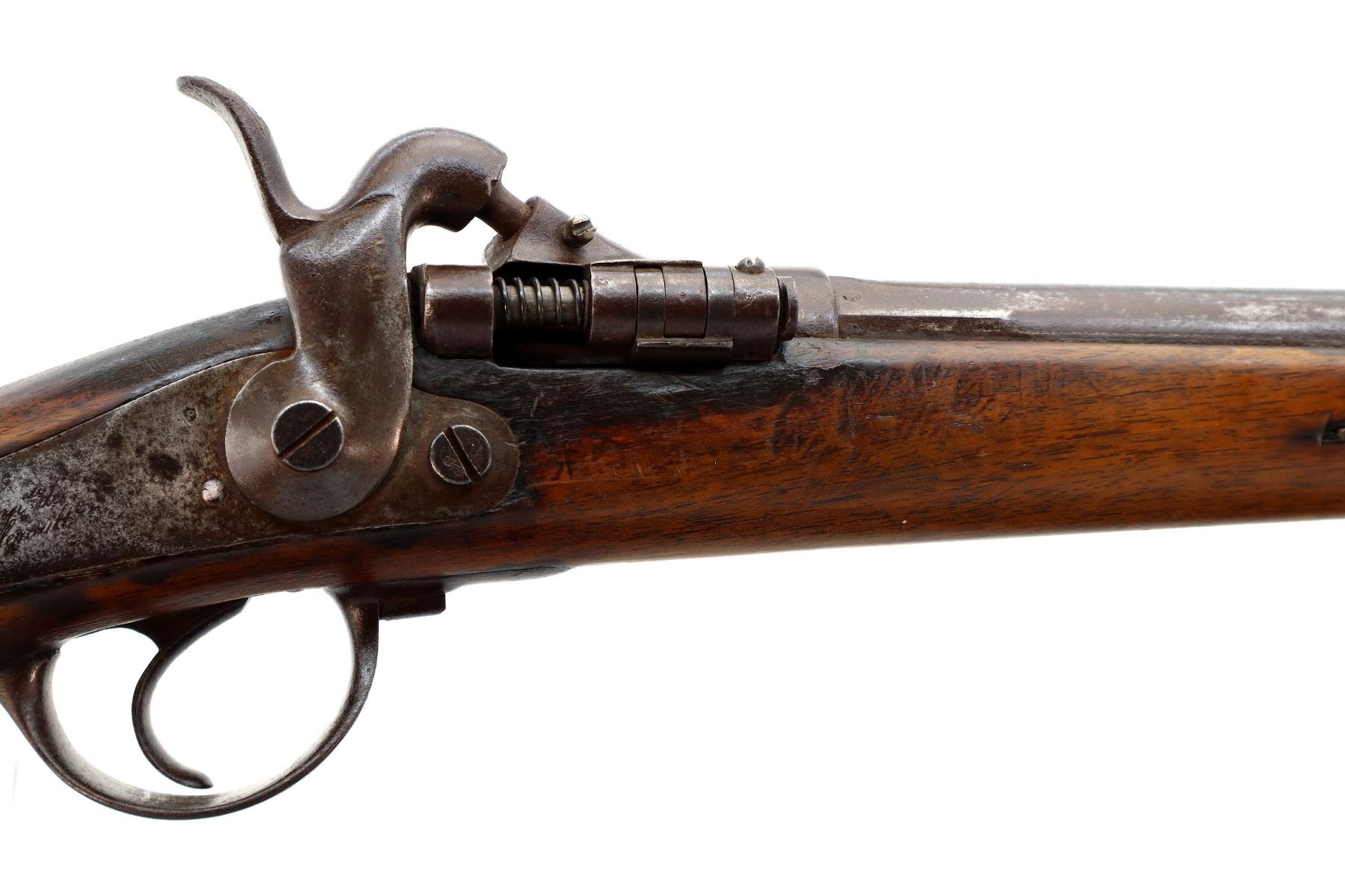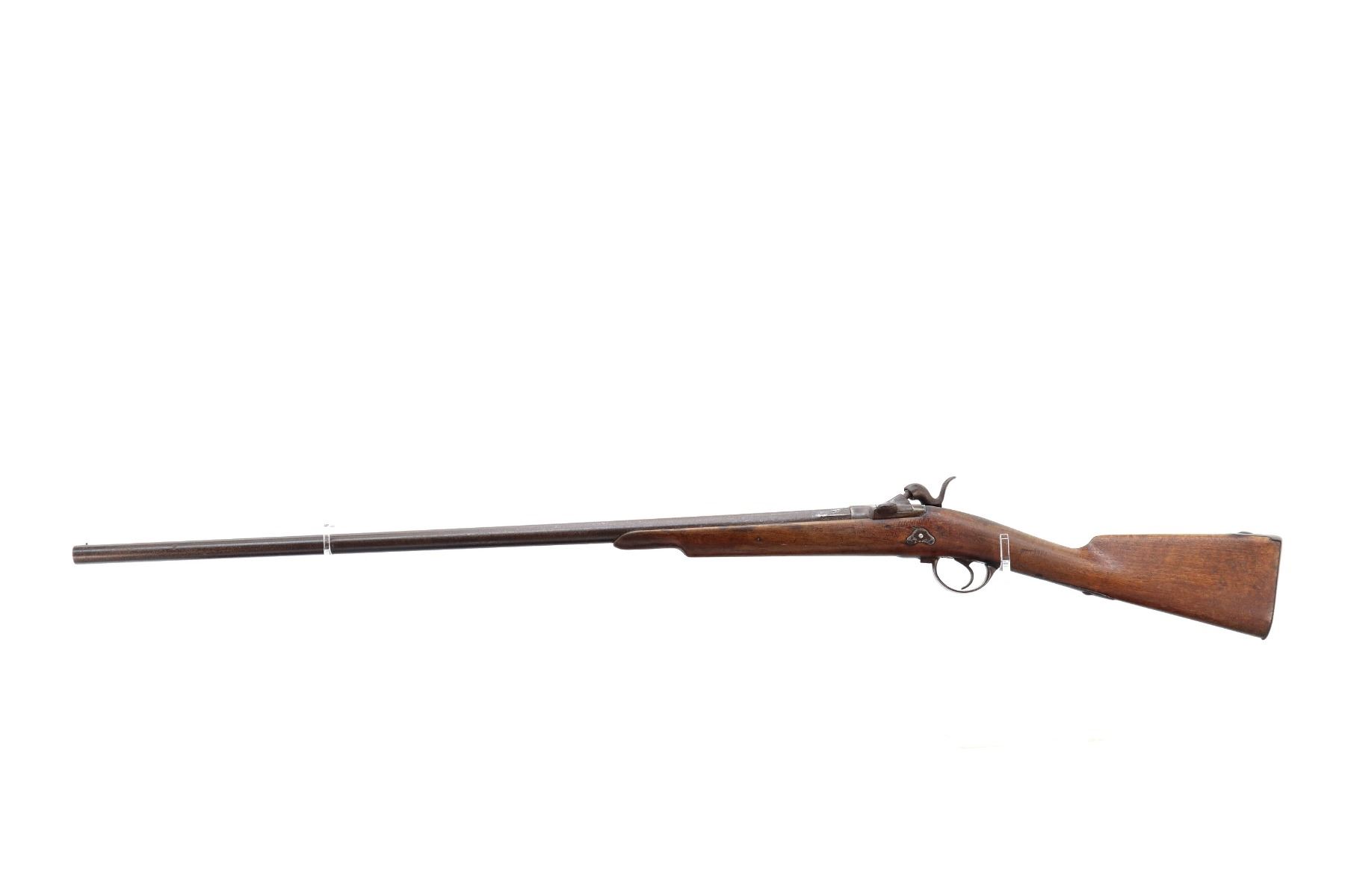 Main Description: Brass bead, tapered round barrel, back action lock with checkered spur hammer that functions, extractor is present. One piece half length wood stock, straight grip chipped and cracked behind lock and receiver, smooth steel butt plate.