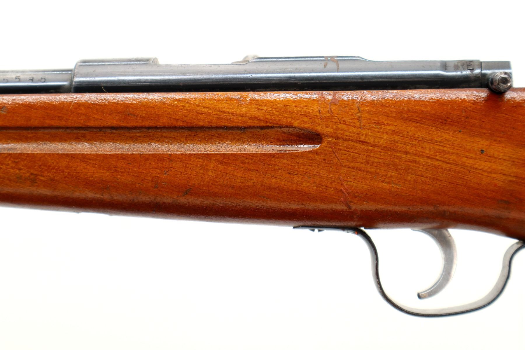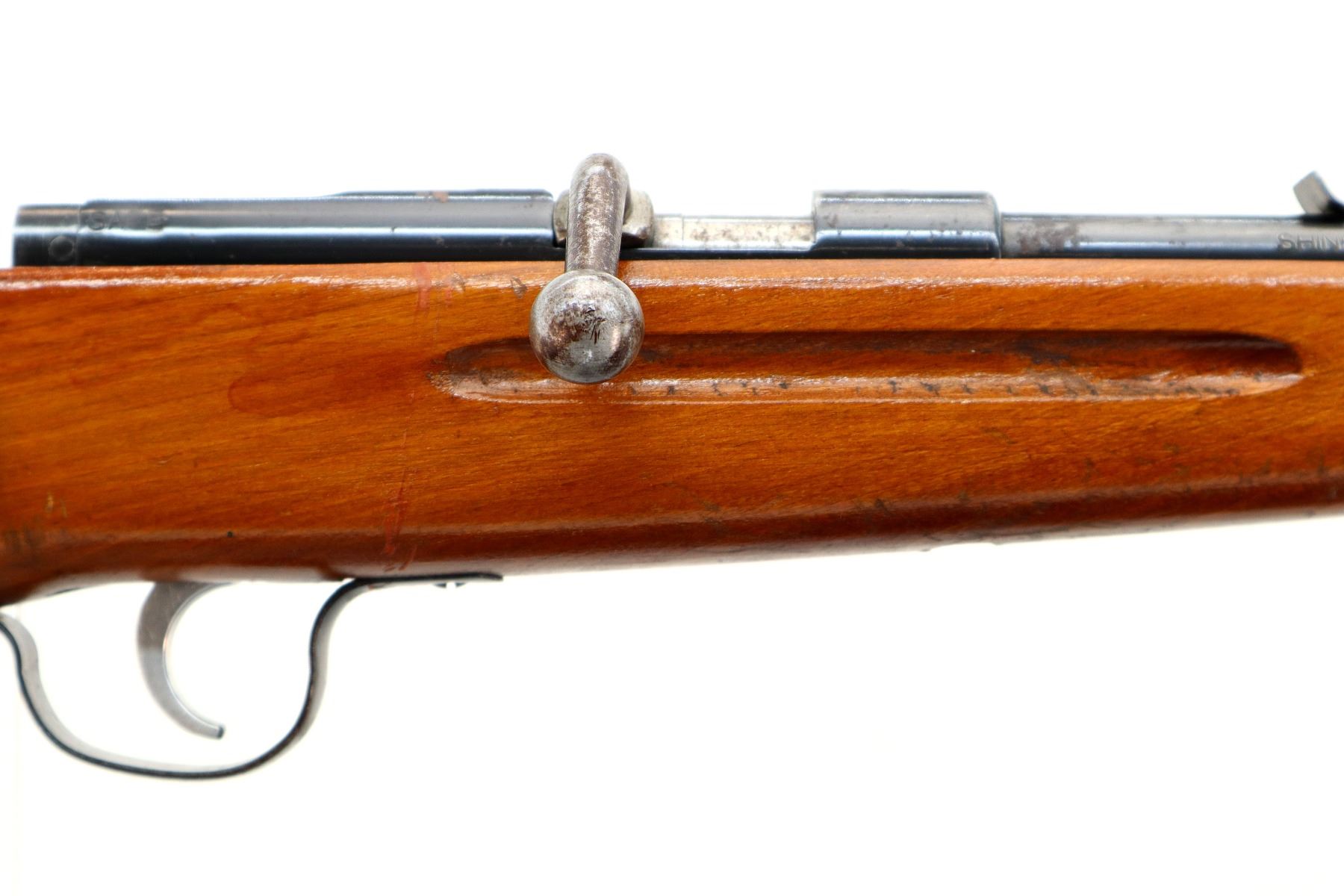 Main Description: Blade front sight, u notched rear sight missing elevator, blued finish, smooth bolt knob, extractor is present. One piece wood stock, finger grooved forearm, pistol grip, grooved butt.