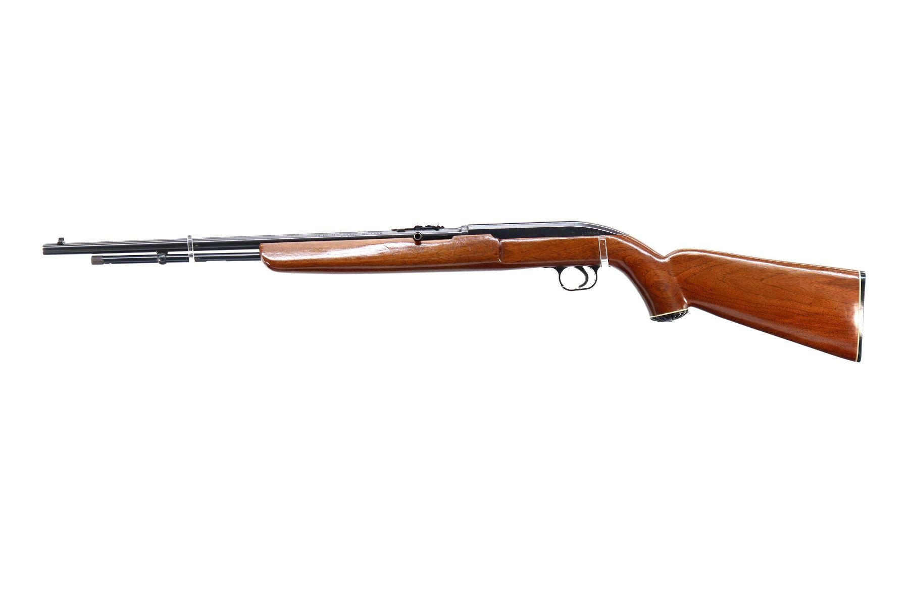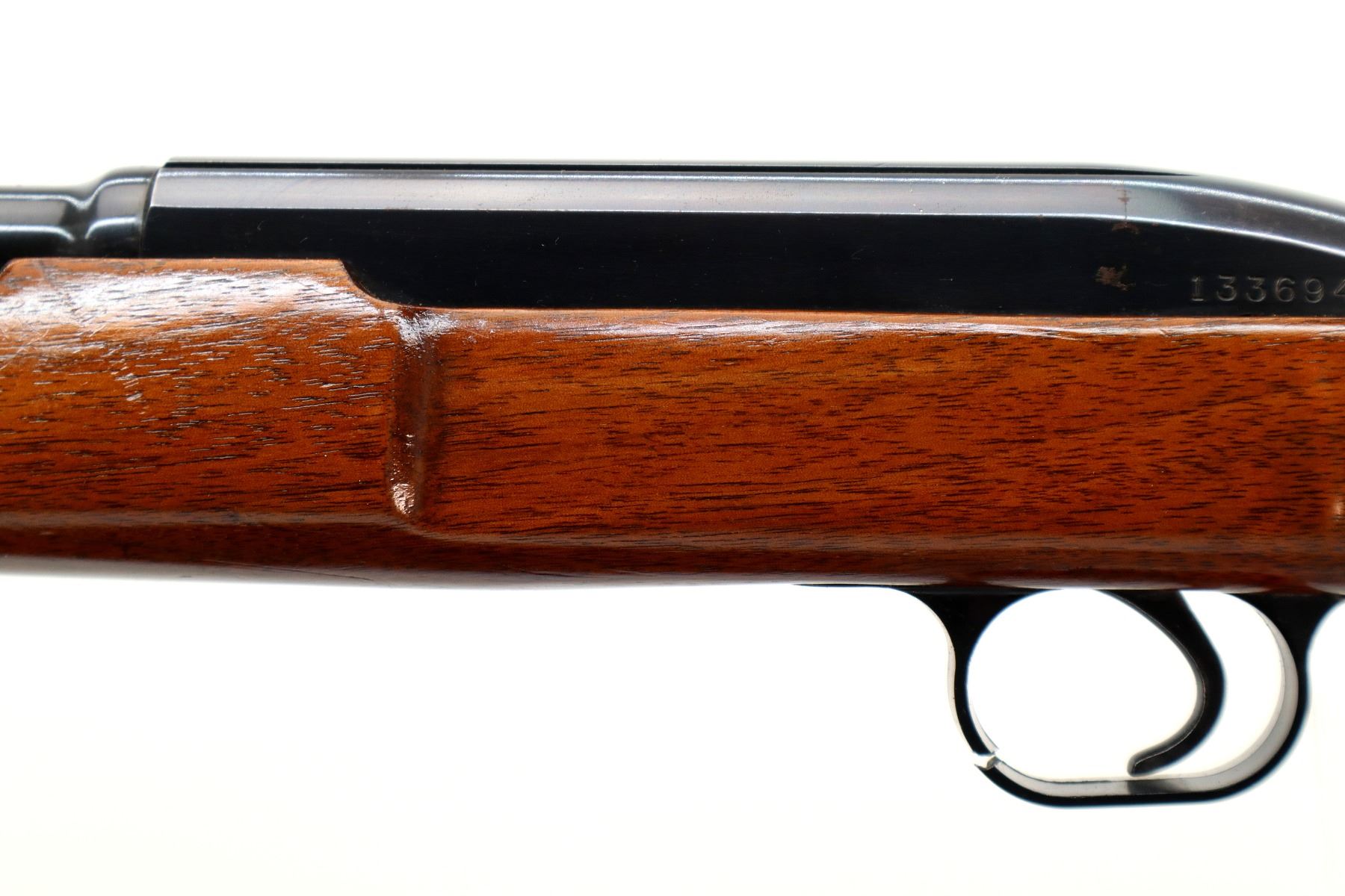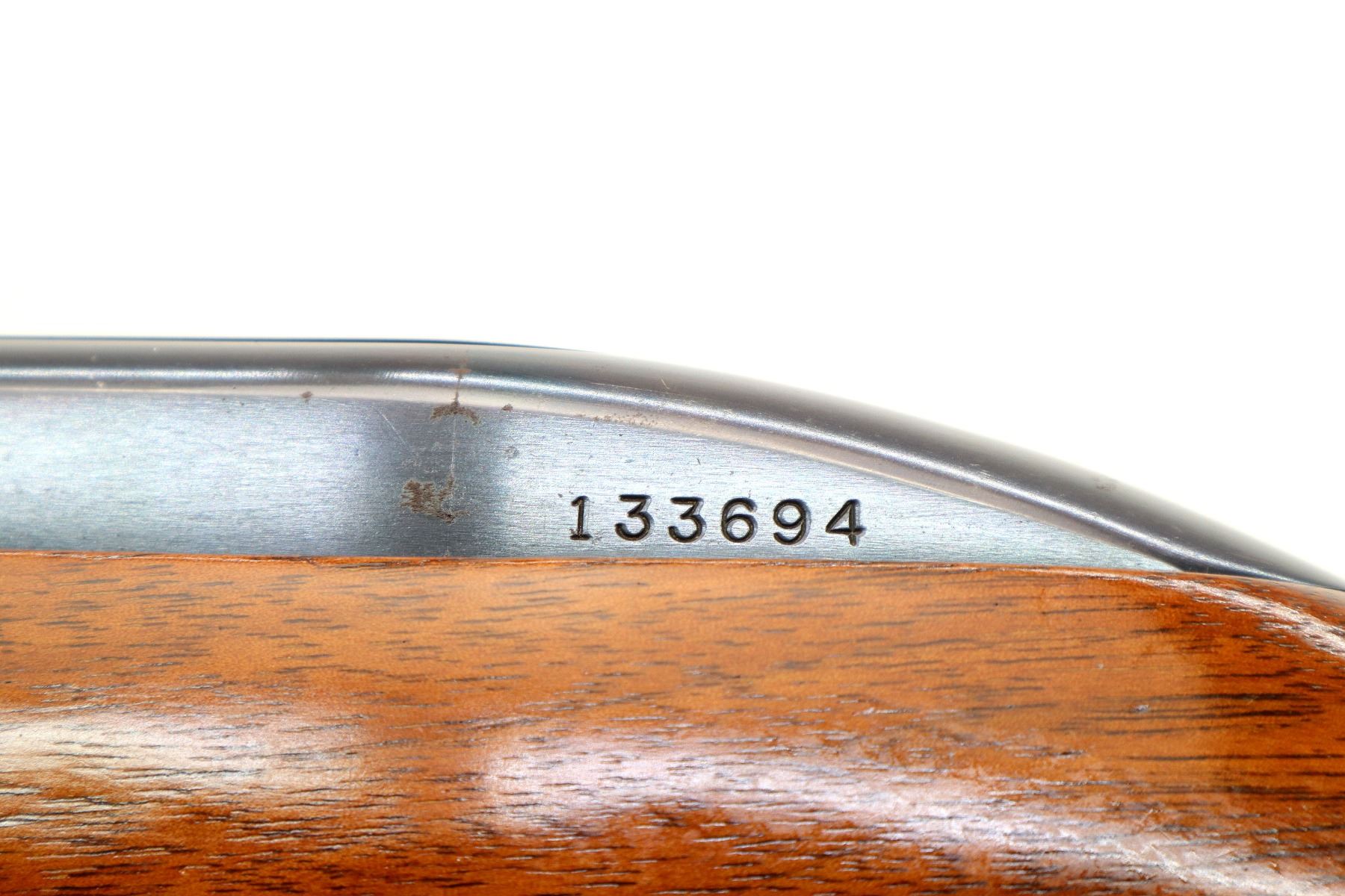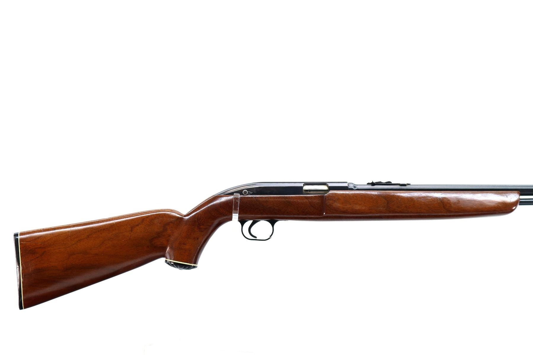 Main Description: Blade front sight, adjustable u notched rear sight, blued finish, grooved receiver. One piece wood stock, pistol grip, checkered black polymer butt plate, grip cap, trigger guard is cracked.