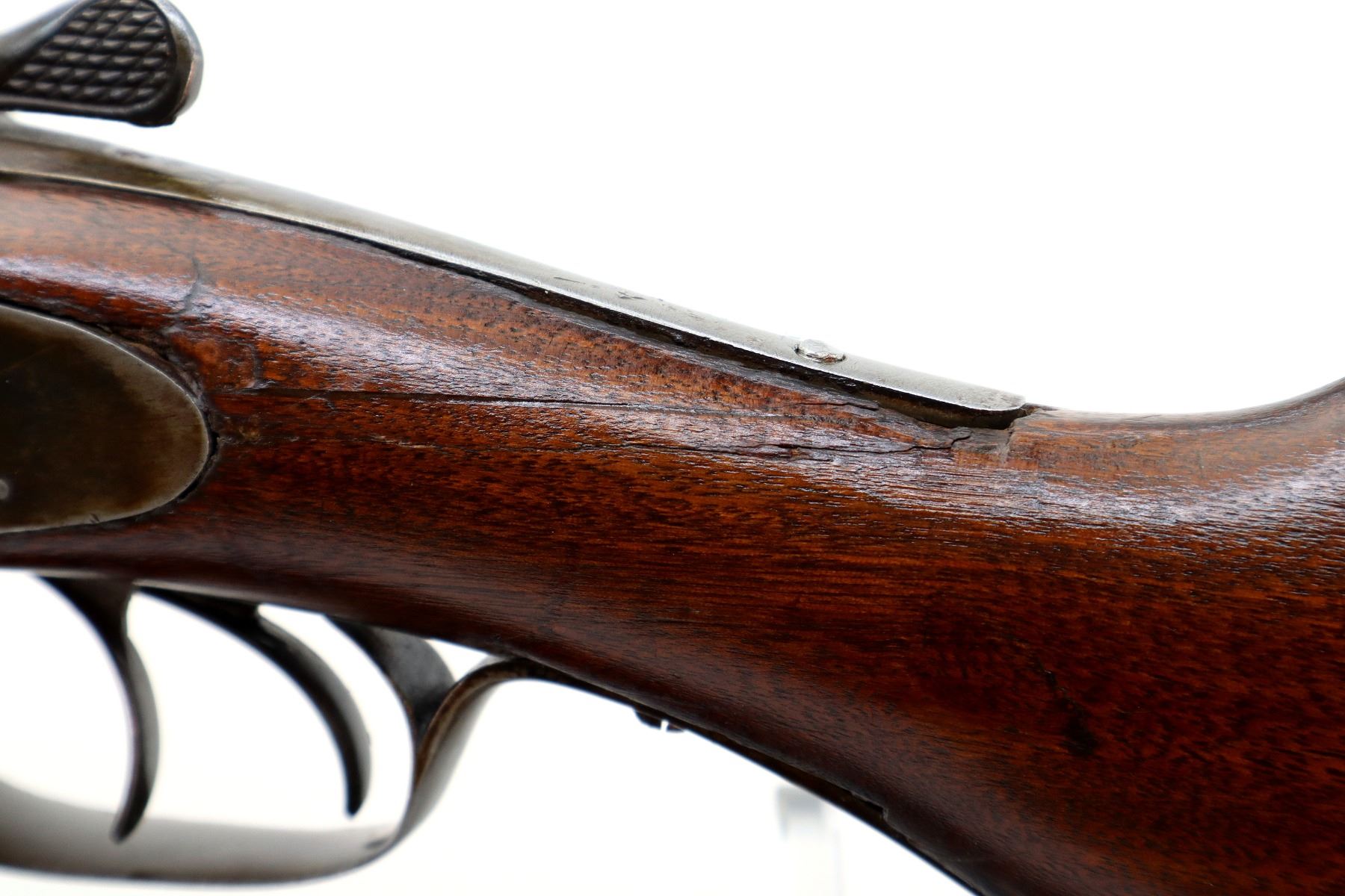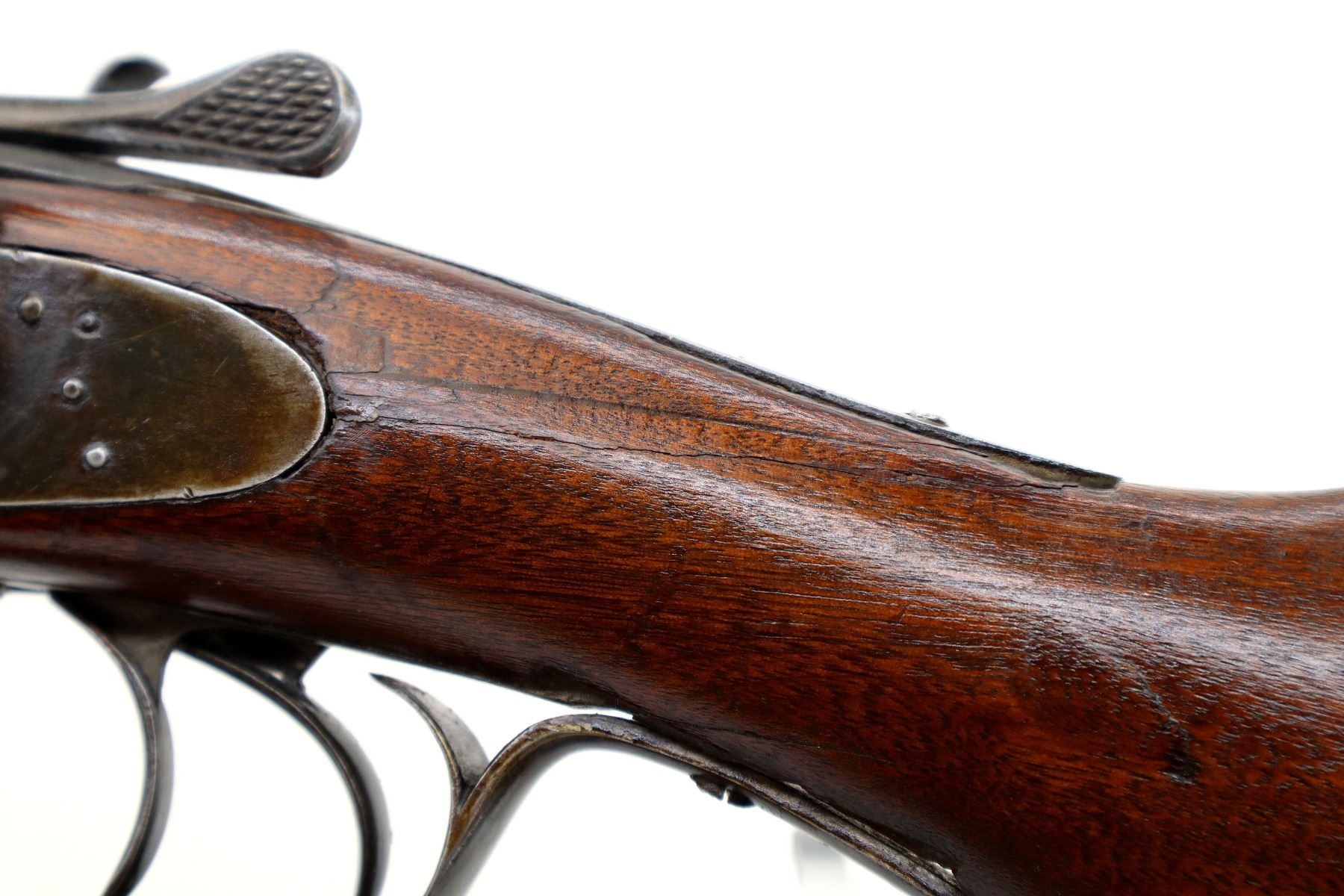 Main Description: Silver bead, barrels have some small dents with solid rib, side locks with checkered spur hammers that function, left side has a replaced screw, extractor, double triggers. Two piece wood stocks, forend has a Ebony tip, pistol grip chipped, cracked and broken behind receiver and locks, checkered black polymer butt plate.