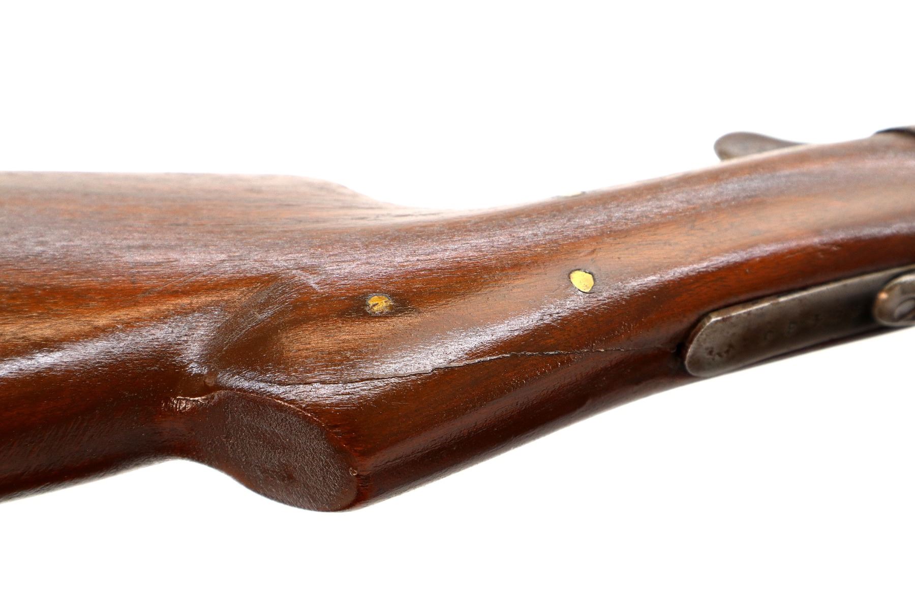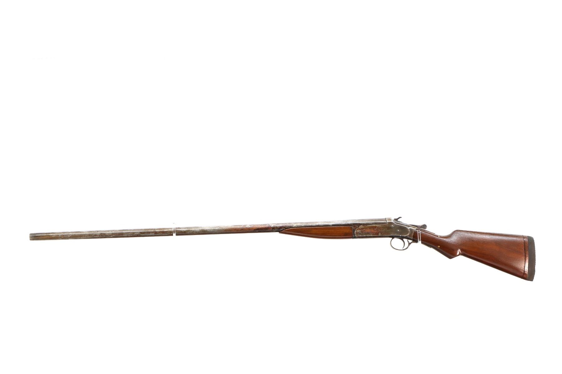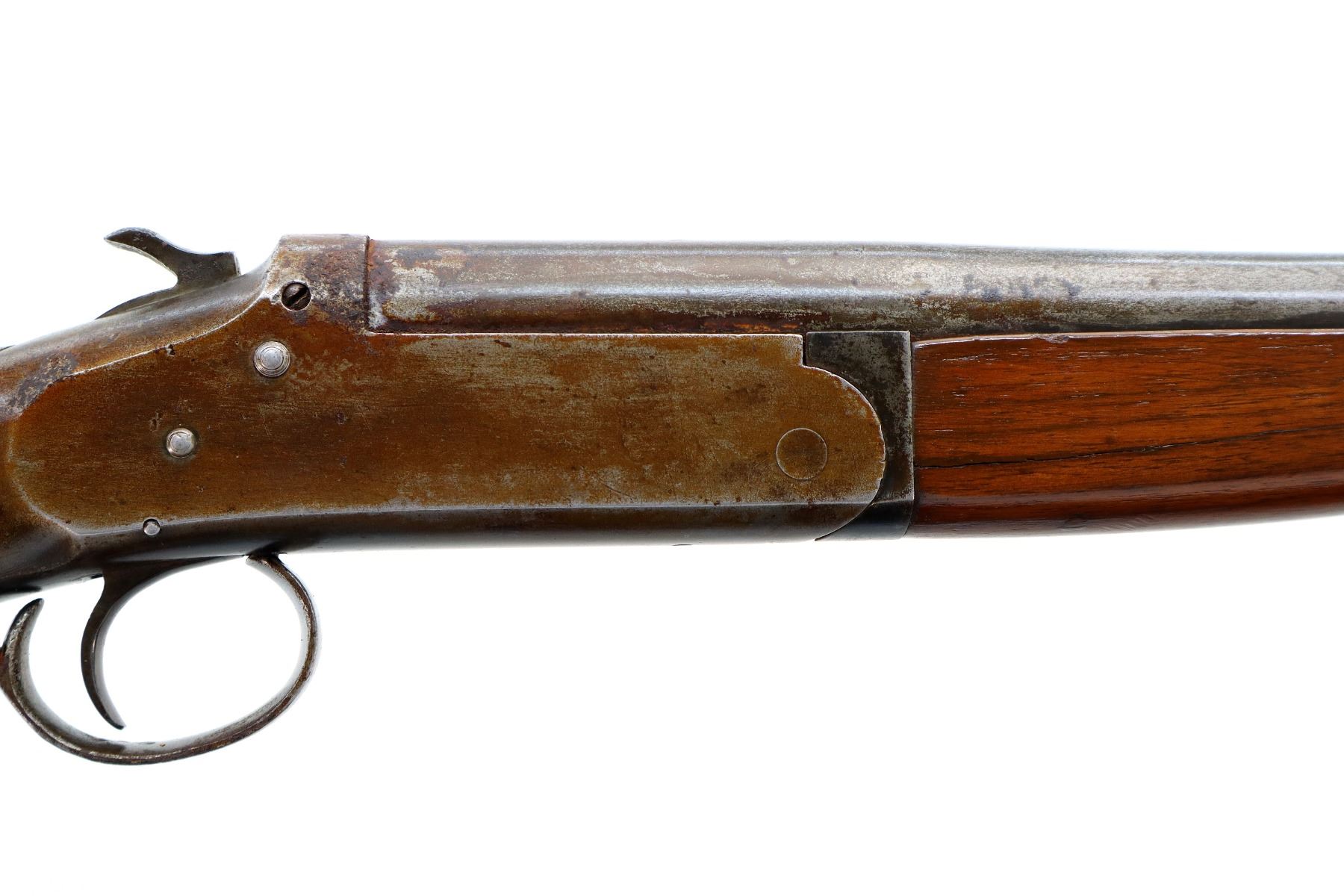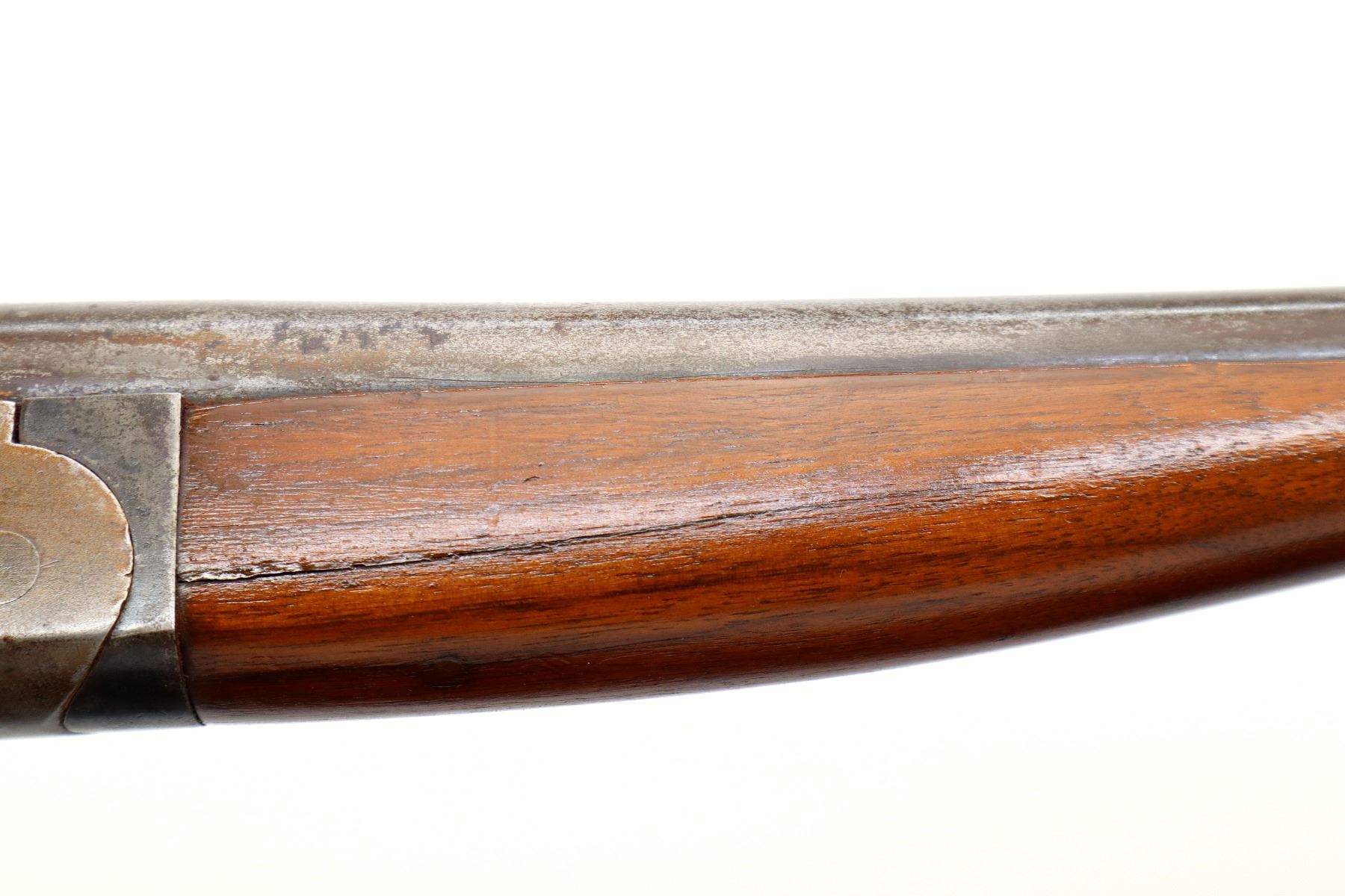 Main Description: Missing bead, threaded hole present, tapered round barrel, checkered spur hammer, extractor. Two piece wood stocks, forearm is cracked on both sides, pistol grip, chipped, cracked and repaired with brass pins, black rubber recoil pad with wood spacer, 13.75" LOP.