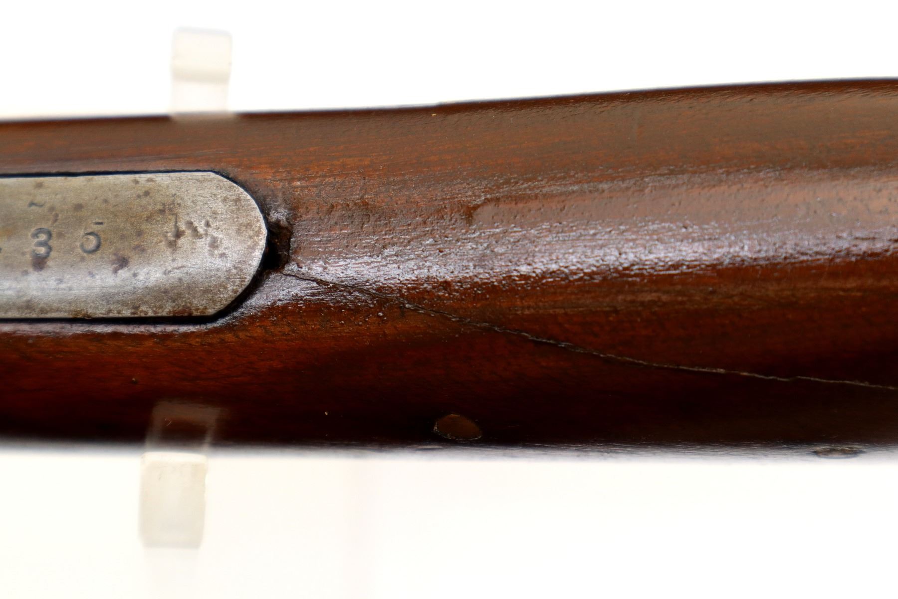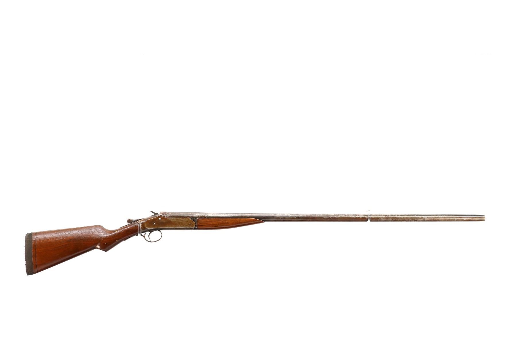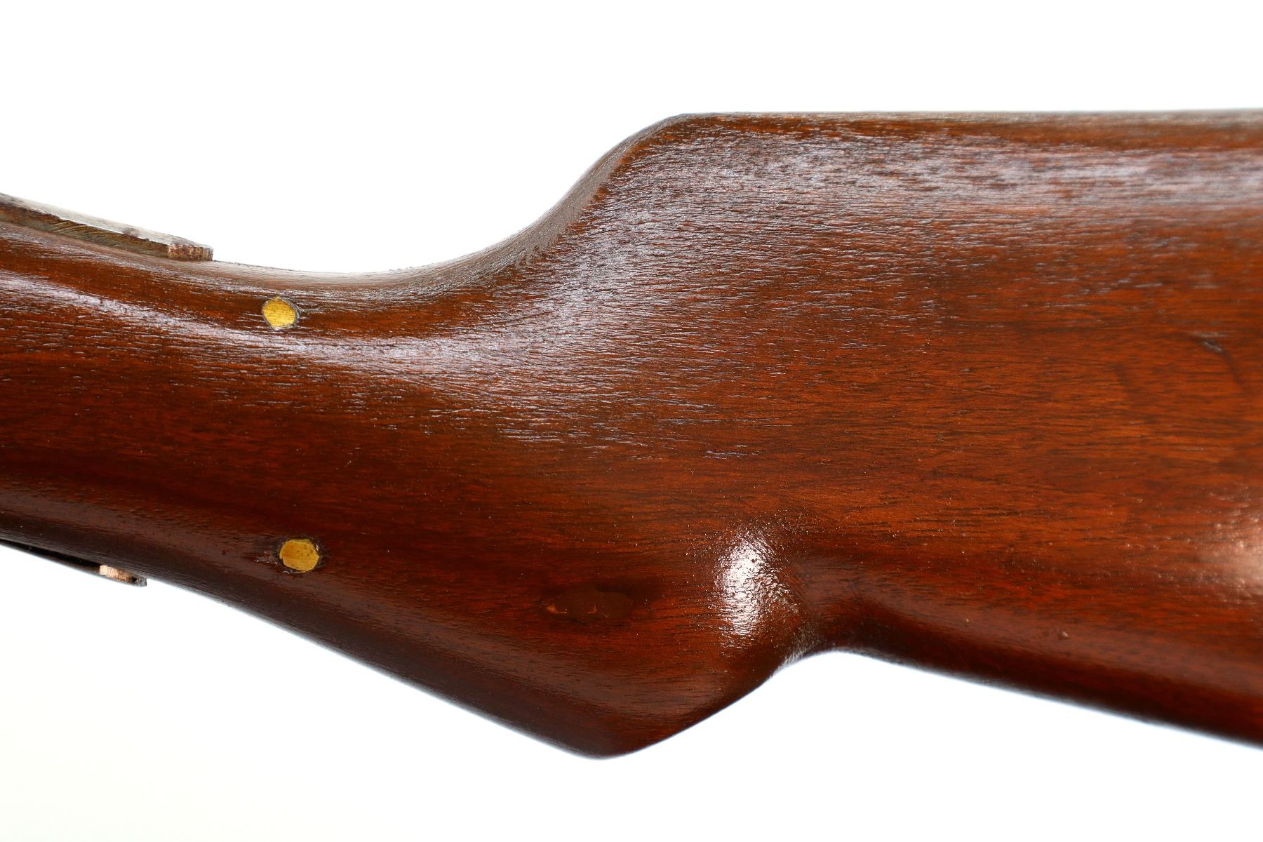 Main Description: Missing bead, threaded hole present, tapered round barrel, checkered spur hammer, extractor. Two piece wood stocks, forearm is cracked on both sides, pistol grip, chipped, cracked and repaired with brass pins, black rubber recoil pad with wood spacer, 13.75" LOP.