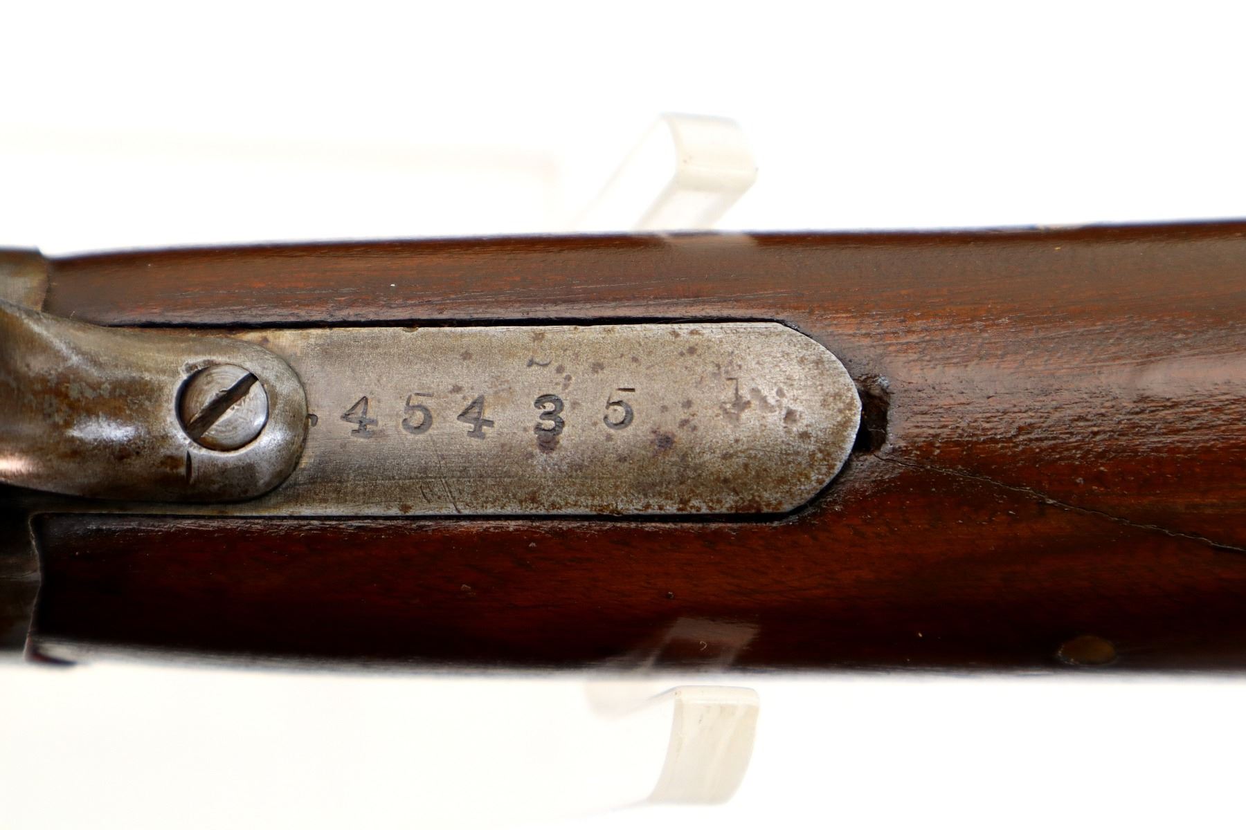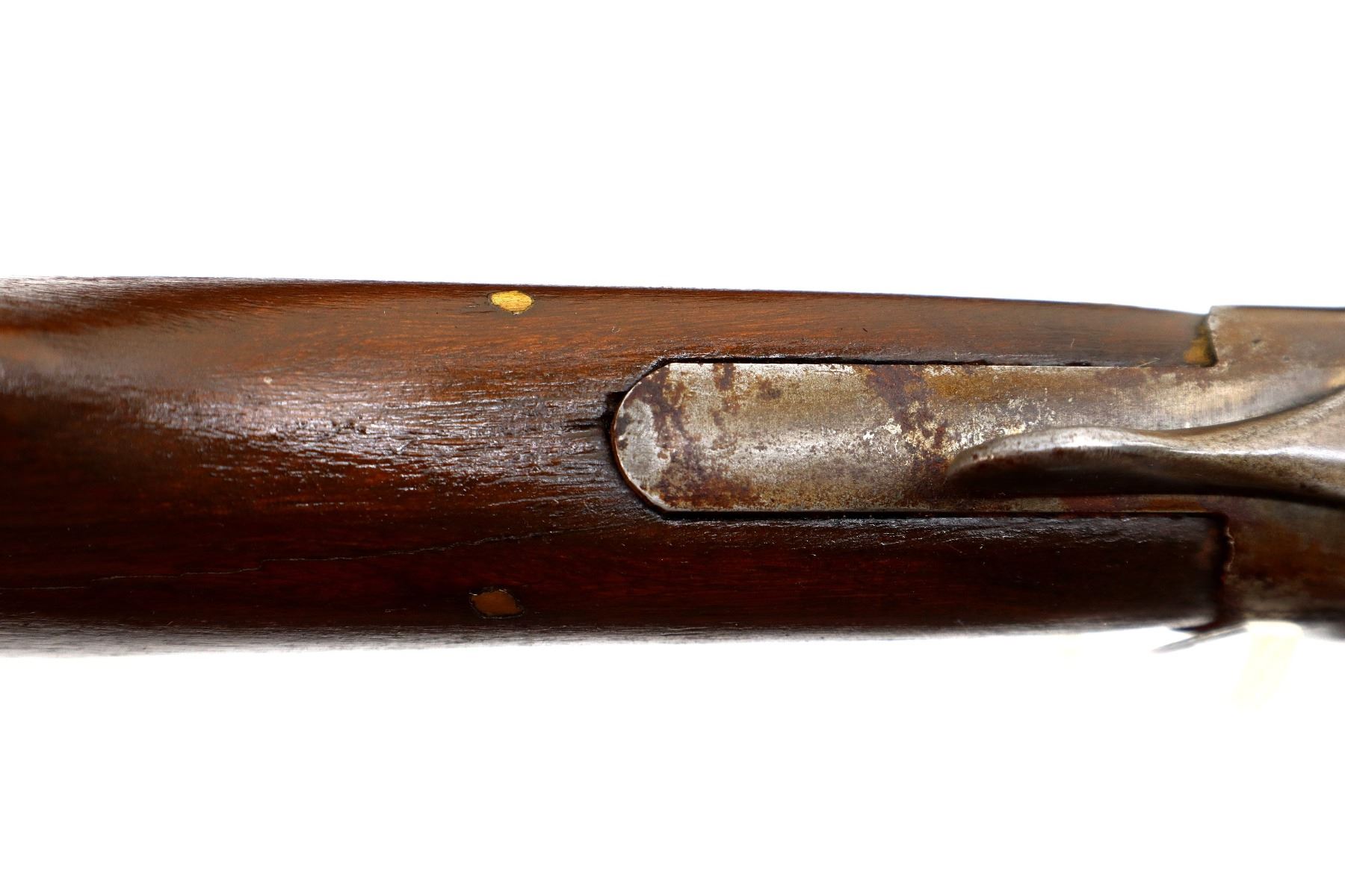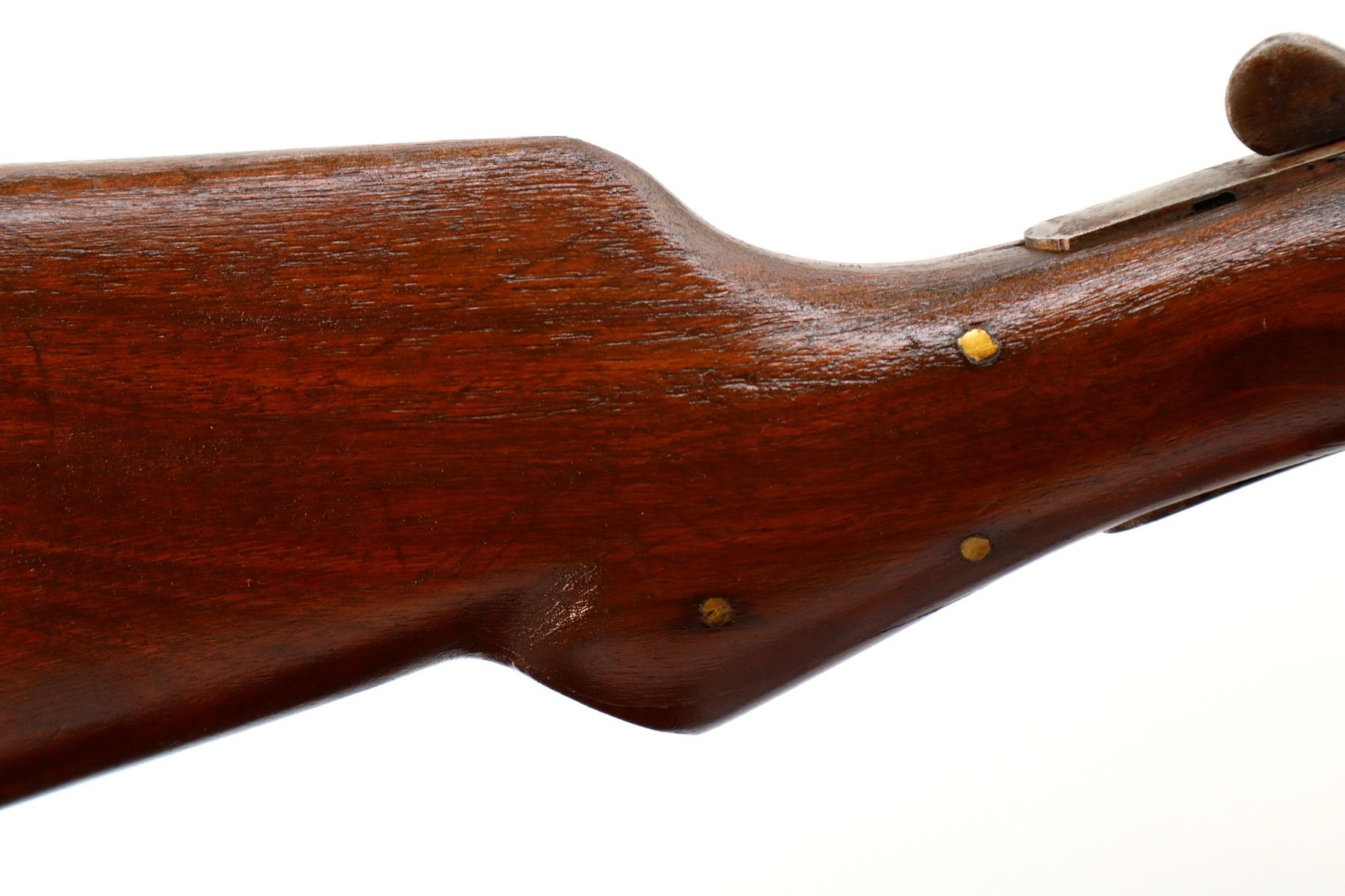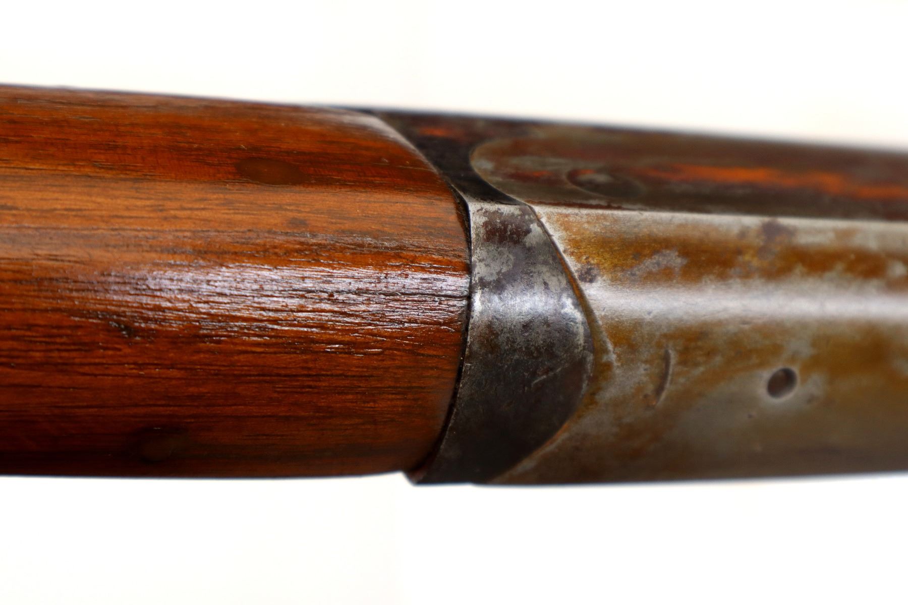 Main Description: Missing bead, threaded hole present, tapered round barrel, checkered spur hammer, extractor. Two piece wood stocks, forearm is cracked on both sides, pistol grip, chipped, cracked and repaired with brass pins, black rubber recoil pad with wood spacer, 13.75" LOP.