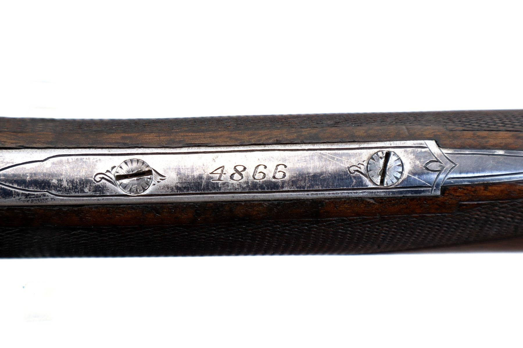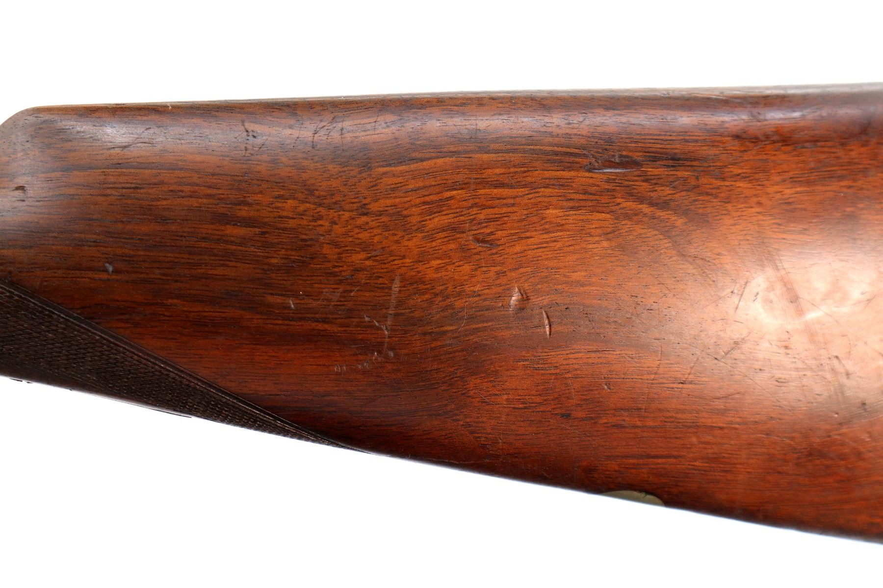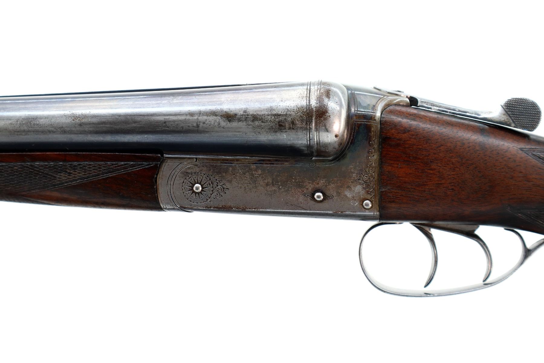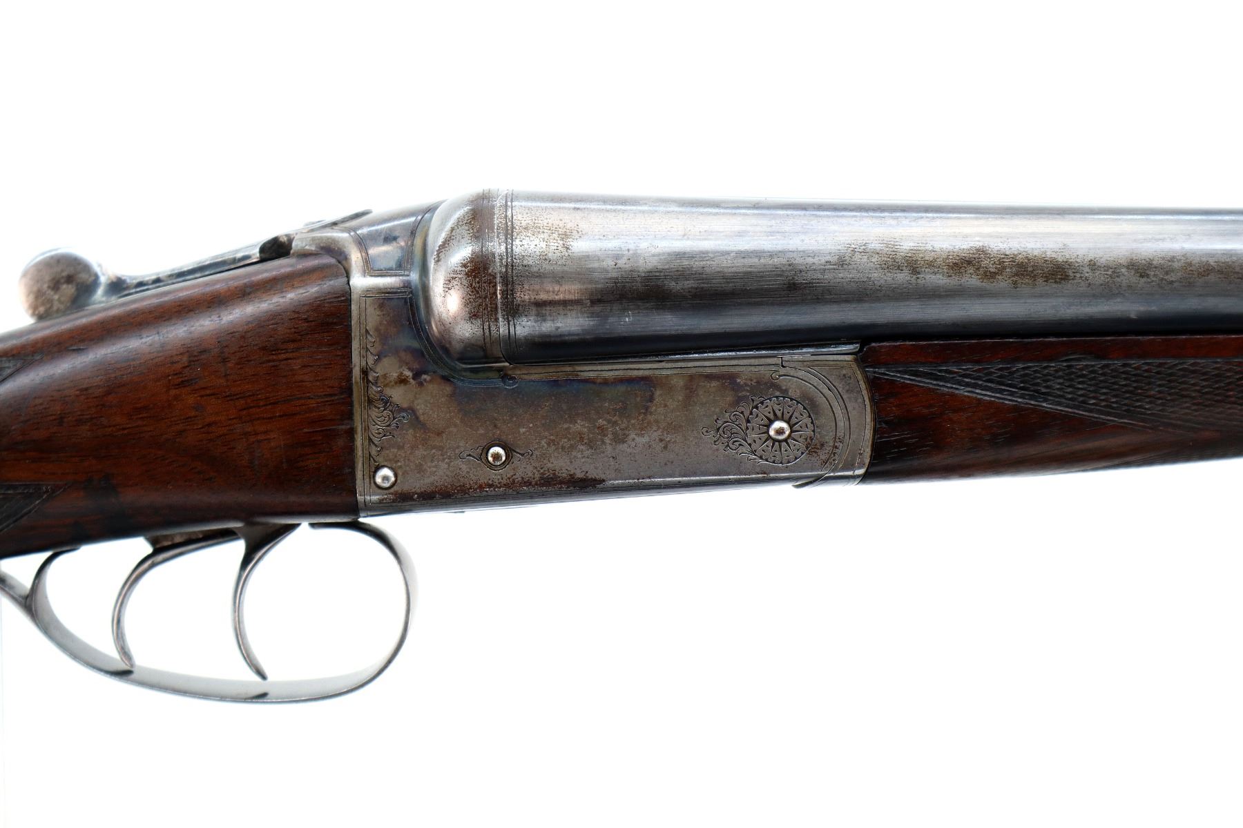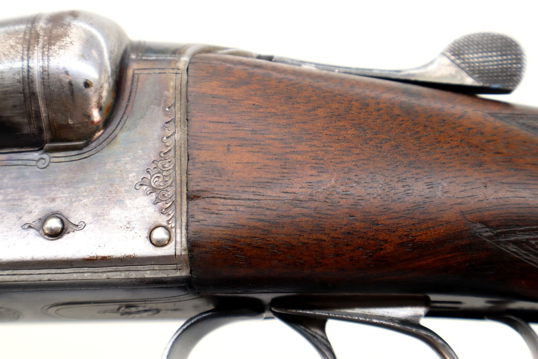 Main Description: Blued barrels with smooth rib that chime and are tight on face, border engraved colour case hardened receiver, automatic safety, extractor, double triggers. Note: opening lever requires repair or adjustment, slightly loose. Two piece wood stocks, checkered forearm and straight grip, stock cracked behind receiver, grooved butt, vanity plate