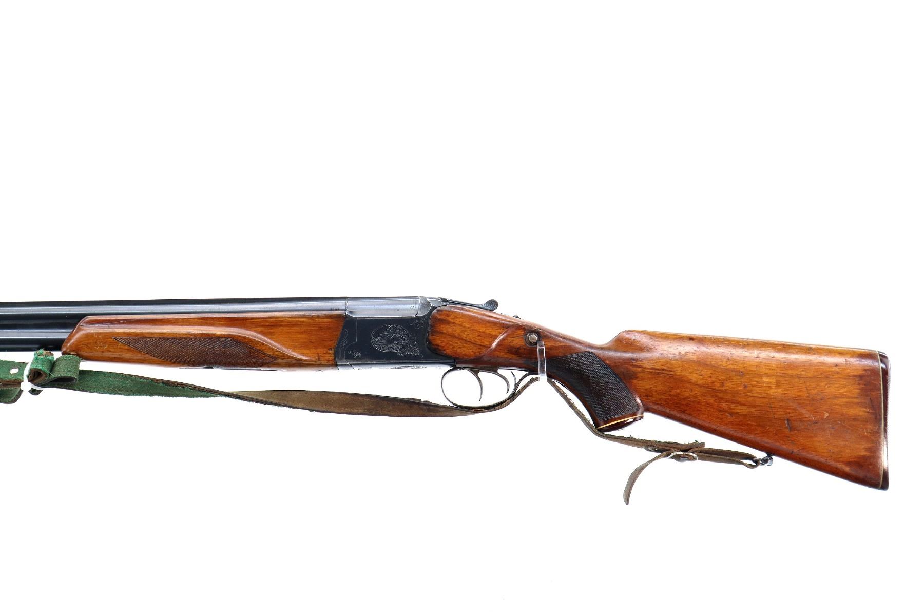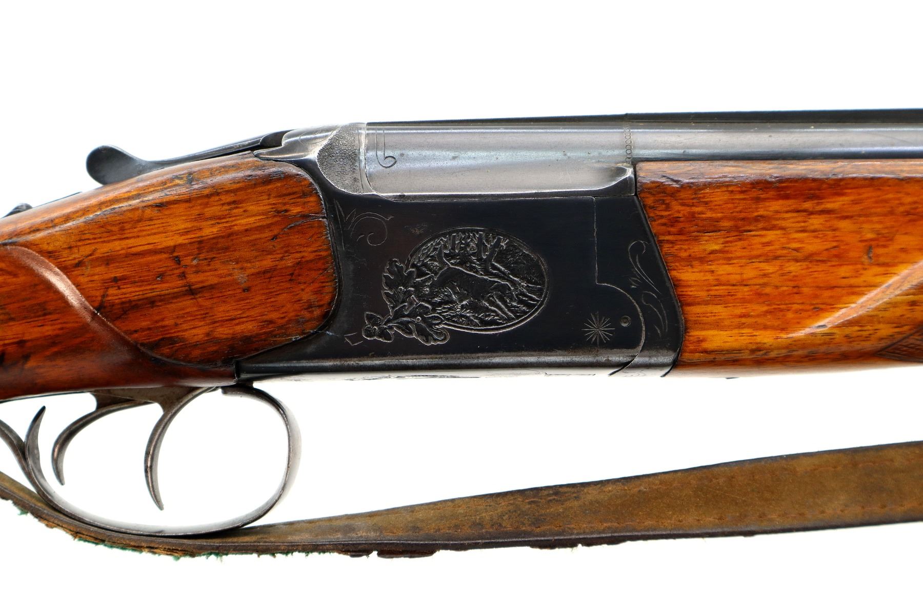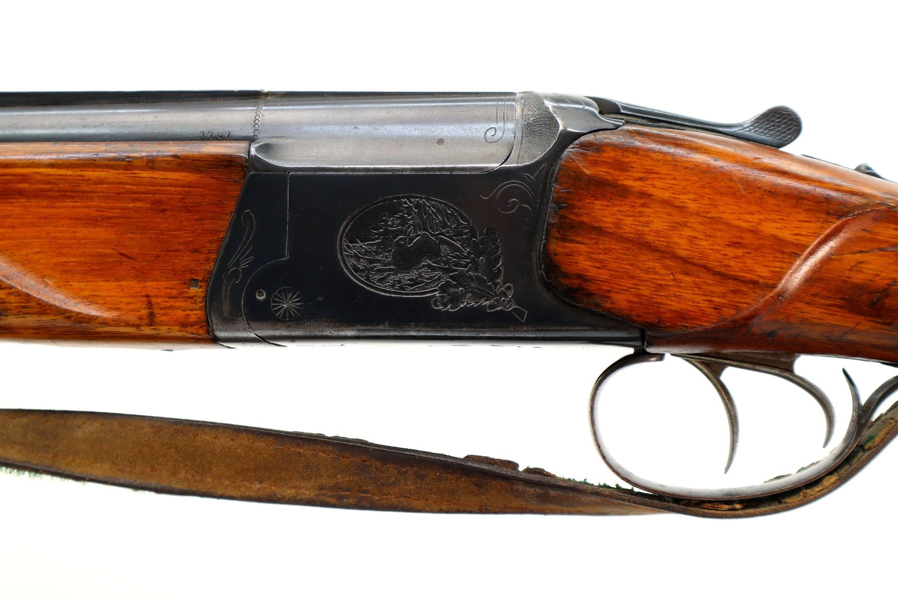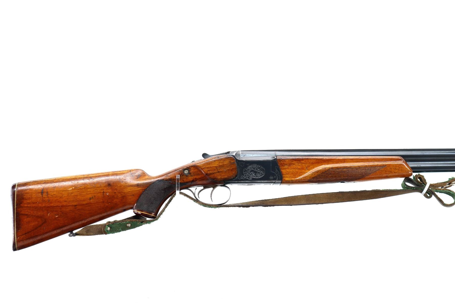 Main Description: Brass bead, blued finish, solid rib, engraved receiver, automatic safety, extractor, double triggers. Two piece wood stocks, checkered forearm which is cracked, checkered pistol grip chipped cracked and repaired with a bolt through wrist, grooved brown polymer butt plate, grip cap, sling swivels with green and brown leather sling.