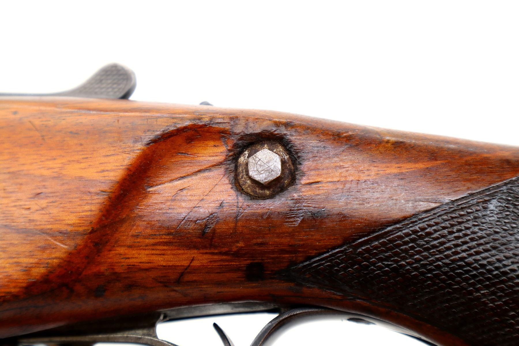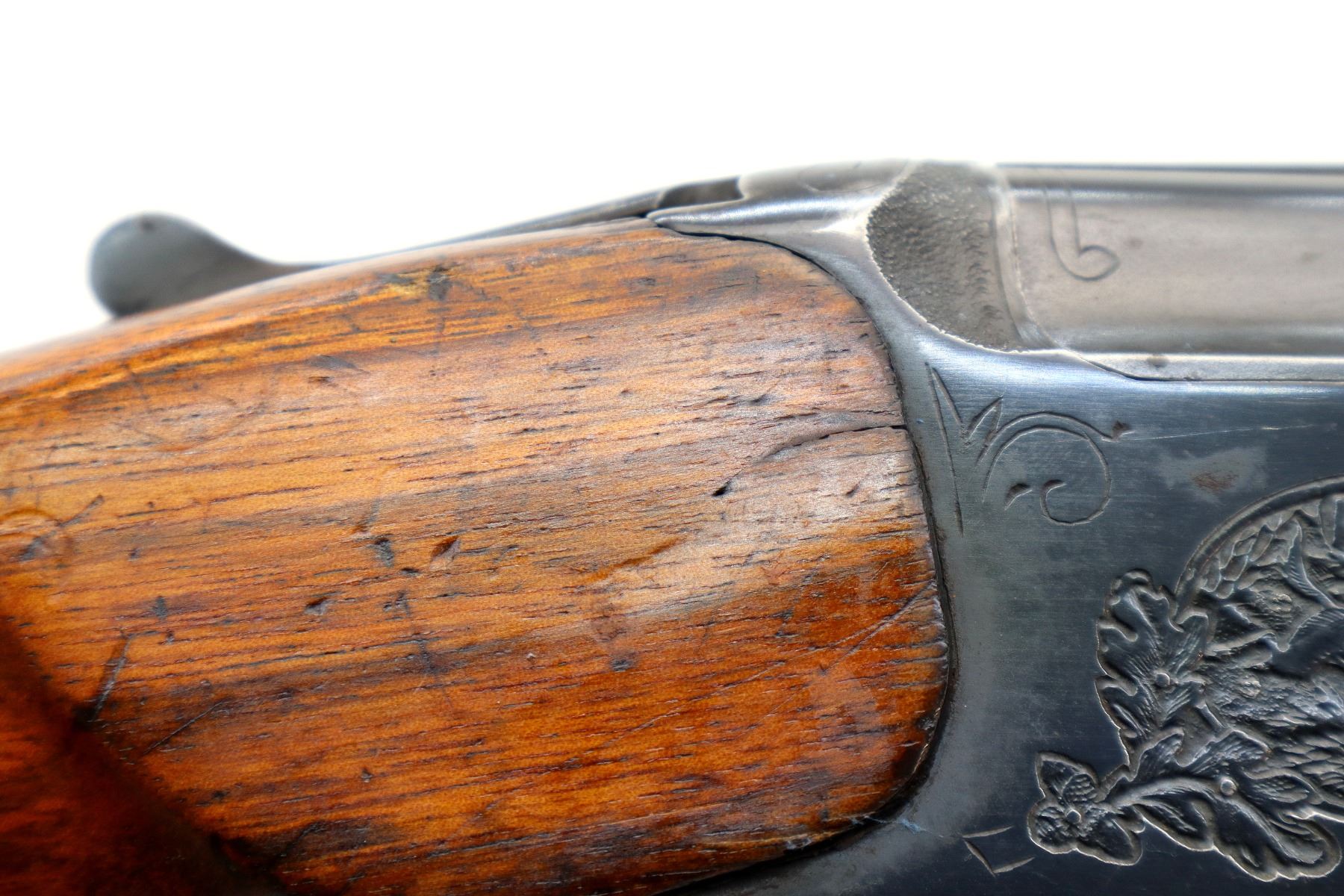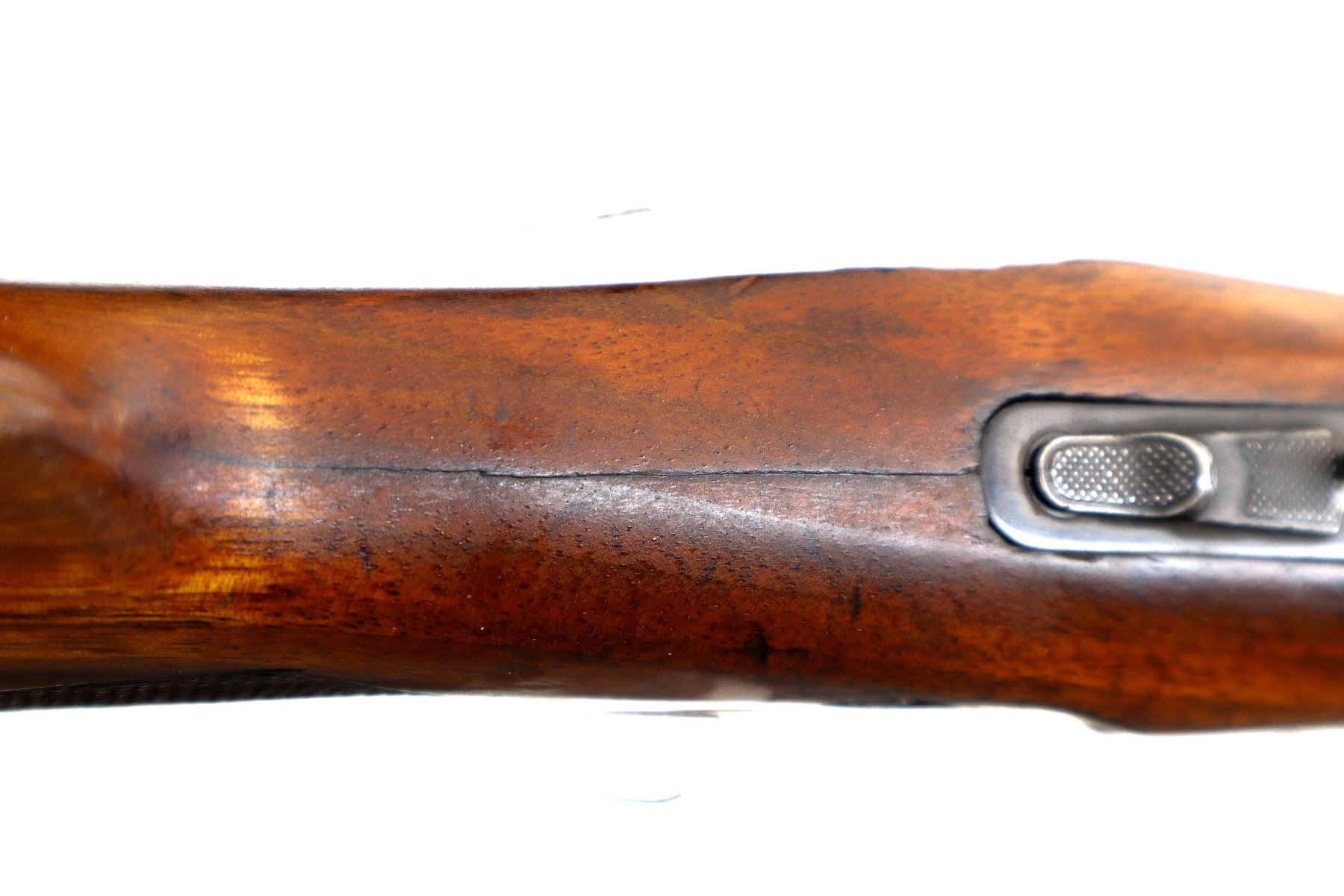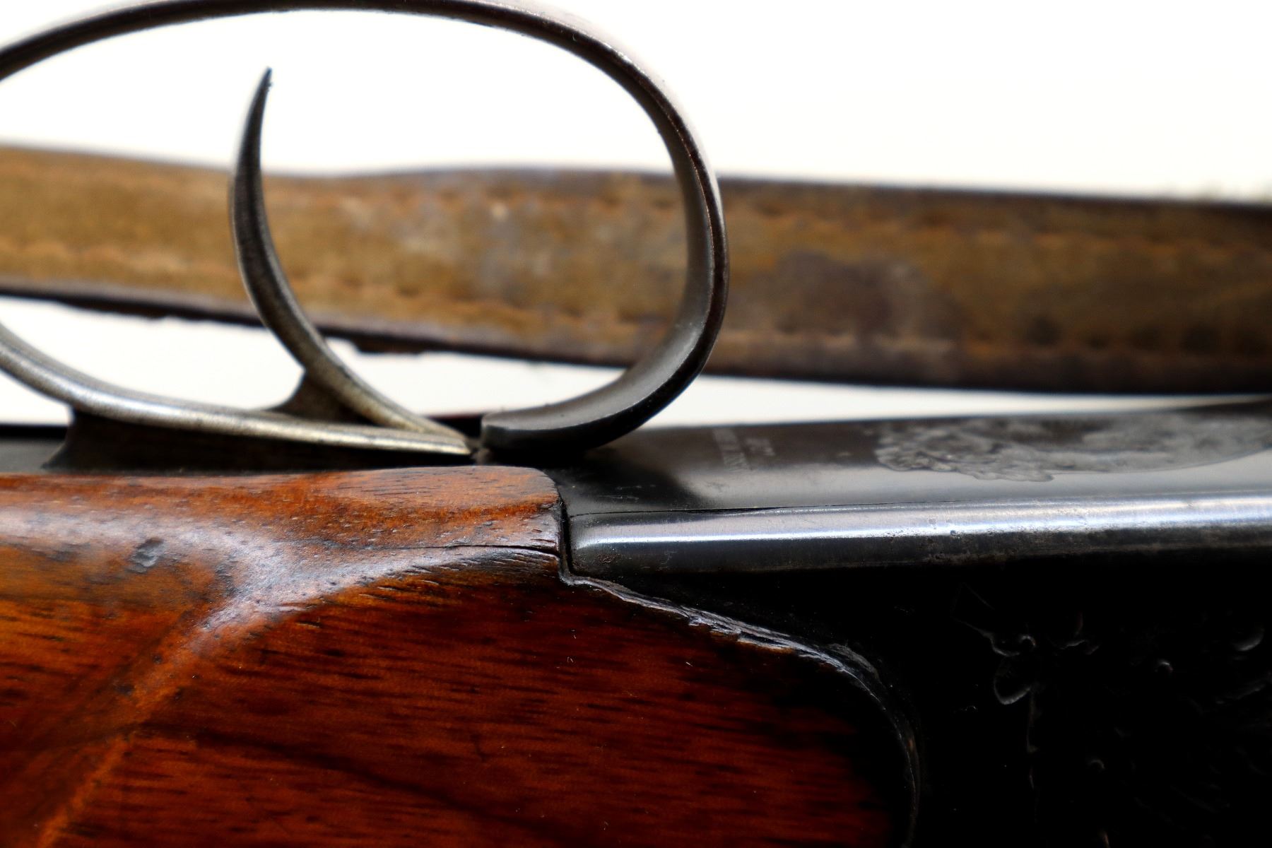 Main Description: Brass bead, blued finish, solid rib, engraved receiver, automatic safety, extractor, double triggers. Two piece wood stocks, checkered forearm which is cracked, checkered pistol grip chipped cracked and repaired with a bolt through wrist, grooved brown polymer butt plate, grip cap, sling swivels with green and brown leather sling.