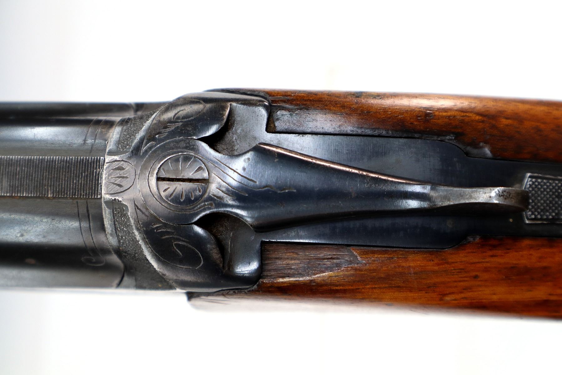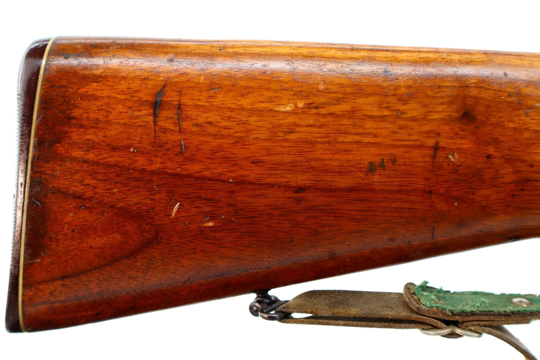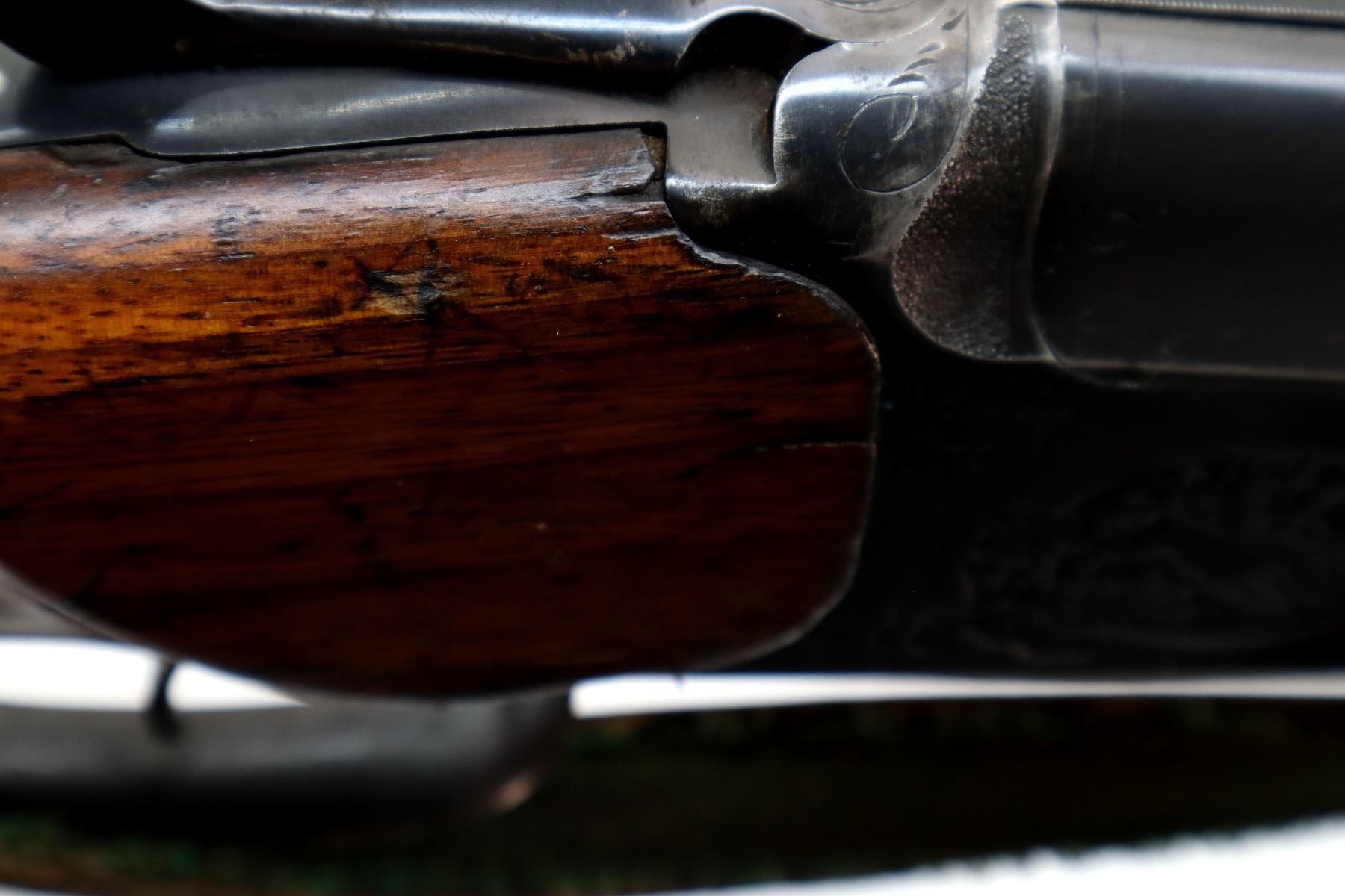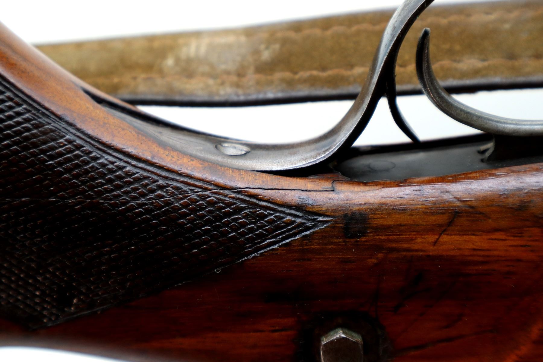 Main Description: Brass bead, blued finish, solid rib, engraved receiver, automatic safety, extractor, double triggers. Two piece wood stocks, checkered forearm which is cracked, checkered pistol grip chipped cracked and repaired with a bolt through wrist, grooved brown polymer butt plate, grip cap, sling swivels with green and brown leather sling.