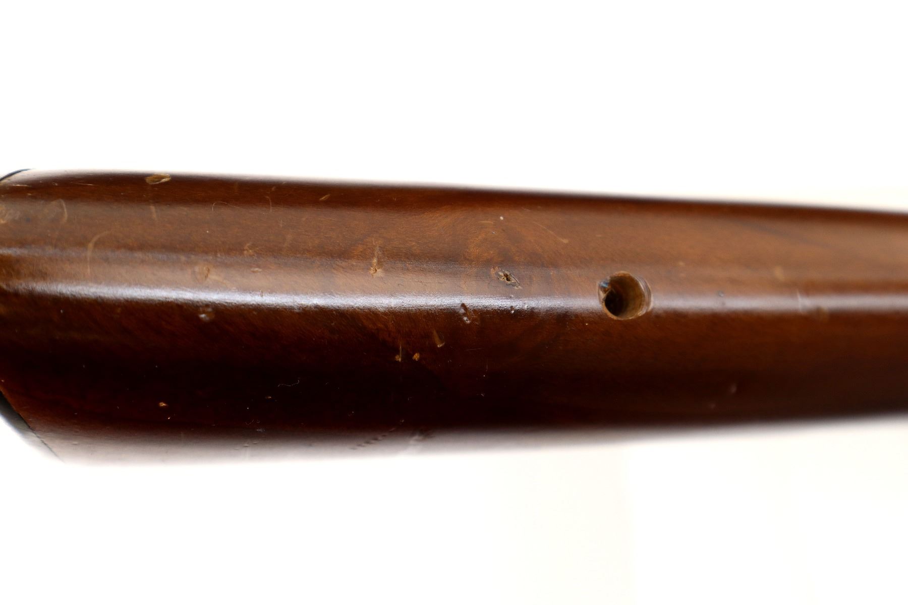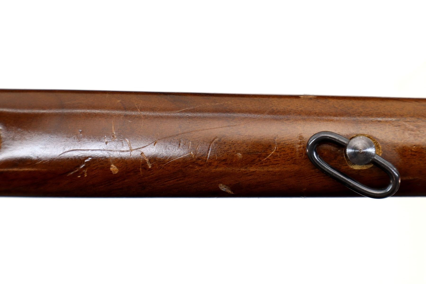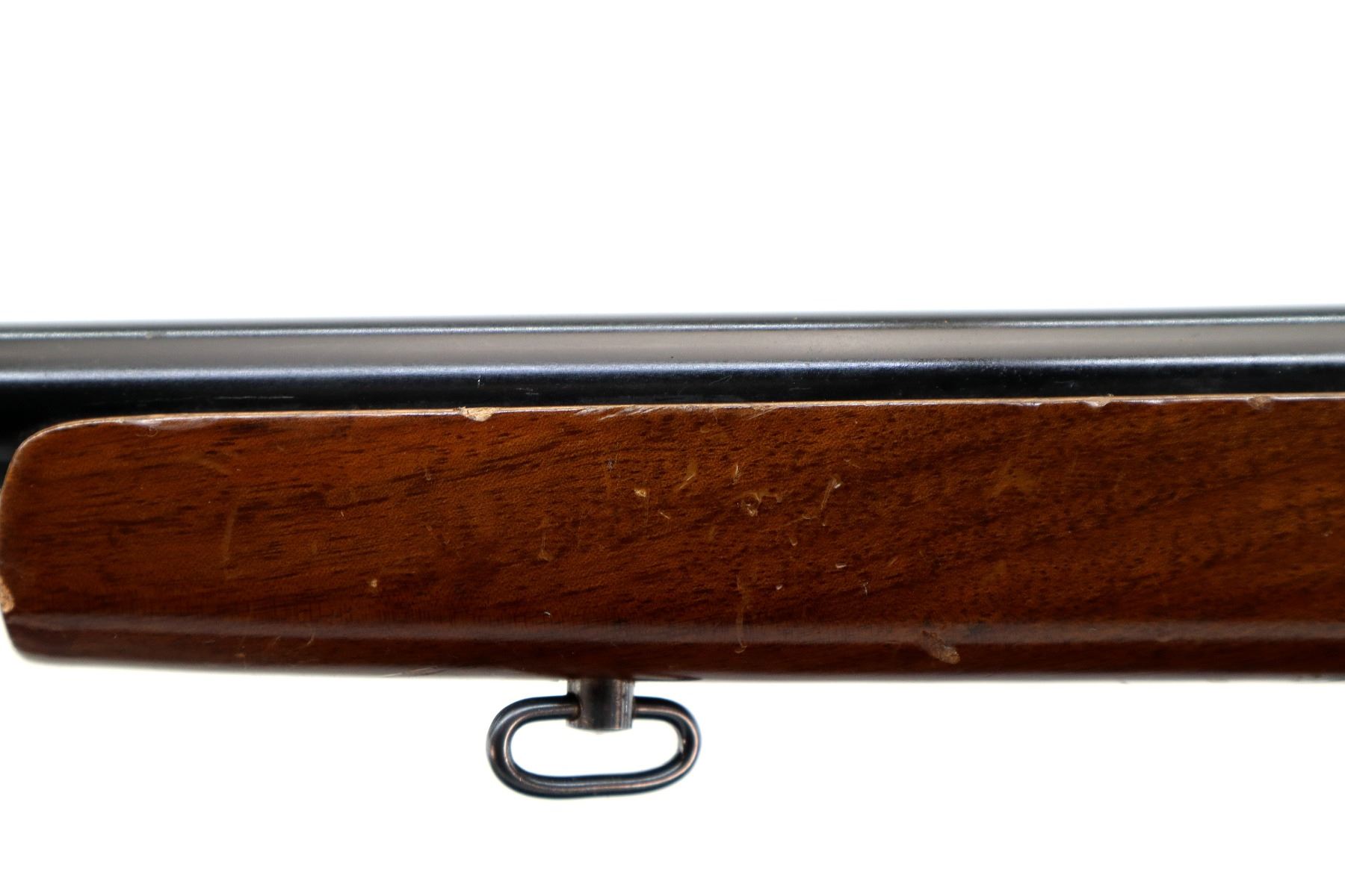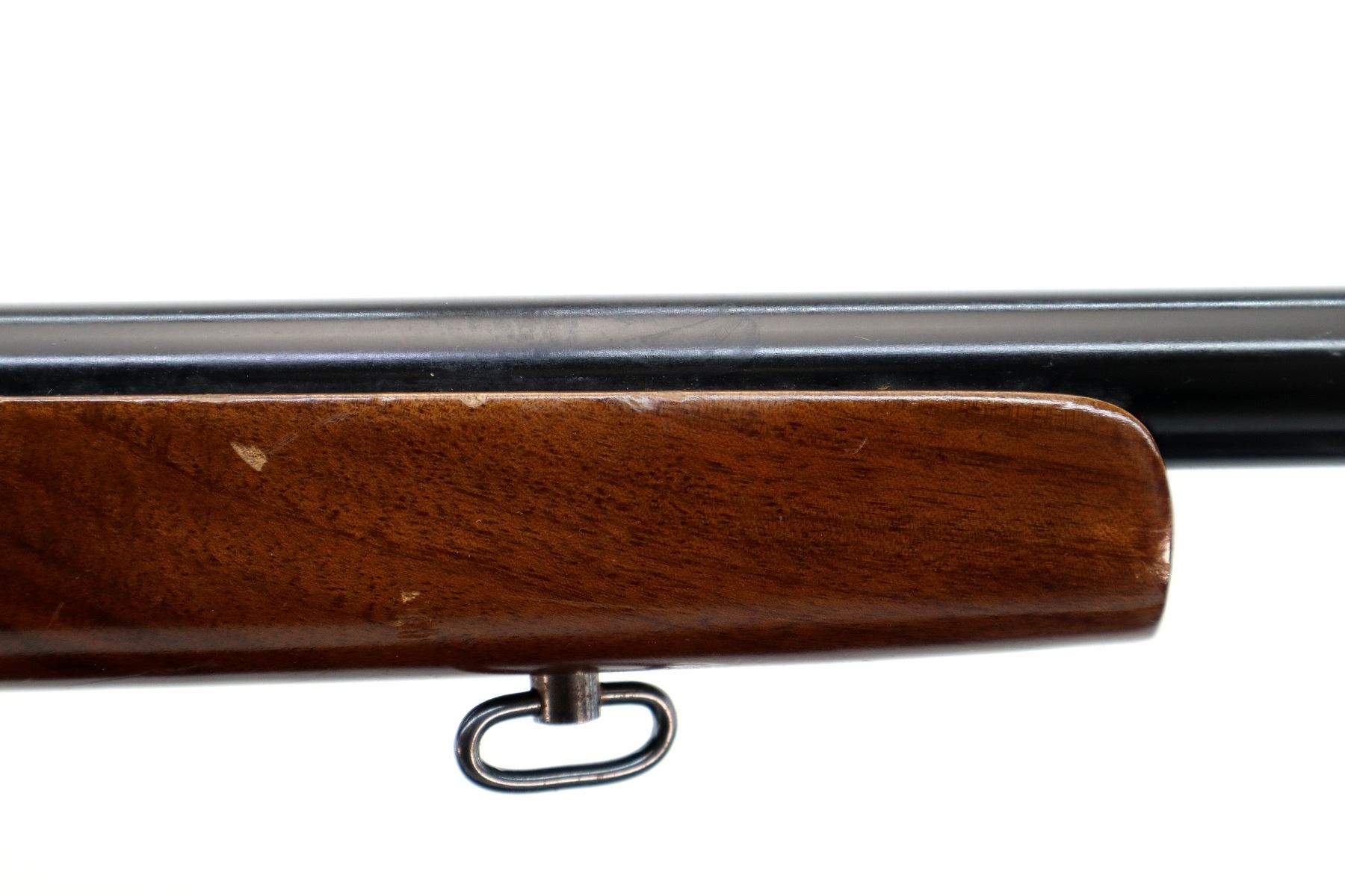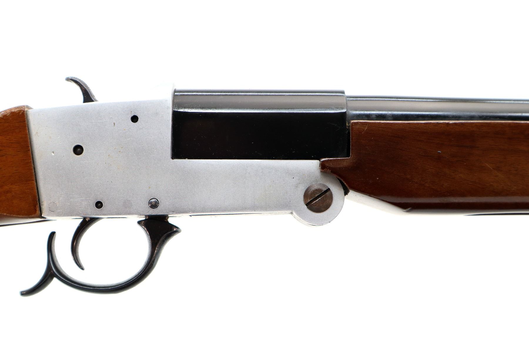Main Description: Brass bead, blued round barrel, silver receiver, grooved spur hammer, extractor which does not function, trigger guard opens action and is loose. Two piece wood stocks, checkered pistol grip, black polymer butt plate. Missing rear swivel hole is present, has front swivel.