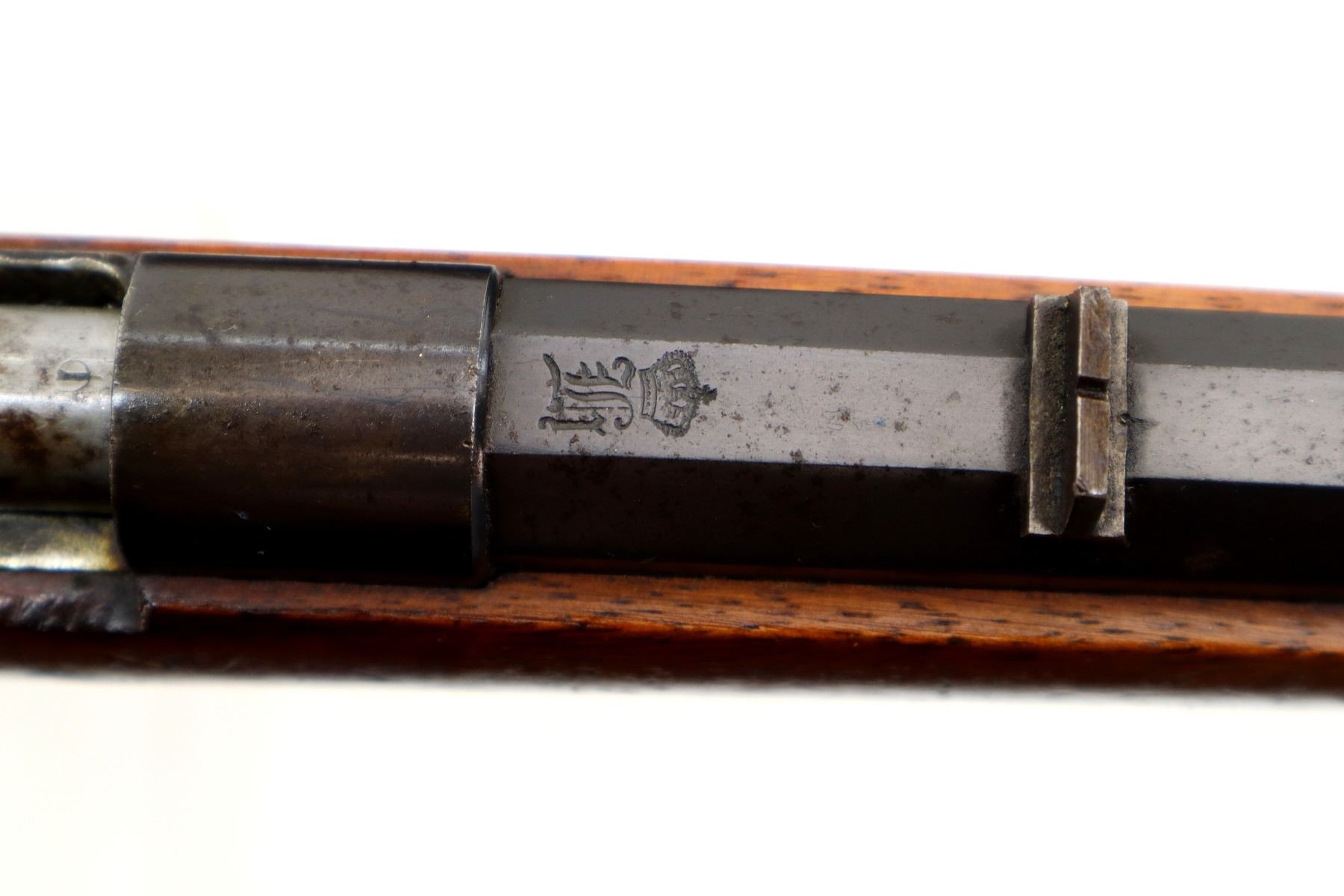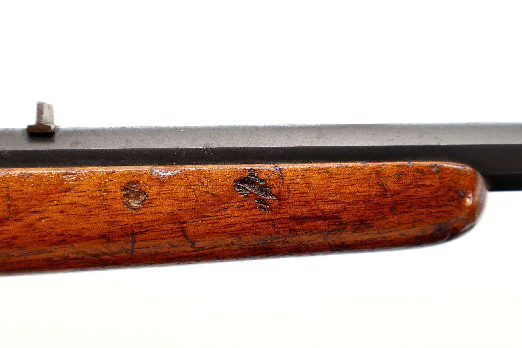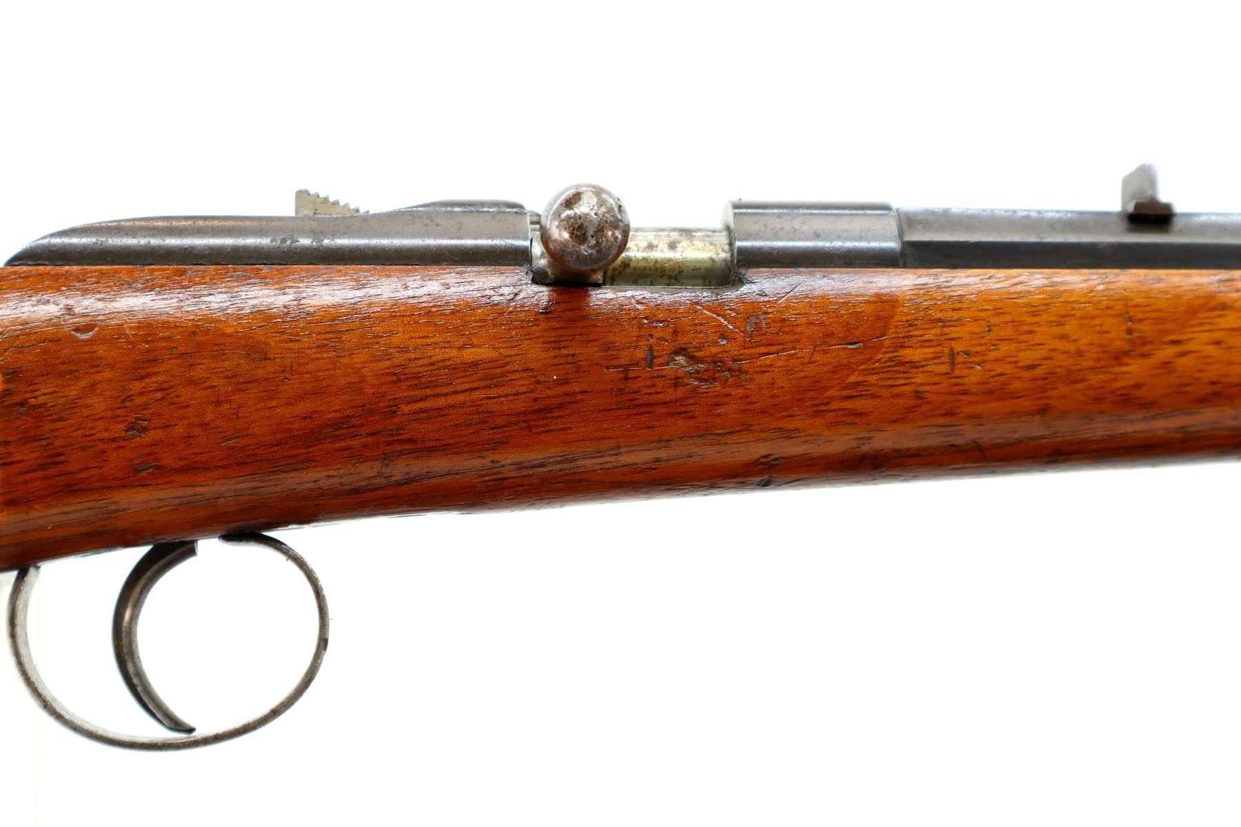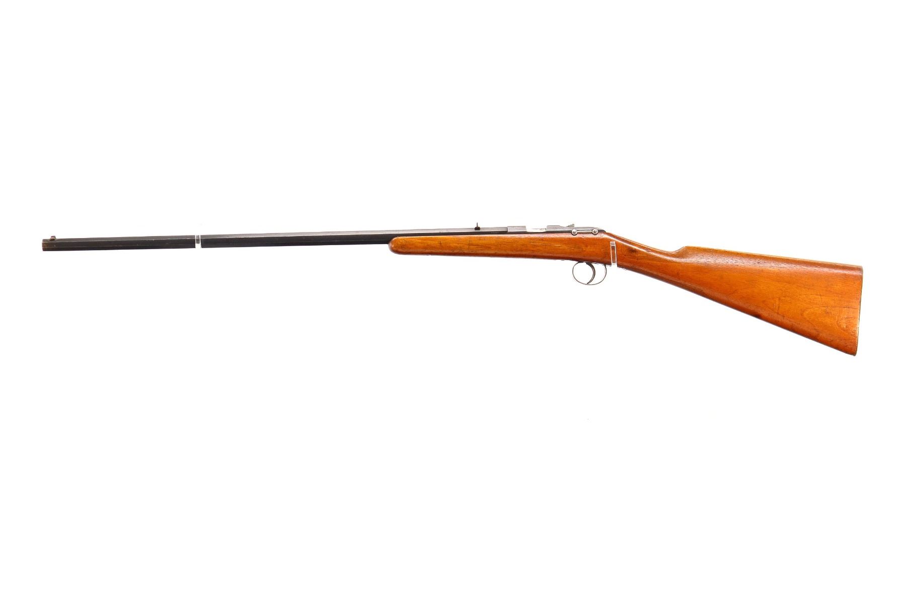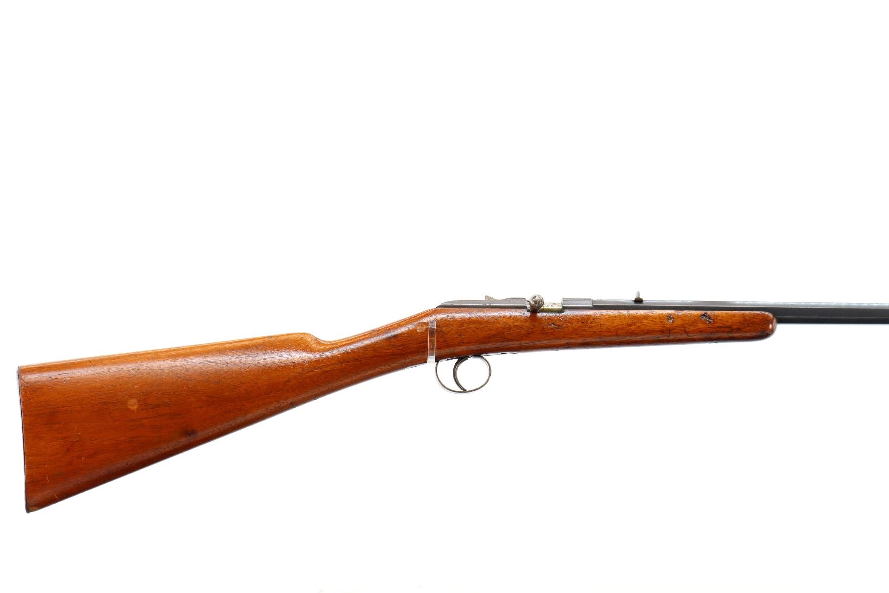 Main Description: Blade front sight, u notched rear sight, blued finish, octagon barrel, straight bolt handle, extractor is present. One piece wood stock, straight grip, smooth steel butt plate, stock chipped at toe.