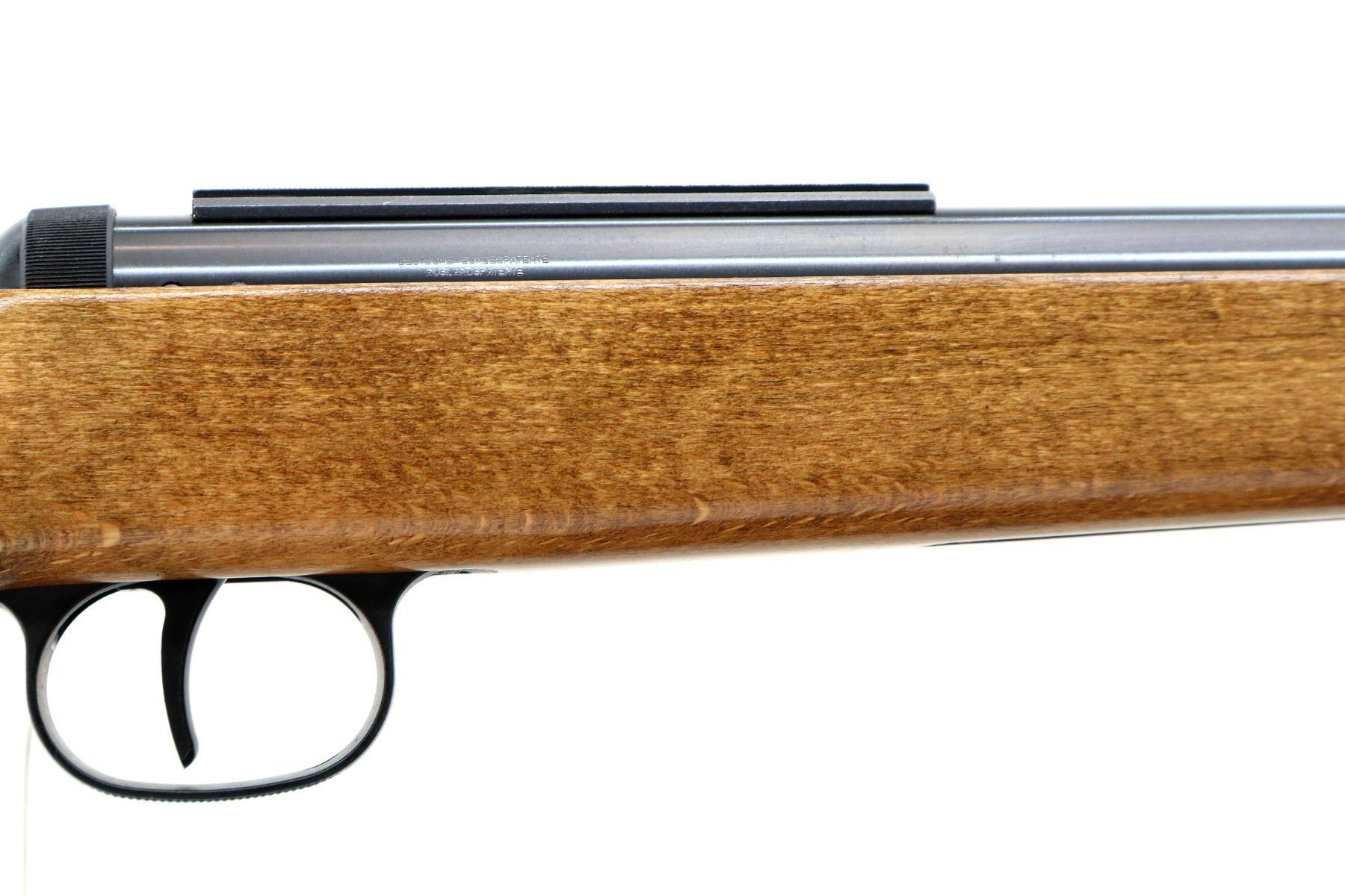 Main Description: Missing front and rear sights, threaded holes present, blued finish, receiver drilled and tapped with one piece scope base installed. One piece wood stock, forearm is cracked and repaired, pistol grip, grooved black polymer butt plate.